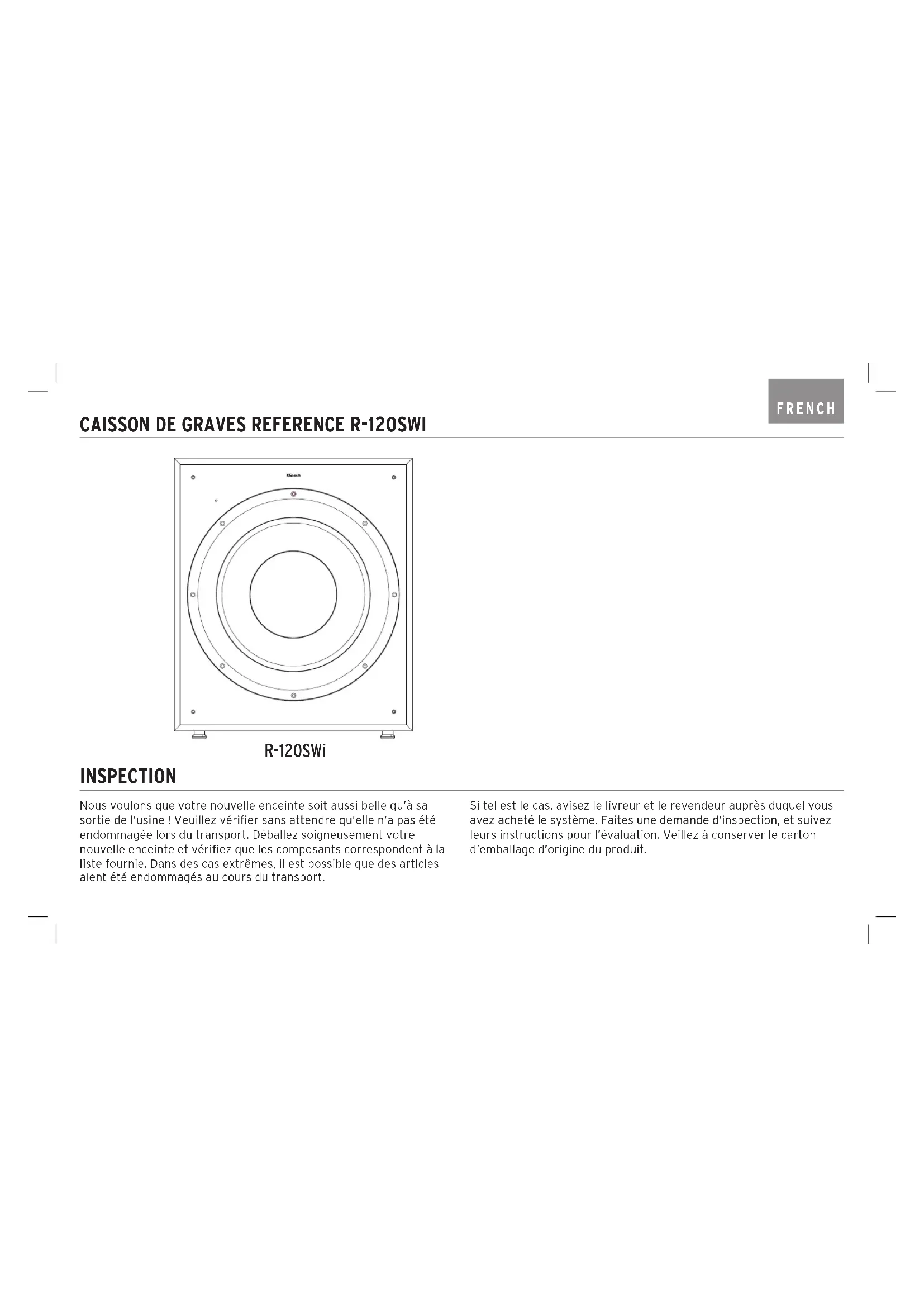 - This registration information is not used for warranty purposes. Please retain your receipt for warranty claims. PRODUCT REGISTRATIONFRENCH Nous voulons que votre nouvelle enceinte soit aussi belle qu’à sa sortie de l’usine ! Veuillez vérifier sans attendre qu’elle n’a pas été endommagée lors du transport. Déballez soigneusement votre nouvelle enceinte et vérifiez que les composants correspondent à la liste fournie. Dans des cas extrêmes, il est possible que des articles aient été endommagés au cours du transport. Si tel est le cas, avisez le livreur et le revendeur auprès duquel vous avez acheté le système. Faites une demande d’inspection, et suivez leurs instructions pour l’évaluation. Veillez à conserver le carton d’emballage d’origine du produit. INSPECTION