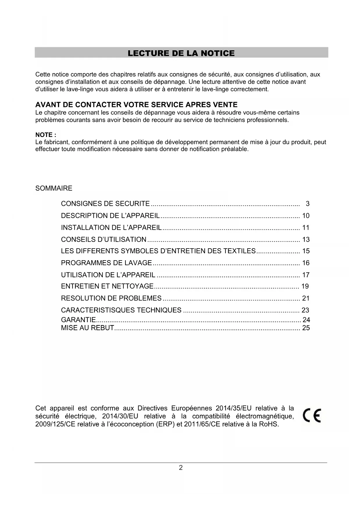 Cette notice comporte des chapitres relatifs aux consignes de sécurité, aux consignes d’utilisation, aux consignes d’installation et aux conseils de dépannage. Une lecture attentive de cette notice avant d’utiliser le lave-linge vous aidera à utiliser er à entretenir le lave-linge correctement. AVANT DE CONTACTER VOTRE SERVICE APRES VENTE Le chapitre concernant les conseils de dépannage vous aidera à résoudre vous-même certains problèmes courants sans avoir besoin de recourir au service de techniciens professionnels. NOTE : Le fabricant, conformément à une politique de développement permanent de mise à jour du produit, peut effectuer toute modification nécessaire sans donner de notification préalable. SOMMAIRE