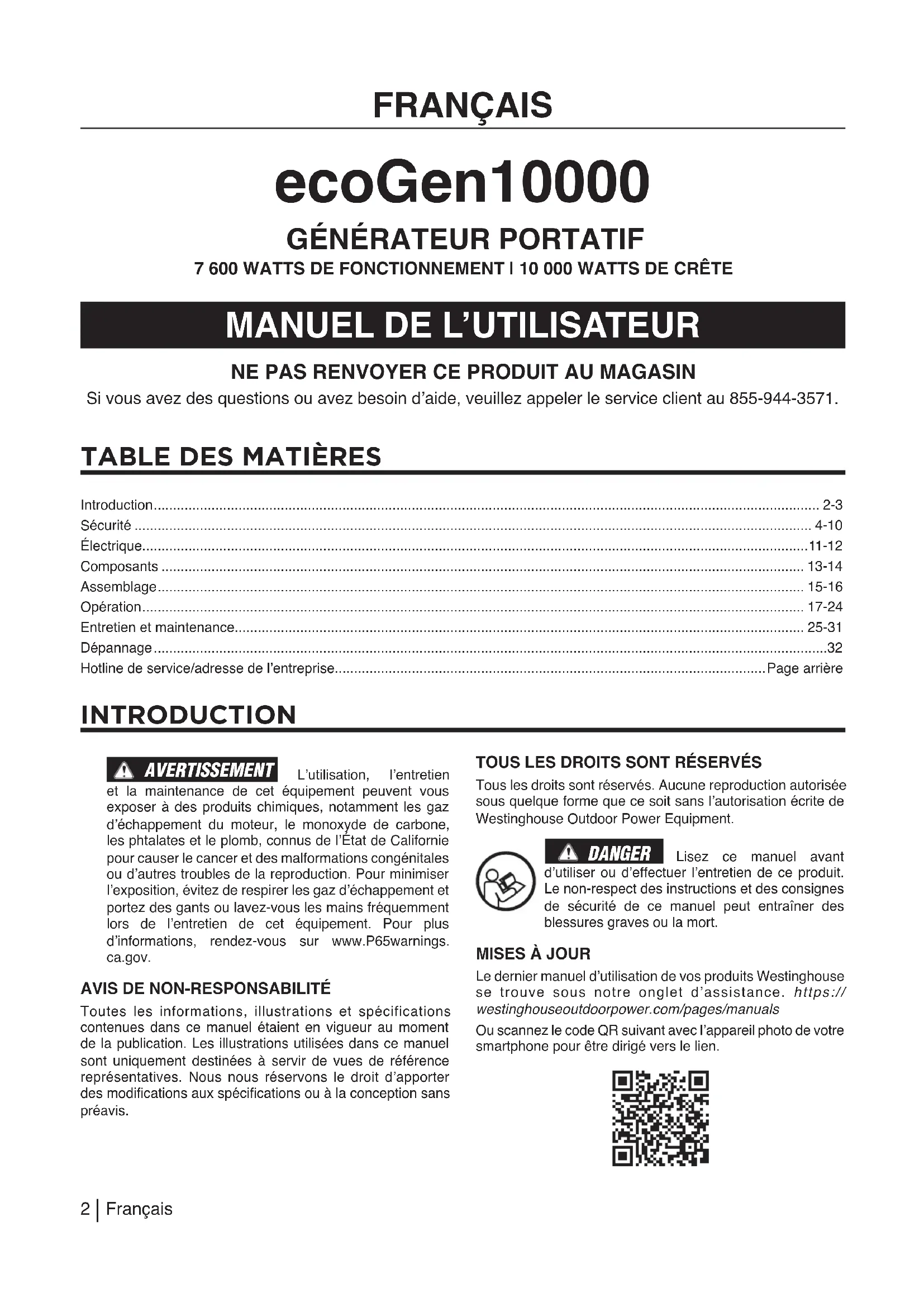 INTRODUCTION AVERTISSEMENT L’utilisation, l’entretien et la maintenance de cet équipement peuvent vous exposer à des produits chimiques, notamment les gaz d’échappement du moteur, le monoxyde de carbone, les phtalates et le plomb, connus de l’État de Californie pour causer le cancer et des malformations congénitales ou d’autres troubles de la reproduction. Pour minimiser l’exposition, évitez de respirer les gaz d’échappement et portez des gants ou lavez-vous les mains fréquemment lors de l’entretien de cet équipement. Pour plus d’informations, rendez-vous sur www.P65warnings.ca.gov. AVIS DE NON-RESPONSABILITÉToutes les informations, illustrations et spécifications contenues dans ce manuel étaient en vigueur au moment de la publication. Les illustrations utilisées dans ce manuel sont uniquement destinées à servir de vues de référence représentatives. Nous nous réservons le droit d’apporter des modications aux spécications ou à la conception sans préavis.TOUS LES DROITS SONT RÉSERVÉSTous les droits sont réservés. Aucune reproduction autorisée sous quelque forme que ce soit sans l’autorisation écrite de Westinghouse Outdoor Power Equipment. DANGER Lisez ce manuel avant d’utiliser ou d’effectuer l’entretien de ce produit. Le non-respect des instructions et des consignes de sécurité de ce manuel peut entraîner des blessures graves ou la mort.MISES À JOURLe dernier manuel d’utilisation de vos produits Westinghouse se trouve sous notre onglet d’assistance. https://westinghouseoutdoorpower.com/pages/manualsOu scannez le code QR suivant avec l’appareil photo de votre smartphone pour être dirigé vers le lien. Introduction ............................................................................................................................................................................. 2-3 Sécurité ................................................................................................................................................................................ 4-10 Électrique.............................................................................................................................................................................11-12 Composants ....................................................................................................................................................................... 13-14 Assemblage ........................................................................................................................................................................ 15-16 Opération ............................................................................................................................................................................ 17-24 Entretien et maintenance.................................................................................................................................................... 25-31 Dépannage ...............................................................................................................................................................................32 Hotline de service/adresse de l’entreprise................................................................................................................Page arrière ecoGen10000