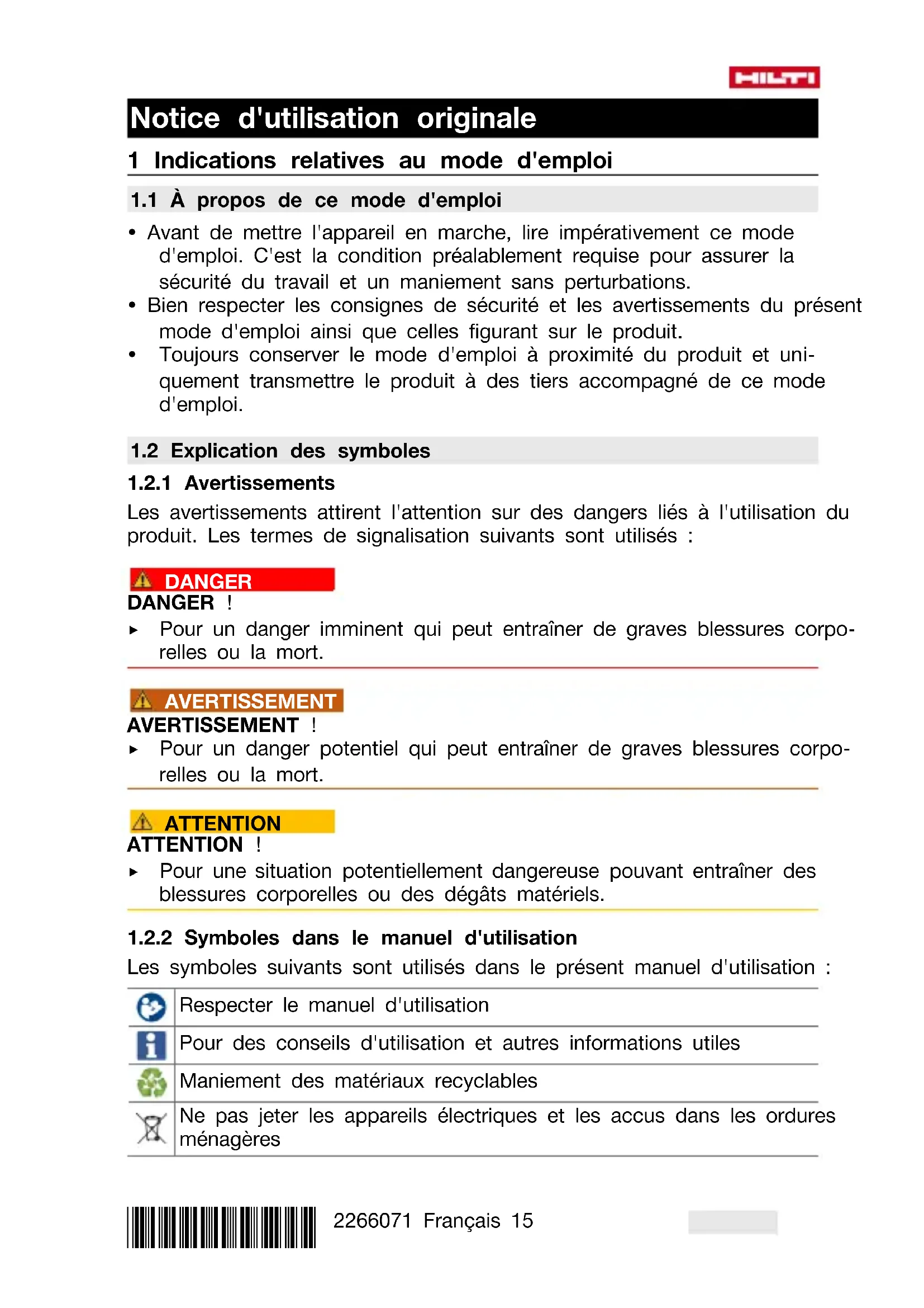 1.2.2 Symboles dans le manuel d'utilisation
