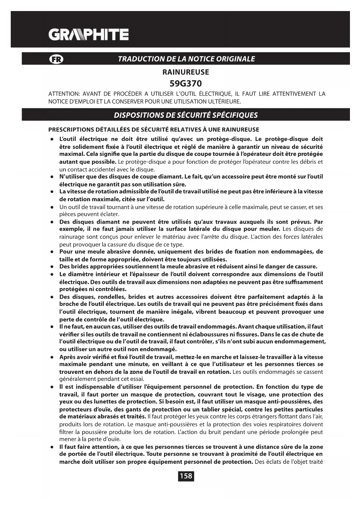 PRESCRIPTIONS DÉTAILLÉES DE SÉCURITÉ RELATIVES À UNE RAINUREUSE ● L’outil électrique ne doit être utilisé qu’avec un protège-disque. Le protège-disque doit être solidement xée à l’outil électrique et réglé de manière à garantir un niveau de sécurité maximal. Cela signie que la partie du disque de coupe tournée à l’opérateur doit être protégée autant que possible. Le protège-disque a pour fonction de protéger l’opérateur contre les débris et un contact accidentel avec le disque. ● N’utiliser que des disques de coupe diamant. Le fait, qu’un accessoire peut être monté sur l’outil électrique ne garantit pas son utilisation sûre. ● La vitesse de rotation admissible de l’outil de travail utilisé ne peut pas être inférieure à la vitesse de rotation maximale, citée sur l’outil. ● Un outil de travail tournant à une vitesse de rotation supérieure à celle maximale, peut se casser, et ses pièces peuvent éclater. ● Des disques diamant ne peuvent être utilisés qu’aux travaux auxquels ils sont prévus. Par exemple, il ne faut jamais utiliser la surface latérale du disque pour meuler. Les disques de rainurage sont conçus pour enlever le matériau avec l’arrête du disque. L’action des forces latérales peut provoquer la cassure du disque de ce type. ● Pour une meule abrasive donnée, uniquement des brides de xation non endommagées, de taille et de forme appropriée, doivent être toujours utilisées. ● Des brides appropriées soutiennent la meule abrasive et réduisent ainsi le danger de cassure. ● Le diamètre intérieur et l’épaisseur de l’outil doivent correspondre aux dimensions de l’outil électrique. Des outils de travail aux dimensions non adaptées ne peuvent pas être susamment protégées ni contrôlées. ● Des disques, rondelles, brides et autres accessoires doivent être parfaitement adaptés à la broche de l’outil électrique. Les outils de travail qui ne peuvent pas être précisément xés dans l’outil électrique, tournent de manière inégale, vibrent beaucoup et peuvent provoquer une perte de contrôle de l’outil électrique. ● Il ne faut, en aucun cas, utiliser des outils de travail endommagés. Avant chaque utilisation, il faut vérier si les outils de travail ne contiennent ni éclaboussures ni ssures. Dans le cas de chute de l’outil électrique ou de l’outil de travail, il faut contrôler, s’ils n’ont subi aucun endommagement, ou utiliser un autre outil non endommagé. ● Après avoir vérié et xé l’outil de travail, mettez-le en marche et laissez-le travailler à la vitesse maximale pendant une minute, en veillant à ce que l’utilisateur et les personnes tierces se trouvent en dehors de la zone de l’outil de travail en rotation. Les outils endommagés se cassent généralement pendant cet essai. ● ll est indispensable d’utiliser l’équipement personnel de protection. En fonction du type de travail, il faut porter un masque de protection, couvrant tout le visage, une protection des yeux ou des lunettes de protection. Si besoin est, il faut utiliser un masque anti-poussières, des protecteurs d’ouïe, des gants de protection ou un tablier spécial, contre les petites particules de matériaux abrasés et traités. Il faut protéger les yeux contre les corps étrangers ottant dans l’air, produits lors de rotation. Le masque anti-poussières et la protection des voies respiratoires doivent ltrer la poussière produite lors de rotation. L’action du bruit pendant une période prolongée peut mener à la perte d’ouïe. ● Il faut faire attention, à ce que les personnes tierces se trouvent à une distance sûre de la zone de portée de l’outil électrique. Toute personne se trouvant à proximité de l’outil électrique en marche doit utiliser son propre équipement personnel de protection. Des éclats de l’objet traité FR159 ou des pièces de rotation brisées peuvent être projetées et provoquer des lésions également en dehors de la zone de portée directe. ● Lors de l’exécution de travaux au cours desquels l’outil électrique pourrait toucher aux câbles électriques dissimulés ou à son propre câble électrique d’alimentation, il doit être tenu uniquement par les surfaces isolées de la poignée. Sous l’inuence du contact avec les conducteurs sous tension, toutes les parties métalliques de l’outil électroportatif sont également sous tension et peuvent provoquer une électrocution de l’opérateur. ● Le câble de secteur doit être tenu à l’écart des outils de travail tournants. En cas de perte de contrôle de l’outil, le câble d’alimentation du secteur peut être coupé ou entraîné et la poignée ou même toute la main peuvent entrer en contact avec l’outil tournant. ● Il n’est jamais permis de remettre à côté un outil électrique avant que l’outil de travail ne s’arrête entièrement. L’outil de travail en rotation peut entrer en contact avec la surface, sur laquelle il a été remis à cause de quoi on peut perdre le contrôle de l’outil électrique. ● Il n’est pas permis de porter un outil électrique qui est en rotation. Un contact accidentel du vêtement avec l’outil de travail en rotation peut provoquer son happement et la pénétration de l’outil de travail dans le corps de l’utilisateur. ● Il faut nettoyer systématiquement des fentes de ventilation de l’outil électrique. La souante de moteur entraîne la poussière dans le boîtier et une grande accumulation de poussière métallique peut provoquer un danger électrique. ● Il n’est pas permis d’utiliser une meuleuse à proximité des matériaux inammables. Les étincelles peuvent provoquer leur inammation. ● Il n’est pas permis d’utiliser des meuleuses qui nécessitent des uides de refroidissement. L’utilisation d’eau ou d’autres uides de refroidissement peut mener à une électrocution. Recul et 