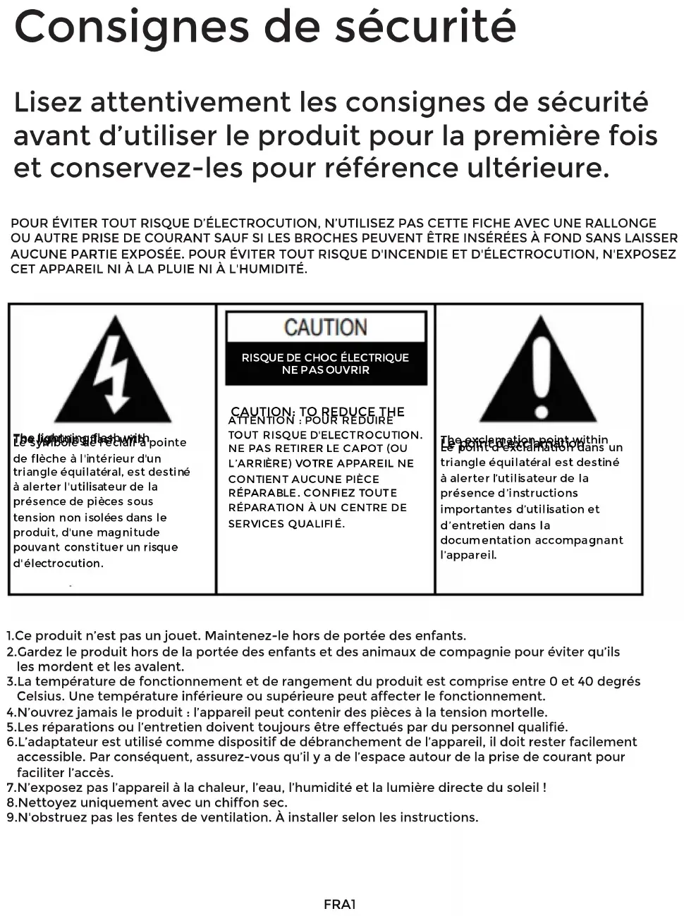 QUALIFIED SERVICE PERSONEL. The exclamation point within an equilateral triangle is intended to alert the user to the presence of important operating and maintenance (servicing) instructions in the literature accompanying the appliance. 1.Ce produit n’est pas un jouet. Maintenez-le hors de portée des enfants. 2.Gardez le produit hors de la portée des enfants et des animaux de compagnie pour éviter qu’ils les mordent et les avalent. 3.Latempératuredefonctionnementetderangementduproduitestcompriseentre0et40degrés Celsius. Une température inférieure ou supérieure peut affecter le fonctionnement. 4.N’ouvrezjamaisleproduit:l’appareilpeutcontenirdespiècesàlatensionmortelle. 5.Les réparations ou l’entretien doivent toujours être effectués par du personnel qualifié. 6.L’adaptateur est utilisé comme dispositif de débranchement de l’appareil, il doit rester facilement accessible. Par conséquent, assurez-vous qu’il y a de l’espace autour de la prise de courant pour faciliter l’accès. 7.N’exposezpasl’appareilàlachaleur,l’eau,l’humiditéetlalumièredirectedusoleil! 8.Nettoyez uniquement avec un chiffon sec. 9.N'obstruez pas les fentes de ventilation. À installer selon les instructions.