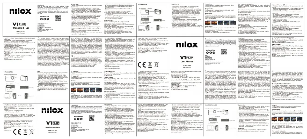 O produto contém uma bateria que pode ser substituída durante o período de vida útil do mesmo. Eliminar de maneira correta a bateria contida no produto no final da sua vida útil (ou seja, quando não puder ser mais carregada), colocando-a num contentor adequado de coleta de baterias, separado dos resíduos gerais indiferenciados. A coleta e a reciclagem ajuda a proteger o ambiente e os recursos naturais, permitindo a recuperação de materiais preciosos. Garantia (Validade e Limitações) - O período de validade da garantia para os consumidores, ou seja, aqueles que adquirem para fins não relacionados à sua atividade profissional ou comercial, é de 2 anos a cntar da entrega nas condições legais. Para os compradores que adquirem com NIF para fins relacionados à sua atividade profissional, é de 1 ano a contar da entrega nas condições legais) - A garantia da bateria é de 6 meses independentemente do tipo de consumidor que compra o produto. - A garantia é válida se o produto apresentar um defeito de fábrica ou um defeito de material. O comprador não tem direito à garantia nos seguintes casos: - ausência do recibo de compra (fatura ou recibo). - tentativas de reparo de peças de hardware e ecrã não autorizadas e/ou alterações ou uso de software diferente daquele instalado; - uso de acessórios ou de elementos não fornecidos com o produto; - desgaste normal do produto; - danos acidentais e quedas. O fabricante, Exhibo S.p.A, declara que Action Cam V1 FLIP está em conformidade com a diretiva 2014/53/UE. O texto completo da declaração de conformidade UE pode ser descarregado no endereço www.nilox.com As especificações presentes neste documento podem variar sem pré-aviso. A Exhibo S.p.A. reserva-se o direito de alterar o produto sem pré-aviso. Nilox® é uma marca registrada da Esprinet S.p.A. Distribuído por Esprinet S.p.A. Produzido e Importado por Exhibo S.p.A. via Leonardo da Vinci 6 20854-Vedano al Lambro (MB) ITÁLIA Feito na China NXACV1FLIP01 www.nilox.com Manuel d’instruction CONSIGNES - Protégez l'appareil photo contre les chutes et veillez à ne pas le faire tomber. - Ne posez pas d'objets lourds sur la caméra. - Conservez votre appareil loin des objets générant des champs magnétiques importants tels que les machines électriques afin d'éviter les ondes radio puissantes qui pourraient endommager le produit et affecter le son ou la qualité de l'image. - Conservez la caméra à distance de l'eau et des liquides (à moins qu'elle ne soit équipée d'un caisson étanche). Cela risquerait de porter atteinte au fonctionnement de la caméra. - Ne pas exposer le produit à des températures élevées supérieures à 55°C. - Nous vous recommandons d'utiliser une carte mémoire micro SD de haute qualité pour obtenir de meilleurs résultats. Il est nécessaire, avant l'utilisation, de formater les cartes mémoire micro SD, micro SDHC et micro SDXC dans la caméra et de la redémarrer après le formatage. - Ne placez pas votre carte mémoire micro SD à proximité d'objets fortement magnétiques afin d'éviter toute perte ou erreur de données. - Retirez la batterie avant d'utiliser l'appareil comme une dashcam. - Batterie au lithium. Il existe un danger d'explosion si l'on utilise le mauvais type de batterie. - Débranchez immédiatement l'appareil de l'alimentation en cas de surchauffe, de fumée ou s'il dégage de mauvaises odeurs afin d'éviter tout risque d'incendie. - Tenez-le hors de portée des enfants lorsqu'il est en charge. N'utilisez pas la caméra lorsque le niveau de la batterie est faible. - N'utilisez pas la caméra pendant qu'elle est en charge. - Conservez l'appareil dans un endroit frais, sec et non poussiéreux.utilise le mauvais type de batterie. - Débranchez immédiatement l'appareil de l'alimentation en cas de surchauffe, de fumée ou s'il dégage de mauvaises odeurs afin d'éviter tout risque d'incendie. - Tenez-le hors de portée des enfants lorsqu'il est en charge. - N'utilisez pas la caméra lorsque le niveau de la batterie est faible. - N'utilisez pas la caméra pendant qu'elle est en charge. - Conservez l'appareil dans un endroit frais, sec et non poussiéreux. - N'essayez pas d'ouvrir le boîtier de la caméra ni d'y apporter quelque modification que ce soit. La garantie sera nulle. INTRODUCTION Une action cam « Nilox V1 FLIP » est une caméra sportive numérique capable de filmer en haute définition. Elle offre une multitude de fonctions qui permettent de filmer des vidéos, prendre des photos, enregistrer du son et elle est aussi dotée d'un écran d'affichage et d'une batterie amovible. Elle est parfaite pour filmer à bord d'un véhicule, les sports en plein air, comme caméra de surveillance, pour la plongée et toute une série d'autres activités. Elle vous permettra de profiter de chaque instant en capturant chaque image à tout moment et où que vous soyez.