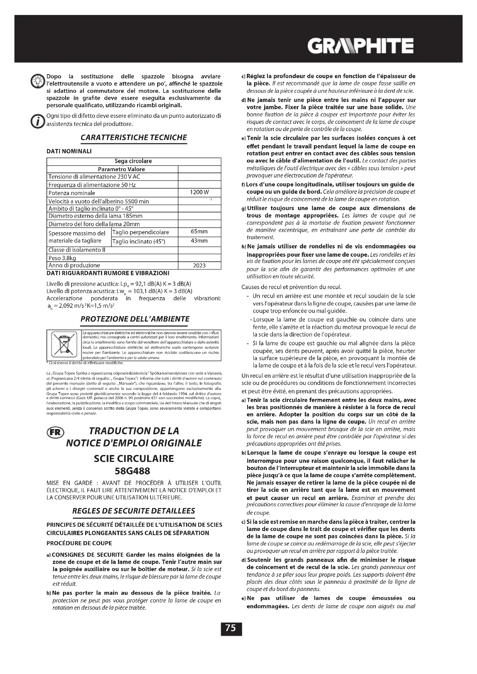 Déclaration de conformité CE Fabricant : Grupa Topex Sp. z o.o. Sp.k., Pograniczna 2/4 02-285 Warszawa Produit : Scie circulaire Modèle : 58G488 Nom commercial : GRAPHITE Numéro de série : 00001 ÷ 99999 Cette déclaration de conformité est délivrée sous la seule responsabilité du fabricant. Le produit décrit ci-dessus est conforme aux documents suivants : Directive Machines 2006/42/CE Directive sur la compatibilité électromagnétique 2014/30/EU Directive RoHS 2011/65/EU modifiée par la directive 2015/863/EU Et répond aux exigences des normes : EN 62841-1:2015/A11:2022 ; EN 62841-2-5:2014 ; EN IEC 55014-1:2021 ; EN IEC 55014-2:2021 ; EN IEC 61000-3- 2:2019/A1:2021 ; EN 61000-3-3:2013/A2:2021 ; EN IEC 63000:2018 Organisme notifié : No. 0123 ; TŰV SŰD Product Service GmbH, Ridlerstraβe 65, 80339 Műnchen, Allemagne Attestation d'examen CE de type n° : M8A 097526 0070 Rév. 02 Cette déclaration ne concerne que la machine telle qu'elle est mise sur le marché et n'inclut pas les composants ajoutés par l'utilisateur final ou effectués par lui ultérieurement. Nom et adresse de la personne résidant dans l'UE autorisée à préparer le dossier technique : Signé au nom de : Grupa Topex Sp. z o.o. Sp.k. 2/4 rue Pograniczna 02-285 Varsovie Paweł Kowalski GROUPE TOPEX Responsable de la qualité Varsovie, 2023-07-31