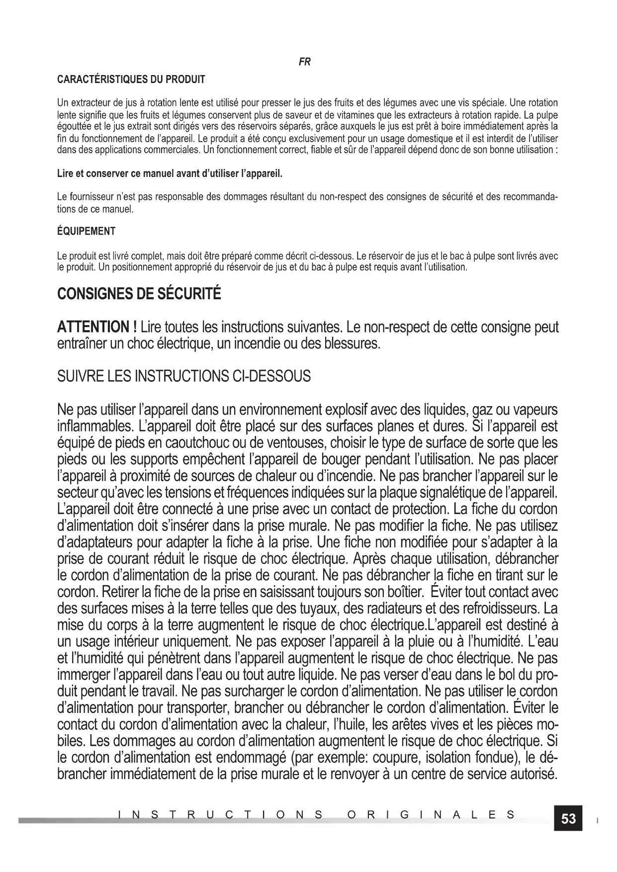 Ne pas utiliser l’appareil dans un environnement explosif avec des liquides, gaz ou vapeurs infl ammables. L’appareil doit être placé sur des surfaces planes et dures. Si l’appareil est équipé de pieds en caoutchouc ou de ventouses, choisir le type de surface de sorte que les pieds ou les supports empêchent l’appareil de bouger pendant l’utilisation. Ne pas placer l’appareil à proximité de sources de chaleur ou d’incendie. Ne pas brancher l’appareil sur le secteur qu’avec les tensions et fréquences indiquées sur la plaque signalétique de l’appareil. L’appareil doit être connecté à une prise avec un contact de protection. La fi che du cordon d’alimentation doit s’insérer dans la prise murale. Ne pas modifi er la fi che. Ne pas utilisez d’adaptateurs pour adapter la fi che à la prise. Une fi che non modifi ée pour s’adapter à la prise de courant réduit le risque de choc électrique. Après chaque utilisation, débrancher le cordon d’alimentation de la prise de courant. Ne pas débrancher la fi che en tirant sur le cordon. Retirer la fi che de la prise en saisissant toujours son boîtier. Éviter tout contact avec des surfaces mises à la terre telles que des tuyaux, des radiateurs et des refroidisseurs. La mise du corps à la terre augmentent le risque de choc électrique.L’appareil est destiné à un usage intérieur uniquement. Ne pas exposer l’appareil à la pluie ou à l’humidité. L’eau et l’humidité qui pénètrent dans l’appareil augmentent le risque de choc électrique. Ne pas immerger l’appareil dans l’eau ou tout autre liquide. Ne pas verser d’eau dans le bol du pro- duit pendant le travail. Ne pas surcharger le cordon d’alimentation. Ne pas utiliser le cordon d’alimentation pour transporter, brancher ou débrancher le cordon d’alimentation. Éviter le contact du cordon d’alimentation avec la chaleur, l’huile, les arêtes vives et les pièces mo- biles. Les dommages au cordon d’alimentation augmentent le risque de choc électrique. Si le cordon d’alimentation est endommagé (par exemple: coupure, isolation fondue), le dé- brancher immédiatement de la prise murale et le renvoyer à un centre de service autorisé.54 INSTRUCTIONS ORIGINALES
