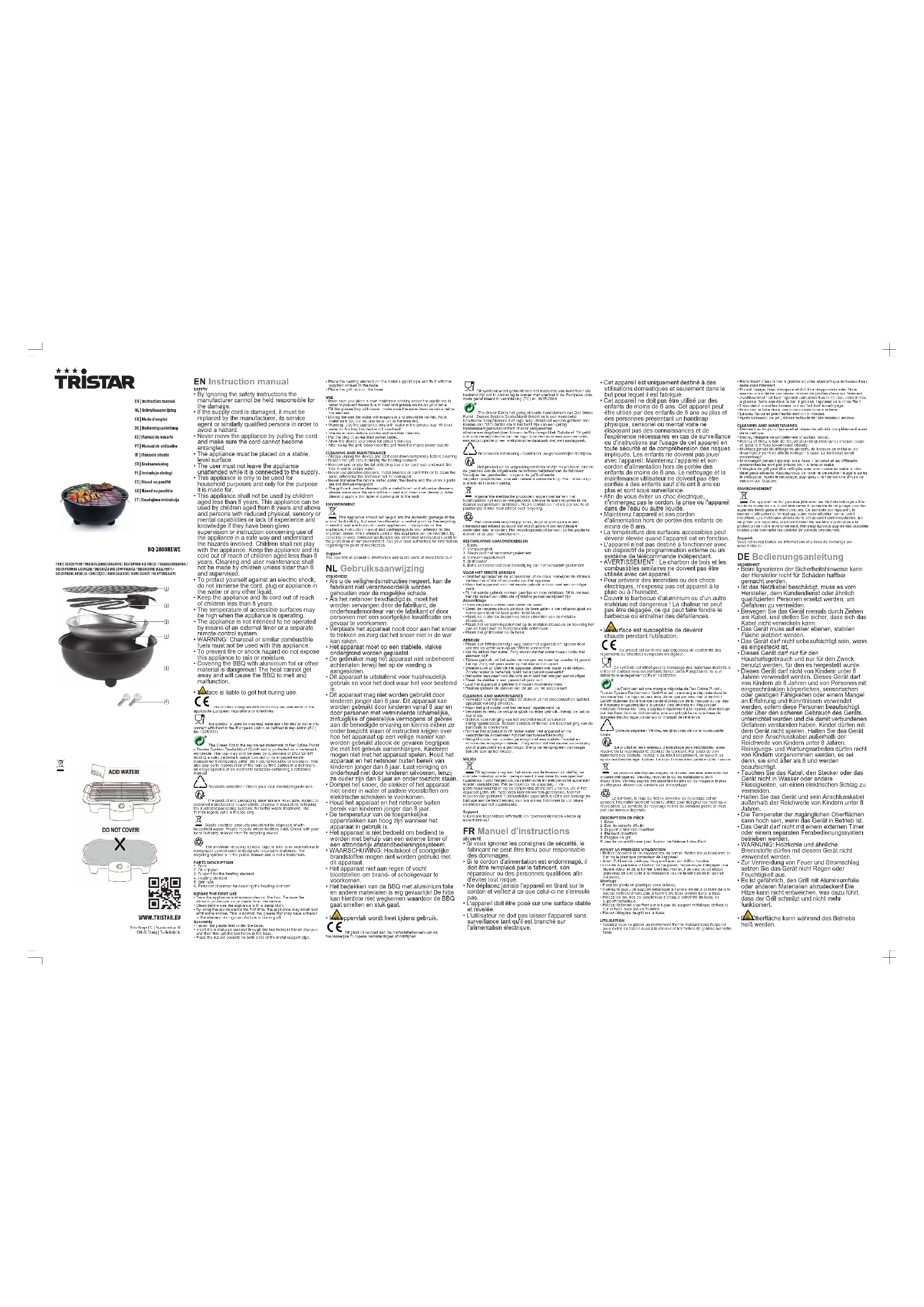 - La surface est susceptible de devenir chaude pendant l'utilisation. Ce produit est conforme aux exigences de conformité desrèglements ou directives européens en vigueur. Ce symbole est utilisé pour le marquage des matériaux destinés àentrer en contact avec les aliments dans l'Union Européenne, tel quedéfini dans le règlement (CE) n° 1935/2004. Le Point vert est une marque déposée de Der Grüne Punkt -Duales System Deutschland GmbH et est une marque déposée dans lemonde entier. Le logo ne peut être utilisé que par des clients de DSDGmbH titulaires d'une licence valide d'utilisation de la marque ou par desentreprises engagées dans la gestion des déchets en RépubliqueFédérale Allemande. Cela s'applique également à la reproduction du logopar des tiers dans un dictionnaire, une encyclopédie ou une base dedonnées électronique contenant un manuel de référence. Collecte séparée / Vérifiez les directives de votre municipalitélocale. Le produit et les matériaux d'emballage sont recyclables, sousréserve de la responsabilité étendue du fabricant. Par souci de bontraitement des déchets, mettez-le au rebut séparément, en suivant lessymboles d'emballage illustrés. Le logo Triman n'est valable qu'en France. Les produits électriques usagés ne doivent pas être jetés avec lesordures ménagères. Veuillez recycler là où les installations sontdisponibles. Vérifiez auprès des autorités locales ou du magasin le plusproche pour obtenir des conseils sur le recyclage. Le symbole, le logo ou l'icône universel de recyclage est unsymbole internationalement reconnu utilisé pour désigner les matériauxrecyclables. Le symbole du recyclage relève du domaine public et n'estpas une marque déposée.DESCRIPTION DE PIÈCE1. Base2. Bac de collecte d'huile3. Support d'élément chauffant4. Élément chauffant5. Étagère de grill6. Jeu de vis additionnel pour fixation de l'élément chauffantAVANT LA PREMIÈRE UTILISATION• Retirer l’appareil et les accessoires du carton. Retirer les autocollants, lefilm ou le plastique protecteur de l’appareil.• Avant l’utilisation, nettoyez l’appareil avec un chiffon humide.• Lors de la première utilisation de l’appareil, l’appareil peut dégager unelégère odeur et de la fumée. Ceci est normal, il se peut qu’un enduitgraisseux se soit collé à la résistance lors de la fabrication et qu’il seconsume.Montage• Fixez les pieds en plastique sous la base.• Insérez le tuyau de support métallique à travers les deux orifices dans lebac de collecte d'huile puis à travers les deux orifices dans la base.• Placez les douilles en caoutchouc à chaque extrémité du tuyau desupport métallique.• Placez l'élément chauffant sur le tuyau de support métallique et fixez-lesur la base avec les vis fournies.• Placez l'étagère de grill sur la base.UTILISATION• Assurez-vous de placer un revêtement thermorésistant sous l'appareilpour éviter les traces dues à la chaleur et les taches de graisse sur votretable.• Remplissez d'eau le bac à graisse en vous assurant que le niveau d'eaureste sous l'élément.• Durant l'usage, l'eau s'évapore et doit être réapprovisionnée. Note :assurez-vous de ne pas laisser tomber de gouttes d'eau sur l'élément.• Avertissement ! Utilisez l'appareil uniquement avec de l'eau dans le bacà graisse. Sans eau dans le bac à graisse, l'appareil va surchauffer !• L'eau réduit aussi les fumées tout en facilitant le nettoyage.• Branchez la fiche dans une prise murale mise à la terre.• Laissez l'appareil préchauffer environ 5 minutes.• Après utilisation du grill, déconnectez-le de l'alimentation secteur.CLEANING AND MAINTENANCE• Débranchez toujours l’appareil et laissez-le refroidir complètement avantde le nettoyer.• Retirez l'étagère de grill (élément chauffant inclus).• Retirez et videz le bac de récupération de graisse après chaque usageet lavez-le à l'eau savonneuse chaude.• N'utilisez jamais de détergents abrasifs, de brosses en métal ou dediluant pour peinture afin de nettoyer la base. Le barbecue seraitendommagé.• N’immergez jamais l’appareil sous l’eau. L’appareil et les différentsaccessoires ne sont pas prévus pour le lave-vaisselle.• L'étagère de grill peut être nettoyée avec une brosse en métal et desdétergents abrasifs. Assurez-vous de rincer et de sécher l'étagère aprèsle nettoyage. Après le nettoyage, appliquez une fine couche d'huile decuisson sur l'étagère.ENVIRONNEMENTCet appareil ne doit pas être jeté avec les déchets ménagers à lafin de sa durée de vie, il doit être remis à un centre de recyclage pour lesappareils électriques et électroniques. Ce symbole sur l'appareil, lemanuel d'utilisation et l'emballage attire votre attention sur un pointimportant. Les matériaux utilisés dans cet appareil sont recyclables. Enrecyclant vos appareils, vous contribuez de manière significative à laprotection de notre environnement. Renseignez-vous auprès des autoritéslocales pour connaître les centres de collecte des déchets.SupportVous retrouvez toutes les informations et pièces de rechange surwww.tristar.eu! DEBedienungsanleitung SICHERHEIT