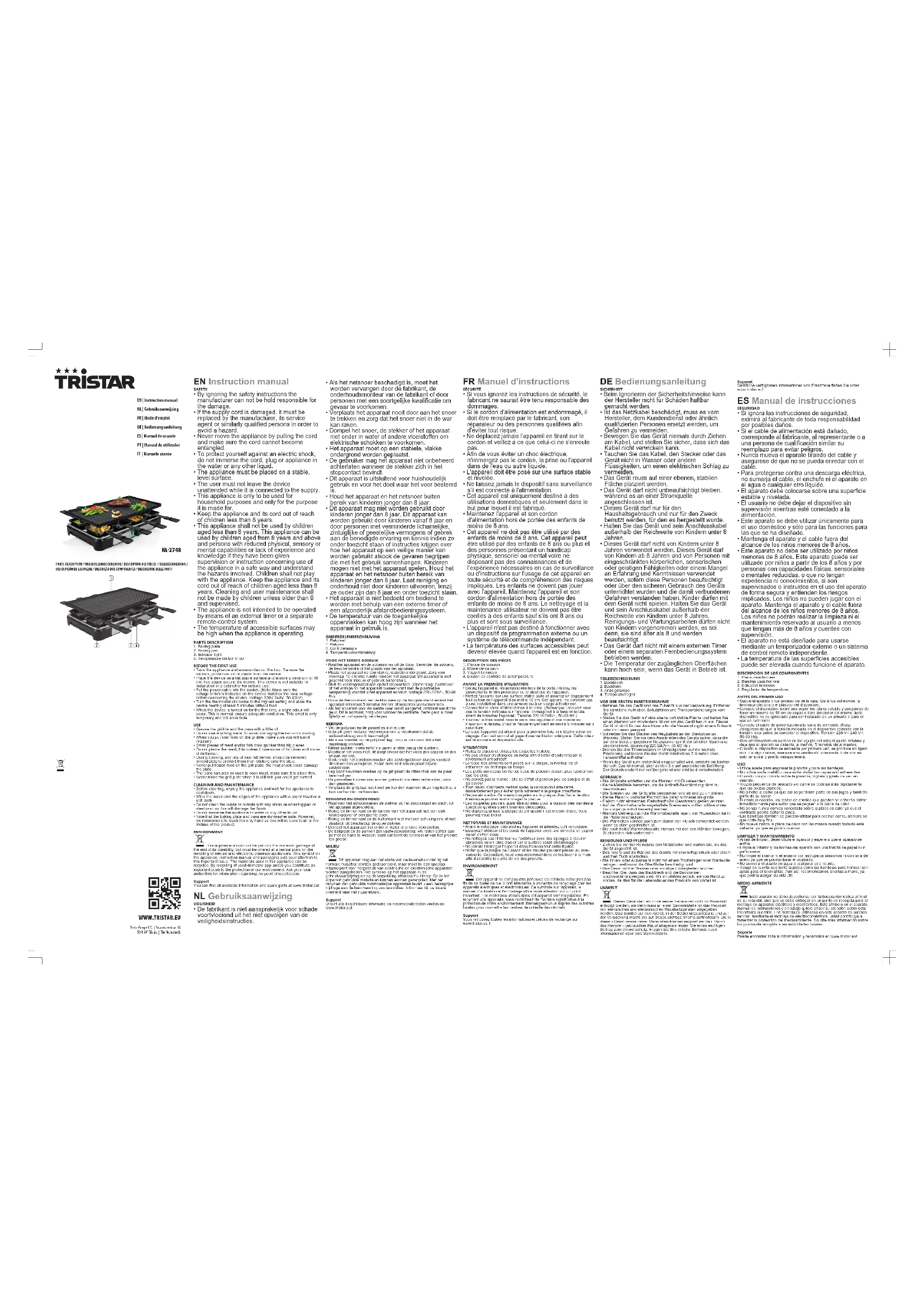 - La température des surfaces accessibles peut devenir élevée quand l'appareil est en fonction. DESCRIPTION DES PIÈCES1. Plaque de cuisson2. Moule de cuisson3. Voyant lumineux4. Bouton de contrôle de la températureAVANT LA PREMIÈRE UTILISATION• Sortez l'appareil et les accessoires hors de la boîte.Retirez lesautocollants, le film protecteur ou le plastique de l'appareil.• Mettez l'appareil sur une surface stable plate et assurez un dégagementtout autour de l'appareil d'au moins 10 cm. Cet appareil ne convient pasà une installation dans une armoire ou à un usage à l'extérieur.• Connectez le câble d'alimentation à la prise. (Remarque : assurez-vousque la tension indiquée sur l'appareil correspond à la tension localeavant de brancher l'appareil. Tension 220 V-240V~, 50-60 Hz.).• Tournez le thermostat dans le sens des aiguilles d’une montre aumaximum et laissez chauffer l'appareil pendant au moins 5 minutes sansnourriture.• Lorsque l'appareil est allumé pour la première fois, une légère odeur sedégage. Ceci est normal et gage d'une ventilation adéquate. Cette odeurest temporaire et disparaîtra vite.UTILISATION• Huilez la plaque et utilisez les coupelles huilées.• Ne pas utiliser d'ustensiles en métal afin d'éviter d'endommager lerevêtement antiadhésif.• Lorsque des aliments sont posés sur la plaque, surveillez-les etretournez les de temps en temps.• Les petits morceaux de viande et/ou de poisson cuisent plus rapidementque les gros.• Ne percez pas la viande; elle se défait et perd un peu de son jus et desa saveur.• Tout résidu d'aliments restant après la cuisson doit être retiréimmédiatement pour éviter qu'ils adhèrent à la plaque chauffante.• Ne jamais mettre d'aliments congelés sur la plaque chauffante, le chocthermique pourrait endommager la plaque.• Les coupelles peuvent aussi être utilisées pour la cuisson des viandes àcondition qu'elles soient finement découpées.• Ne déplacez jamais la plaque du gril quand il est encore chaud, vouspourriez vous brûler.NETTOYAGE ET MAINTENANCE• Avant le nettoyage, débranchez l'appareil et attendez qu'il refroidisse.• Essuyez l'intérieur et les bords de l'appareil avec une serviette en papierou un chiffon doux.• Ne nettoyez pas l'intérieur ou l'extérieur avec des éponges à récurerabrasives ou en laine d'acier car la surface serait endommagée.• Ne jamais immerger l’appareil dans l’eau ou tout autre liquide.• Notez que la plaque de cuisson et les moules peuvent passer au lave-vaisselle. Cependant, nous vous recommandons de les laver à la mainafin d'accroître la durée de vie des produits.ENVIRONNEMENTCet appareil ne doit pas être jeté avec les déchets ménagers à lafin de sa durée de vie, il doit être remis à un centre de recyclage pour lesappareils électriques et électroniques. Ce symbole sur l'appareil, lemanuel d'utilisation et l'emballage attire votre attention sur un pointimportant. Les matériaux utilisés dans cet appareil sont recyclables. Enrecyclant vos appareils, vous contribuez de manière significative à laprotection de notre environnement. Renseignez-vous auprès des autoritéslocales pour connaître les centres de collecte des déchets.SupportVous retrouvez toutes les informations et pièces de rechange surwww.tristar.eu! DEBedienungsanleitung SICHERHEIT