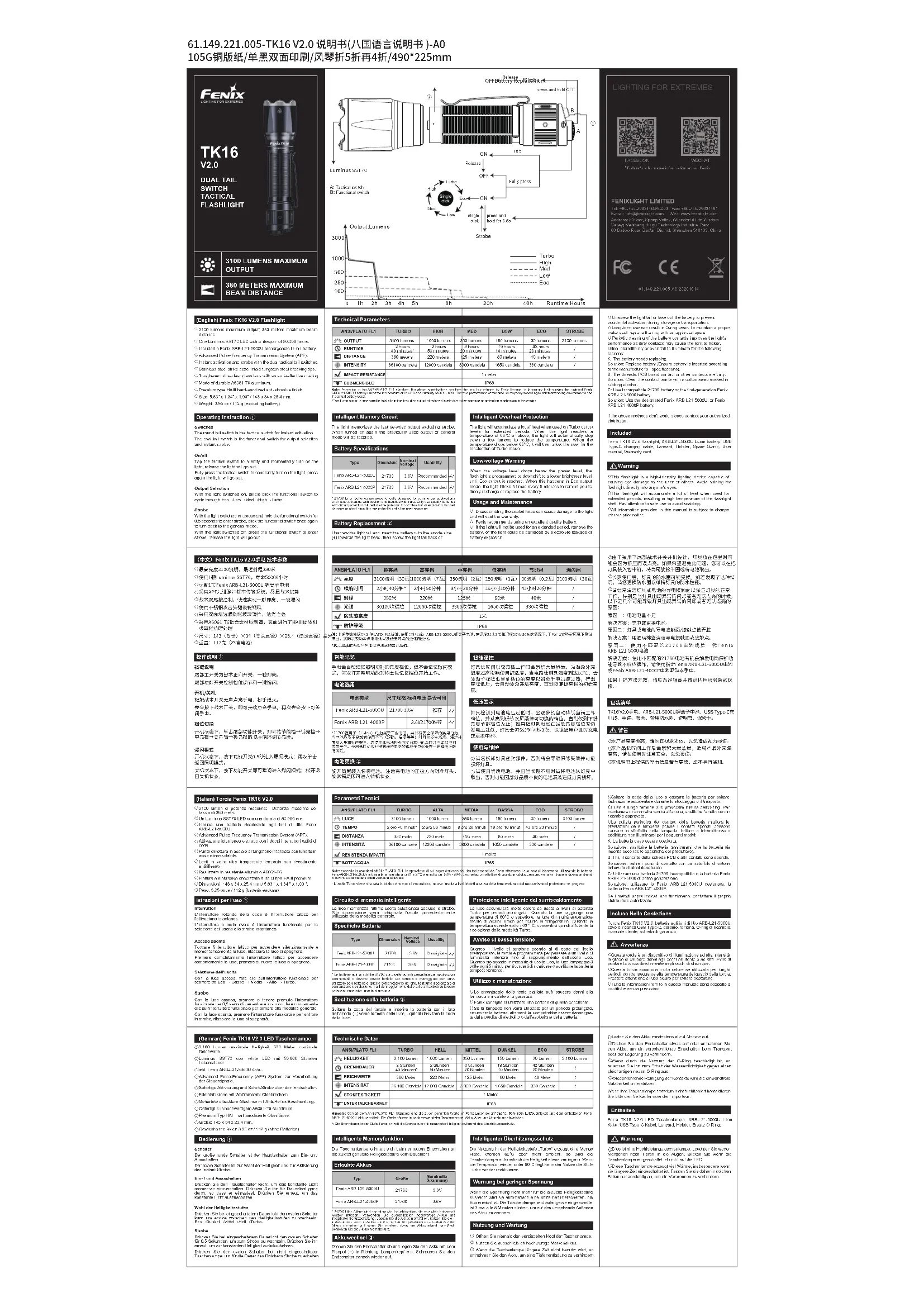 105G铜版纸/单黑双面印刷/风琴折5折再4折/490*225mm(French) Lampe Torche Fenix TK16 V2.0 Paramètres Techniques Mode d’emploi ① Caractéristiques des batteries Indication de basse tension Contenu Avertissement Remplacement de la batterie ② Circuit intelligent de mémoire Protection intelligente contre la surchauffe Puissance maxi de 3100 lumens et une portée maxi du faisceau de 380 mètres. 1 LED Luminus SST70, ayant une durée de vie de 50000 heures. Batterie Li-ion Fenix ARB-L21-5000U incluse. Système avancé de transmission de fréquence d'impulsion. Activation instantanée et strobe par le double interrupteur tactique arrière. Couronne de frappe crantée en acier inoxydable incrustée de pointes brise-glaces au tungstène. Lentille en verre ultra-clair trempé avec un revêtement antireflet. Fabriqué en aluminium durable A6061-T6. Finition Premium avec anodisation dure anti-abrasive de type HAIII. Dimensions: 143 x 34 x 25.4 mm / 5.63'' x 1.34'' x 1.00''. Poids: 112 g / 3.95 oz (sans batterie). Interrupteurs L'interrupteur arrière rond est l'interrupteur tactique pour une activation instantanée. L'interrupteur arrière ovale est l'interrupteur fonctionnel pour la sélection des modes de puissance et l’activation instantanée du strobe. On/off Appuyez sur l'interrupteur tactique pour activer silencieusement et momentanément la lampe, relâchez-le et la lampe s'éteindra. Appuyez à fond sur l'interrupteur tactique pour un allumage constant de la lampe, appuyez à nouveau sur celui-ci pour éteindre la lampe. Sélection du mode de puissance Lampe allumée, cliquez sur l’interrupteur fonctionnel pour faire défiler les niveaux de puissance dans l’ordre Eco→Faible→ Moyen→Fort→Turbo. La lampe mémorise le dernier niveau de puissance utilisé excepté le Strobe. Lorsqu’on la rallume, le dernier niveau de puissance du mode général utilisé est réactivé. Strobe Lampe allumée, appuyez sur l’interrupteur fonctionnel durant 0,5 seconde pour activer le mode Strobe, cliquez à nouveau sur ce même interrupteur pour revenir au mode général. Lampe éteinte, appuyez sur l’interrupteur fonctionnel pour activer le mode Strobe, relâchez la pression et la lampe s’éteindra. Dévissez le bouchon arrière pour insérer la batterie avec le (+) dirigé vers la tête de la lampe, puis revissez-le. Lorsque le niveau de tension tombe en dessous du niveau prédéfini, la lampe est programmée pour passer au mode de puissance inférieur, et ce jusqu’à ce que le niveau Eco soit atteind. Lorsque cela arrive en niveau Eco, la lampe va clignoter 3 fois toutes les 5 minutes pour rappeler qu’il faut recharger ou remplacer la batterie. La lampe va générer une chaleur importante lorsque le mode Turbo est utilisé durant de longues périodes. Lorsque la lampe atteint la température de 60°C voir plus, la lampe va diminuer automatiquement la puissance de quelques lumens pour réduire la température. Lorsque la température sera revenue sous les 60°C, le mode Turbo pourra à nouveau être sélectionné. lampe Fenix TK16 V2.0, batterie Li-ion ARB-L21-5000U, câble de rechargement USB Type-C, dragonne, étui, joint torique de remplacement, manuel d’utilisation, carte de garantie. Si les recommandations ci-dessus ne fonctionnent pas, merci de contacter votre distributeur agréé. Cette lampe est un dispositif d'éclairage à haute intensité capable de causer des dommages aux yeux de l’utilisateur ou à d’autres personnes. Évitez de diriger la lumière dans les yeux de quiconque. Cette lampe accumulera une chaleur élevée lorsqu'elle est utilisée pendant de longues périodes, ce qui entraîne une température élevée de son corps. Faites attention à une utilisation sûre pour éviter les brûlures. Toutes les informations fournies dans ce manuel sont susceptibles d'être modifiées sans préavis.