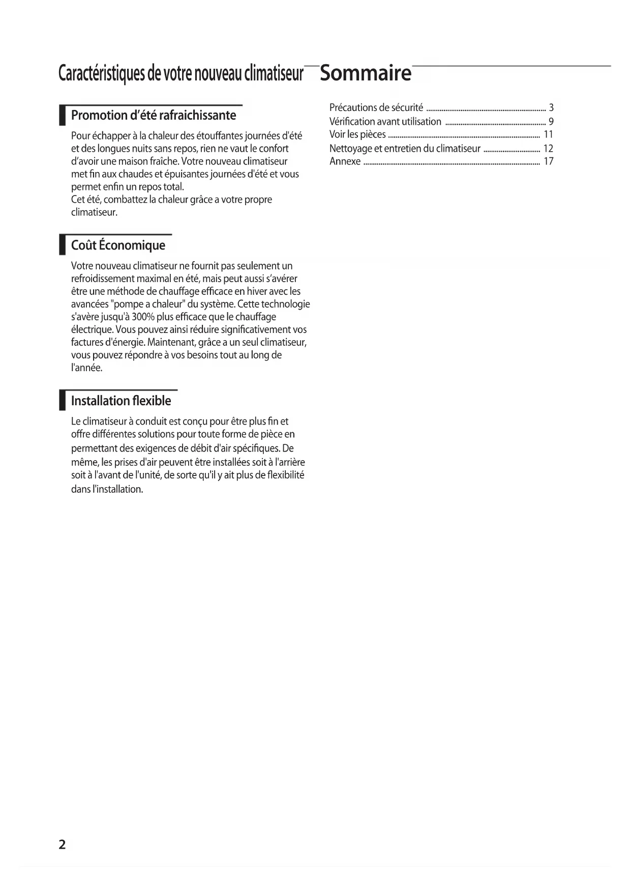 - Annexe Promotion d’été rafraichissante Pour échapper à la chaleur des étouantes journées d'été et des longues nuits sans repos, rien ne vaut le confort d’avoir une maison fraîche. Votre nouveau climatiseur met n aux chaudes et épuisantes journées d'été et vous permet enn un repos total. Cet été, combattez la chaleur grâce a votre propre climatiseur. Coût Économique Votre nouveau climatiseur ne fournit pas seulement un refroidissement maximal en été, mais peut aussi s’avérer être une méthode de chauage ecace en hiver avec les avancées "pompe a chaleur" du système. Cette technologie s'avère jusqu'à 300% plus ecace que le chauage électrique. Vous pouvez ainsi réduire signicativement vos factures d'énergie. Maintenant, grâce a un seul climatiseur, vous pouvez répondre à vos besoins tout au long de l'année. Installation exible Le climatiseur à conduit est conçu pour être plus n et ore diérentes solutions pour toute forme de pièce en permettant des exigences de débit d'air spéciques. De même, les prises d'air peuvent être installées soit à l'arrière soit à l'avant de l'unité, de sorte qu'il y ait plus de exibilité dans l'installation. Caractéristiques de votre nouveau climatiseur Sommaire3 FRANÇAIS Précautions de sécurité Avant d'utiliser votre nouveau climatiseur, veuillez lire attentivement ce manuel an de vous assurer comment exploiter ecacement et en toute sécurité les nombreuses caractéristiques et fonctions de votre nouvel appareil. Etant donné que le mode d'emploi ci-dessous couvre diérents modèles, les caractéristiques de votre climatiseur peuvent diérer légèrement de celles décrites dans ce manuel. Pour toutes questions ou information complémentaire, appelez votre centre de contact le plus proche ou consulter en ligne le site www.samsung.com. Symboles et précautions de sécurité importantes: AVERTISSEMENT Les risques ou pratiques dangereuses peuvent entraîner des blessures graves ou la mort. ATTENTION Les risques ou pratiques dangereuses peuvent entraîner des blessures corporelles mineures ou des dommages matériels. Suivez les instructions. Ne faites jamais cela. Assurez-vous que la machine soit mise à la terre pour éviter toute électrocution. Débranchez le cordon d'alimentation de la prise murale. Ne PAS démonter. INSTALLATION AVERTISSEMENT Utilisez le cordon électrique avec les caractéristiques d’alimentation du produit ou supérieures et utilisez uniquement le cordon électrique prévu pour cet appareil. De plus, n’utilisez pas de rallonge. Le fait d’utiliser une rallonge peut entraîner un électrochoc ou un incendie. Ne pas utiliser un transformateur électrique. Cela provoquera une électrocution ou un incendie. Si la tension / fréquence / l’évaluation du taux actuel est différent, cela peut provoquer un incendie. L'installation de cet appareil doit être eectuée par un technicien qualié ou une société de service. Ne pas tenir compte de ces instructions peut entraîner un choc électrique, un incendie, une explosion, des difficultés avec le produit, ou des blessures. Installer un interrupteur et un disjoncteur consacré au climatiseur. Ne pas tenir compte de ces instructions peut entraîner un choc électrique ou un incendie.4 Précautions de sécurité Fixer fermement l'unité extérieure pour que la partie électrique de l'unité extérieure ne soit pas exposée. Ne pas tenir compte de ces instructions peut entraîner un choc électrique ou un incendie. INSTALLATION AVERTISSEMENT Ne pas installer l’appareil a proximité d’outils chauants et de substances inammables. Ne pas installer l’appareil dans un endroit humide, gras ou poussiéreux, dans un endroit exposé aux rayons directs du soleil et de l'eau (gouttes de pluie). Ne pas installer l’appareil près d’un endroit susceptible d’entrainer des fuites de gaz. Cela provoquera une électrocution ou un incendie. Ne jamais installer l'unité extérieure sur un mur extérieur élevé oů il pourrait tomber. Si l'unité extérieure tombe, vous risquez des blessures, la mort ou des dommages matériels. Cet appareil doit être correctement mis a la terre. Ne reliez pas l'appareil a un tuyau de gaz, une conduite d'eau en plastique ou une ligne téléphonique. Ne pas tenir compte de ces instructions peut entraîner un choc électrique, un incendie, une explosion ou d’autres difficultés avec le produit. Ne branchez jamais le cordon d’alimentation dans une prise qui n’est pas correctement mise à la terre et assurez-vous qu’elle soit conforme aux codes de votre région et de votre pays. INSTALLATION ATTENTION Installez votre appareil sur un sol plat et dur qui peut supporter son poids. Ne pas tenir compte de ces instructions peut entraîner des vibrations anormales, du bruit ou des problèmes avec le produit. Installez correctement le tuyau de vidange pour pouvoir eectuer convenablement le drainage de l’eau. Ne pas tenir compte de ces instructions peut entraîner un débordement de l'eau et des dégâts matériels. Lors de l'installation de l'unité extérieure, veillez a brancher le tuyau de vidange pour que le drainage s'eectue correctement. L’eau générée par l'unité extérieure au cours de l'opération de chauffage peut déborder et provoquer des dégâts matériels. Particulièrement en hiver, un bloc de glace peut tomber et entraîner des blessures, la mort ou des dommages matériels.5 FRANÇAIS ALIMENTATION AVERTISSEMENT Lorsque le disjoncteur est endommagé, contactez votre centre de maintenance le plus proche. Ne tirez pas sur le cordon électrique et ne le tordez pas trop. Ne l’enroulez pas et ne faites pas de nœud sur le cordon électrique. N’accrochez pas le cordon électrique sur un objet en métal, ne placez pas d’objet lourd dessus, et n’insérez pas le cordon électrique entre des objets, ne poussez pas le cordon électrique dans l’espace derrière l’appareil. Cela provoquera une 