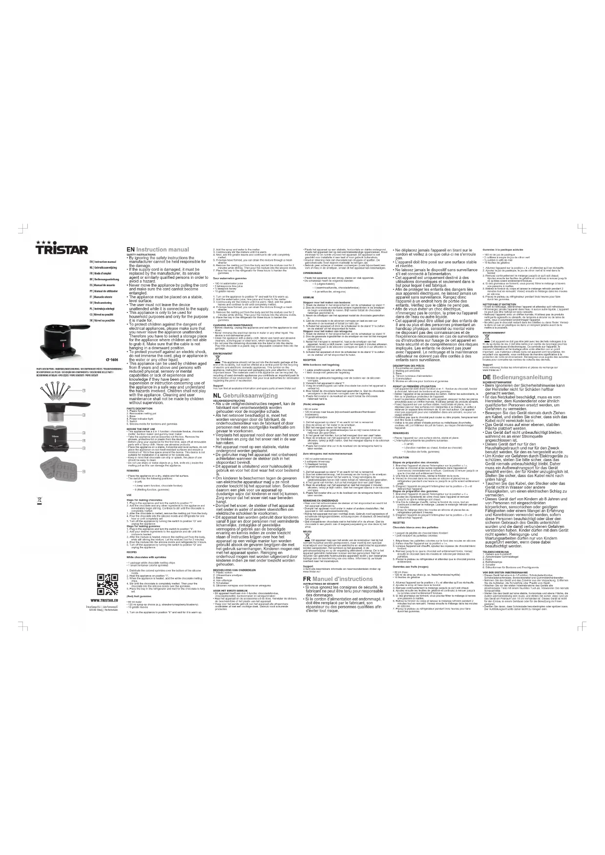 - Cet appareil peut être utilisé par des enfants de 8 ans ou plus et des personnes présentant un handicap physique, sensoriel ou mental voire ne disposant pas des connaissances et de l'expérience nécessaires en cas de surveillance ou d'instructions sur l'usage de cet appareil en toute sécurité et de compréhension des risques impliqués. Les enfants ne doivent pas jouer avec l'appareil. Le nettoyage et la maintenance utilisateur ne doivent pas être confiés à des enfants sans surveillance. DESCRIPTION DES PIÈCES1. Fourchettes en plastique2. Melting pot amovible3. Base4. Témoin lumineux d'alimentation5. Commutateur6. Moules en silicone pour bonbons et gummiesAVANT LA PREMIÈRE UTILISATION• Cet appareil est doté d'une fonction 4 en 1 : fondue au chocolat, fondoirà chocolat, fabricant de bonbons et de gummies.• Retirer l’appareil et les accessoires du carton. Retirer les autocollants, lefilm ou le plastique protecteur de l’appareil.• Avant la première utilisation de votre appareil, essuyez toutes les piècesamovibles avec un chiffon humide. N’utilisez jamais de produits abrasifs.• Posez l'appareil sur une surface stable, horizontale et plane, ne ledéposez pas sur des surfaces non résistantes à la chaleur, et veillez àréserver un espace libre minimum de 10 cm tout autour. Cet appareiln'est pas approprié pour une installation dans une armoire, ou pour unusage extérieur.• N'oubliez pas que le chocolat peut couler ou être projeté, l'emplacementdoit être facile à nettoyer.• Veillez à ne pas utiliser d'objets pointus ou métalliques (fourchette,couteau, etc.) à l'intérieur du pot de fusion, au risque d'endommagerl'appareil.REMARQUES• Placez l’appareil sur une surface sèche, stable et plane.• L'interrupteur présente les positions suivantes :– 0 (arrêt)– I (fonction maintien au chaud, fondue au chocolat)– II (fonction de fonte, gummies)UTILISATIONÉtapes de préparation des chocolats:1. Branchez l'appareil et placez l'interrupteur sur la position « I ».2. Ajoutez le chocolat et les autres ingrédients dans l'appareil etcommencez immédiatement à remuer. Continuez à remuer jusqu'à ceque le chocolat soit entièrement fondu.3. Une fois le chocolat fondu, retirez le fondoir de la cuve.4. Versez le chocolat dans les moules en silicone et placez-les auréfrigérateur pendant une heure ou jusqu'à ce qu'ils soient entièrementprêts.5. Éteignez l'appareil en plaçant l'interrupteur sur la position « O » etdébranchez l'appareil.Étapes de préparation des gummies:1. Branchez l'appareil et placez l'interrupteur sur la position « II ».2. Ajoutez les ingrédients de votre choix dans l'appareil et remuezjusqu'à ce que le mélange soit chaud.3. Une fois le mélange chauffé, retirez le fondoir du corps, tout encontinuant à remuer le mélange. Laissez le mélange refroidir pendant2 minutes.4. Versez le mélange dans les moules en silicone et placez-les auréfrigérateur pendant 3 heures.5. Éteignez l'appareil en plaçant l'interrupteur sur la position « O » etdébranchez l'appareil.RECETTESChocolats blancs avec des paillettes• 1 paquet de pépites de chocolat blanc fondant• 1 petit récipient de paillettes colorées1. Répartissez les paillettes colorées sur le fond des moules en silicone.2. Faites chauffer l'appareil sur la position « I ».3. Lorsque l'appareil est chauffé, ajoutez les copeaux de chocolat blancfondant.4. Remuez jusqu'à ce que le chocolat soit entièrement fondu. Versezensuite le chocolat dans les moules en silicone par-dessus lespaillettes.5. Placez le plateau au réfrigérateur et attendez que le chocolat prenneentièrement.Gummies aux fruits (rouges)• 80 ml d'eau• 120 ml de sirop au choix (p. ex. fraise/framboise/myrtille)• 10 feuilles de gélatine1. Allumez l'appareil sur la position « II » et attendez qu'il se réchauffe.2. Ajoutez le sirop et l'eau dans le fondoir.3. Remuez continuellement le mélange jusqu'à ce qu'il soit chaud.4. Ajoutez ensuite les feuilles de gélatine et continuez à remuer jusqu'àce qu'elles soient entièrement fondues.5. Si des grumeaux se forment, vous pouvez filtrer le mélange à traversune passoire à mailles.6. Retirez le fondoir du corps et laissez le mélange refroidir pendant 2minutes tout en remuant. Versez ensuite le mélange dans les moulesen silicone.7. Placez le plateau au réfrigérateur pendant trois heures pour fairedurcir les gummies.Gummies à la pastèque acidulée• 180 ml de jus de pastèque• 3 cuillères à soupe de jus de citron vert• ½ cuillère à café de miel• 10 feuilles de gélatine1. Allumez l'appareil sur la position « II » et attendez qu'il se réchauffe.2. Ajoutez le jus de pastèque, le jus de citron vert et le miel dans lefondoir.3. Remuez continuellement le mélange jusqu'à ce qu'il soit chaud.Ajoutez ensuite les feuilles de gélatine et continuez à remuer jusqu'àce qu'elles soient entièrement fondues.4. Si des grumeaux se forment, vous pouvez filtrer le mélange à traversune passoire à mailles.5. Retirez le fondoir du corps et laissez le mélange refroidir pendant 2minutes tout en remuant. Versez ensuite le mélange dans les moulesen silicone.6. Placez le plateau au réfrigérateur pendant trois heures pour fairedurcir les gummies.NETTOYAGE ET ENTRETIEN• Avant le nettoyage, débranchez l'appareil et attendez qu'il refroidisse.• N'immergez jamais l'appareil dans l'eau ni aucun autre liquide. L'appareilne peut pas être nettoyé en lave-vaisselle.• Nettoyez l'appareil avec un chiffon humide. N'utilisez pas de produitsnettoyants agressifs ou abrasifs, de tampons à récurer ou de laine deverre, ceux-ci pourraient endommager l'appareil.• Ne jetez pas le chocolat restant dans les toilettes ou dans l'évier. Versez-le dans un sac en plastique ou dans un récipient jetable avant de lemettre à la poubelle.ENVIRONNEMENTCet appareil ne doit pas être jeté avec les déchets ménagers à lafin de sa durée de vie, il doit 