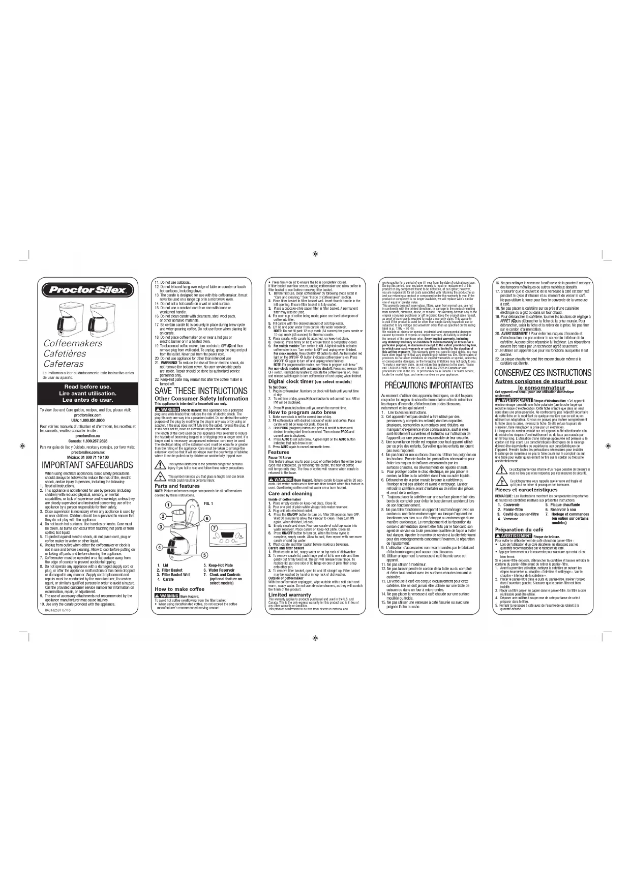 la position ON (mise en marche). Un commutateur illuminé indique que la cafetière est en marche. Tourner le commutateur à la position OFF (arrêt) et débrancher dès la fin de l’utilisation.Pour les modèles avec horloge : Appuyer sur le bouton de mise en marche (ON/OFF) pour commencer l’infusion. L’affichage d’un témoin lumineux rouge sur le bouton de mise en marche (ON/OFF) indique que la cafetière est en marche. Appuyer sur le bouton de mise en marche (ON/OFF) pour mettre hors tension et débrancher la cafetière dès la fin de l’utilisation. NOTE : Pour les modèles programmables, voir le chapitre « Programmation de l’infusion automatique ».Pour les modèles sans horloge et à arrêt automatique : Appuyer et relâcher le commutateur de mise en marche/arrêt (ON/OFF). Un témoin lumineux rouge indique que la cafetière est sous tension. Appuyer et relâcher à nouveau le commutateur pour arrêter la cafetière et débrancher dès la fin de l’utilisation. Préparation du café (suite) Cette garantie s’applique aux produits achetés et utilisées aux É.-U. et au Canada. C’est la seule garantie expresse pour ce produit et est en lieu et place de tout autre garantie ou condition.Ce produit est garanti contre tout défaut de matériaux et de main-d’oeuvre pour une période de un (1) an à compter de la date d’achat d’origine. Au cours de cette période, votre seul recours est la réparation ou le remplacement de ce produit ou tout composant s’avérant défectueux, à notre gré, mais vous êtes responsable de tous les coûts liés à l’expédition du produit et le retour d’un produit ou d’un composant dans le cadre de cette garantie. Si le produit ou un composant n’est plus offert, nous le remplacerons par un produit similaire de valeur égale ou supérieure.Cette garantie ne couvre pas le verre, les filtres, l’usure d’un usage normal, l’utilisation non conforme aux directives imprimées, ou des dommages au produit résultant d’un accident, modification, utilisation abusive ou incorrecte. Cette garantie s’applique seulement à l’acheteur original ou à la personne l’ayant reçu en cadeau. La présentation du reçu de vente d’origine comme preuve d’achat est nécessaire pour faire une réclamation au titre de cette garantie. Cette garantie s’annule si le produit est utilisé autrement que par une famille ou si l’appareil est soumis à toute tension ou forme d’onde différente des caractéristiques nominales précisées sur l’étiquette (par ex. : 120 V ~ 60 Hz).Nous excluons toutes les réclamations au titre de cette garantie pour les dommages spéciaux, consécutifs et indirects causés par la violation de garantie expresse ou implicite. Toute responsabilité est limitée au prix d’achat. Chaque garantie implicite, y compris toute garantie ou condition de qualité marchande ou d’adéquation à un usage particulier, est exonérée, sauf dans la mesure interdite par la loi, auquel cas la garantie ou condition est limitée à la durée de cette garantie écrite. Cette garantie vous donne des droits légaux précis. Vous pouvez avoir d’autres droits qui varient selon l’endroit où vous habitez. Certaines provinces ne permettent pas les limitations sur les garanties implicites ou les dommages spéciaux ou indirects de telle sorte que les limitations ci-dessus ne s’appliquent peut-être pas à votre cas.Ne pas retourner cet appareil au magasin lors d’une réclamation au titre de cette garantie. Téléphoner au 1.800.851.8900 aux É.-U. ou au 1.800.267.2826 au Canada ou visiter le site internet www.proctorsilex.com aux É.-U. ou www.proctorsilex.ca au Canada. Pour un service plus rapide, trouvez le numéro de modèle, le type d’appareil et les numéros de série sur votre appareil. Garantie limitée SALVAGUARDIAS IMPORTANTES