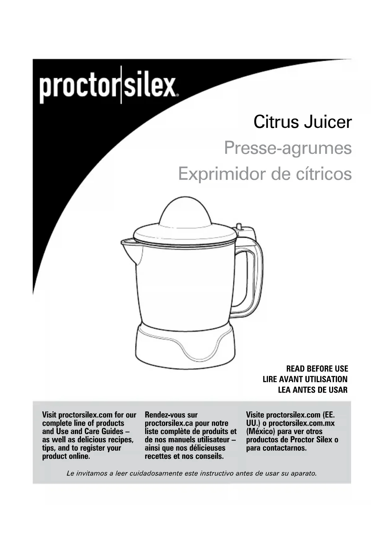 antihoraire. Retirer le panier de contrôle de pulpe et verser le jus. Conserver le jus inutilisé au réfrigérateur dans le broc avec le panier de contrôle de pulpe et le couvercle.13 Garantie limitée Cette garantie s’applique aux produits achetés et utilisées aux É.-U. et au Canada. C’est la seule garantie expresse pour ce produit et est en lieu et place de tout autre garantie ou condition. Ce produit est garanti contre tout défaut de matériaux et de main-d’oeuvre pour une période de trois (3) ans à compter de la date d’achat d’origine. Au cours de cette période, votre recours exclusif se limitera au remplacement de ce produit ou tout autre composant défectueux, à notre discrétion. Cependant, vous êtes responsables des frais associés au retour du produit ou d’un composant en vertu de la présente garantie. Si le produit ou le composant est non disponible, nous le remplacerons avec un article similaire de valeur égale ou supérieure. Cette garantie ne couvre pas le verre, les filtres, l’usure d’un usage normal, l’utilisation non conforme aux directives imprimées, ou des dommages au produit résultant d’un accident, modification, utilisation abusive ou incorrecte. Cette garantie s’applique seulement à l’acheteur original ou à la personne l’ayant reçu en cadeau. La présentation du reçu de vente d’origine comme preuve d’achat est nécessaire pour faire une réclamation au titre de cette garantie. Cette garantie s’annule si le produit est utilisé autrement que par une famille ou si l’appareil est soumis à toute tension ou forme d’onde différente des caractéristiques nominales précisées sur l’étiquette (par ex. : 120 V ~ 60 Hz). Nous excluons toutes les réclamations au titre de cette garantie pour les dommages spéciaux, consécutifs et indirects causés par la violation de garantie expresse ou implicite. Toute responsabilité est limitée au prix d’achat. Chaque garantie implicite, y compris toute garantie ou condition de qualité marchande ou d’adéquation à un usage particulier, est exonérée, sauf dans la mesure interdite par la loi, auquel cas la garantie ou condition est limitée à la durée de cette garantie écrite. Cette garantie vous donne des droits légaux précis. Vous pouvez avoir d’autres droits qui varient selon l’endroit où vous habitez. Certaines provinces ne permettent pas les limitations sur les garanties implicites ou les dommages spéciaux ou indirects de telle sorte que les limitations ci-dessus ne s’appliquent peut-être pas à votre cas. Pour faire une réclamation au titre de la garantie, veuillez ne pas retourner cet appareil au magasin. Veuillez nous écrire à Hamilton Beach Brands, Inc., Customer Service Department, 4421 Waterfront Dr., Glen Allen, VA 23060, ou visiter le site proctorsilex.com/customer- service aux États-Unis ou proctorsilex.ca/customer-service au Canada. Pour obtenir un service plus rapide, veuillez repérer les numéros de modèle, de type et de séries sur votre appareil.14 Cuando utilice artefactos eléctricos, siempre deben seguirse precauciones de seguridad básicas a fin de reducir el riesgo de incendio, descarga eléctrica, y/o lesiones a personas, incluyendo las siguientes: