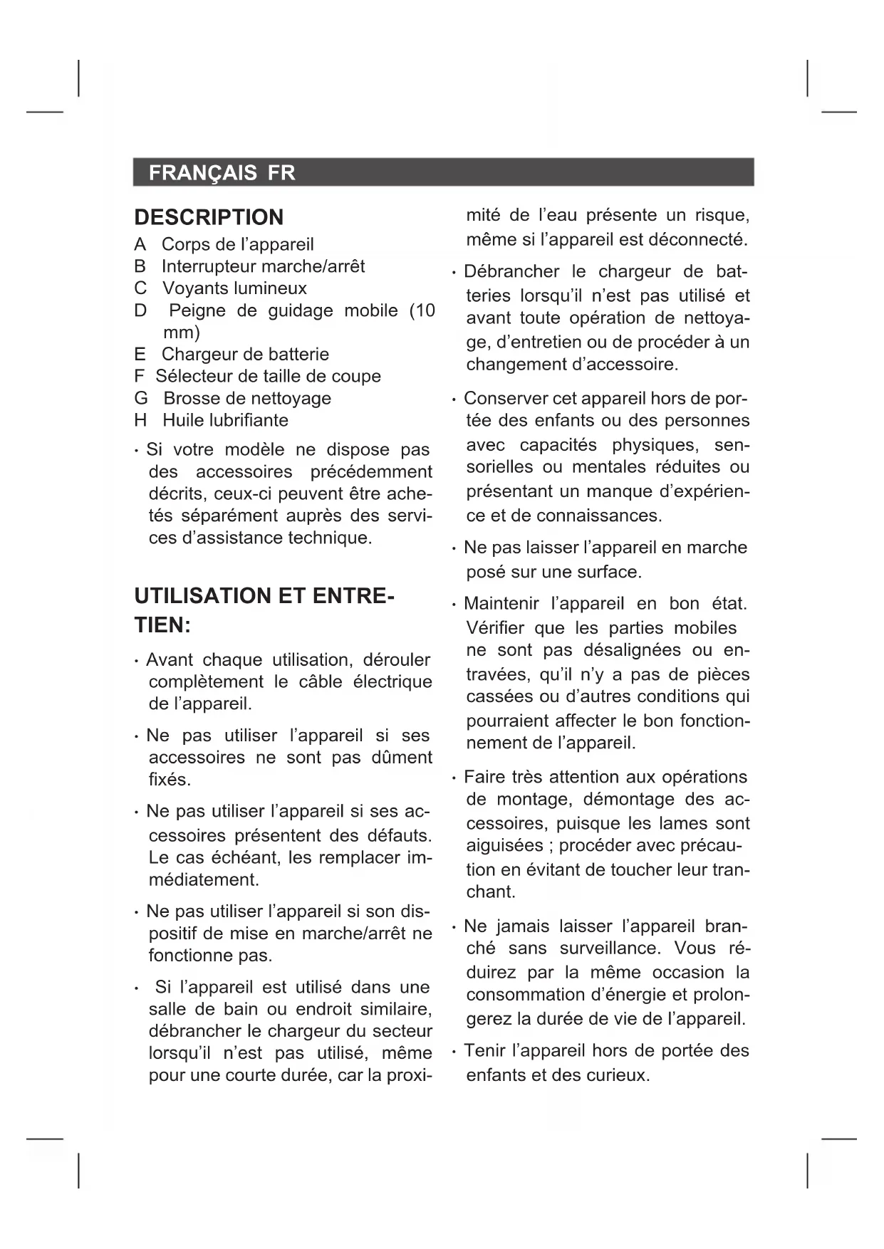 - Safely remove the battery from its housing.FRANÇAIS FR DESCRIPTION A Corps de l’appareil B Interrupteur marche/arrêt C Voyants lumineux D Peigne de guidage mobile (10 mm) E Chargeur de batterie F Sélecteur de taille de coupe G Brosse de nettoyage H Huile lubriante