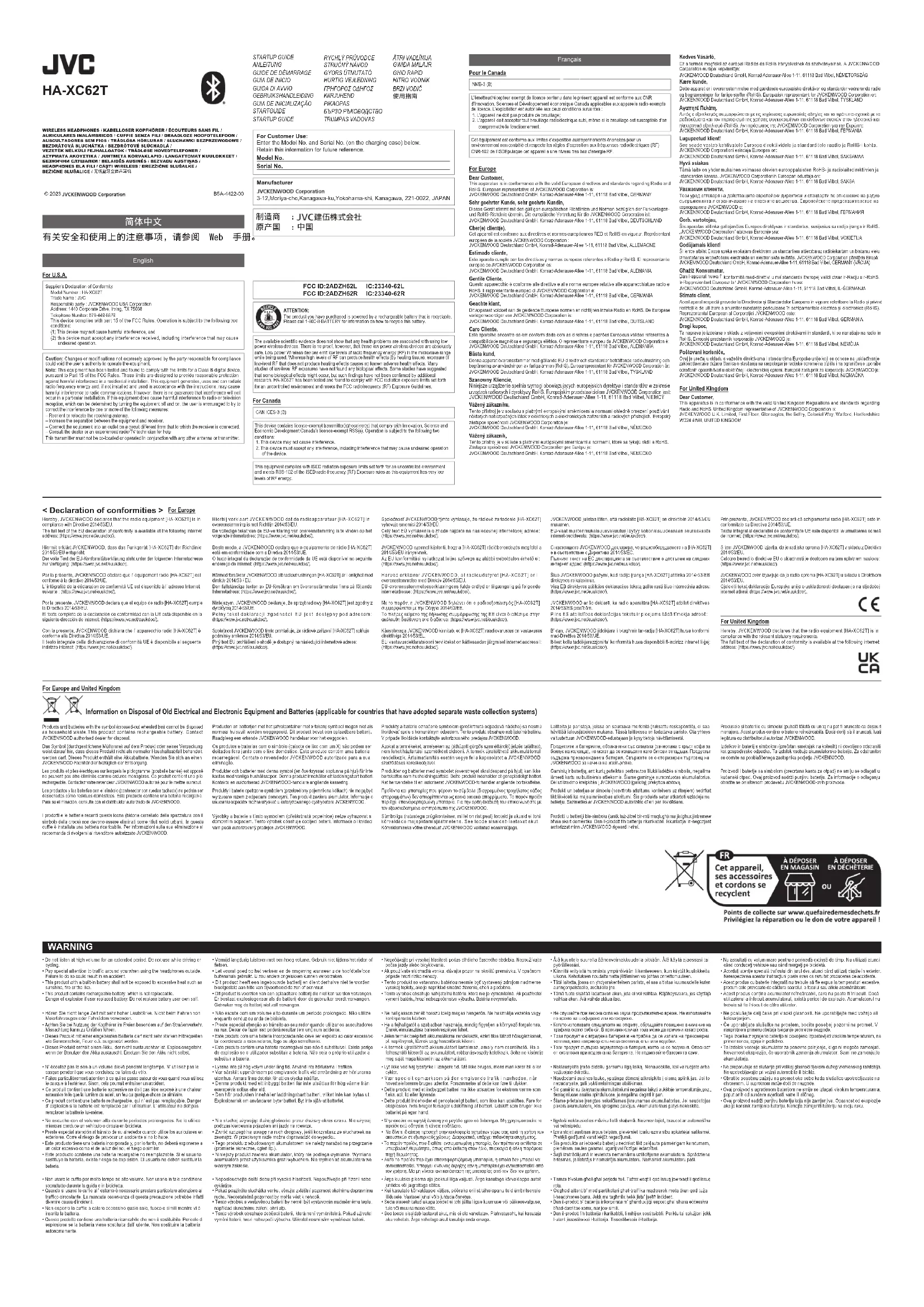 volum għoli għal ħinijiet twal.Pentru a preveni posibila deteriorare a auzului, nu ascultați la volum mare pentru perioade lungi de timp.Da se izognete poškodbam sluha, ne poslušajte dalj časa pri visoki glasnosti.Kako biste spriječili moguće oštećenje sluha, izbjegavajte dugotrajno slušanje pri visokoj glasnoći. WARNING Warnings for batteryPlease do not handle the battery in the following manners.It can lead to an explosion or leakage of flammable liquids and gases.• Dispose in fire, discard, crush or cut• Leave in extremely high temperature environment• Leave in extremely low pressure environmentWarnhinweise zur BatterieBitte behandeln Sie die Batterie nicht wie folgt.Das kann zu einer Explosion oder zum Austritt entflammbarer Flüssigkeiten und Gase führen.• Ins Feuer werfen, wegwerfen, zerbrechen oder aufschneiden• Bei extrem hohen Temperaturen liegen lassen• Bei extrem niedrigem Luftdruck liegen lassenOstrzeżenia dotyczące akumulatoraZ akumulatorem nie wolno obchodzić się w poniższy sposób.Może to doprowadzić do wybuchu lub wycieku łatwopalnych cieczy i gazów.• Spalać, wyrzucać, zgniatać lub ciąć Pozostawiać w środowisku o bardzo wysokiej temperaturze• Pozostawiać w środowisku o bardzo niskim ciśnieniuПредупреждения за батериятаМоля, не работете с батерията по следните начини.Може да доведе до експлозия или изтичане на запалими течности и газове. Не изхвърляйте в огън, не трошете или не нарязвайте• Не дръжте при изключително висока температура на околната среда• Не оставяйте в среда с изключително ниско наляганеPerspėjimai dėl akumuliatoriausNesielkite su akumuliatoriumi taip, kaip aprašyta toliau.Tai gali sukelti degių skysčių ir dujų sprogimą ar nutekėjimą.• Mesti į ugnį, naikinti, traiškyti arba pjaustyti• Palikti itin aukštos temperatūros aplinkoje• Palikti itin žemo slėgio aplinkojeBrīdinājumi par akumulatoruLūdzam neapieties ar akumulatoru tālāk norādītajos veidos.Tas var izraisīt viegli uzliesmojošu šķidrumu un gāzu eksploziju vai noplūdi. Iznīcināt, iemetot ugunī, izmetot, sasmalcinot vai sagriežot;• Atstāt ļoti vidē ar augstu temperatūru• Atstāt vidē ar ļoti zemu spiedienuTwissijiet rigward il-batterijaJekk jogħġbok tiħħendiljax il-batterija bil-modi li ġejjin.Tista twassal għal splużjoni jew tnixxija ta likwidi u gassijiet li jaqbdu.• Tarmiha fin-nar, twarrabha, tfarrakha jew tqattagħha• Tħalliha f ambjent b temperatura estremament għolja• Tħalliha f ambjent bi pressjoni estremament baxxaAvertismente privind bateriaNu manevrați bateria în următoarele moduri.Poate duce la explozia sau scurgerea lichidelor și a gazelor inflamabile.• Aruncați în foc, aruncați, zdrobiți sau tăiați• Lăsați în mediul de temperatură extrem de ridicată• Lăsați într-un mediu de presiune extrem de scăzutăOpozorila za baterijoProsimo, da z baterijo ne ravnate na naslednje načine.Lahko povzroči eksplozijo ali puščanje vnetljivih tekočin in plinov.• Ne odlagajte v ogenj, zavrzite, zdrobite ali režite• Ne pustite v okolju z zelo visokimi temperaturami• Ne pustite v okolju z zelo nizkim tlakomUpozorenja za baterijuMolimo, nemojte rukovati baterijom na sljedeće načine.To može dovesti do eksplozije ili istjecanja zapaljivih tekućina i plinova.• Bacati u vatru, odbacivati, razbijati ili rezati• Ostaviti u okruženju ekstremno visoke temperature• Ostaviti u okruženju ekstremno niskog tlakaVarování týkající se baterieS baterií nenakládejte následujícími způsoby.Mohlo by dojít k výbuchu nebo úniku hořlavých kapalin a plynů.• Vhození baterie do ohně, odhození, rozdrcení nebo rozříznutí baterie Ponechání baterie v prostředí s extrémně vysokou teplotou Ponechání baterie v prostředí s extrémně nízkým tlakemVarovania týkajúce sa batérieS batériou nemanipulujte nasledujúcimi spôsobmi.Mohlo by to viesť k výbuchu alebo úniku horľavých kvapalín a plynov.• Nezahadzujte do ohňa, nelikvidujte, nedrvte alebo nerežte• Nenechávajte v prostredí s extrémne vysokou teplotou• Nechávajte v prostredí s extrémne nízkym tlakomFigyelmeztetések az akkumulátorraKérjük, ne kezelje az akkumulátort az alábbi módon.Ez gyúlékony folyadékok és gázok robbanásához vagy szivárgásához vezethet.• Dobja tűzbe, dobja ki, törje össze vagy vágja szét• Hagyja extrém magas hőmérsékletű környezetben• Hagyja rendkívül alacsony nyomású környezetbenAdvarsler for batteriHåndtér ikke batteriet på følgende måder.Det kan føre til eksplosion i eller lækage af brændbare væsker og gasser.• Må ikke kasseres i åben ild, bortskaffes, knuses eller skæres i Må ikke efterlades på steder med meget høje temperaturer Må ikke efterlades på steder, der er under meget lavt trykΠροειδοποιήσεις για την μπαταρίαΜη χειρίζεστε την μπαταρία με τους παρακάτω τρόπους.Μπορεί να προκληθεί έκρηξη ή διαρροή εύφλεκτων υγρών και αερίων. Την αφήσετε στη φωτιά, την πετάξετε, τη σπάσετε ή κάψετε• Την αφήσετε σε εξαιρετικά υψηλή θερμοκρασία περιβάλλοντος• Την αφήσετε σε περιβάλλον με εξαιρετικά χαμηλή πίεσηAku hoiatusedPalun ärge käidelge akut järgmistel viisidel.See võib põhjustada tuleohtlike vedelike ja gaaside plahvatuse või lekke.• Põletades, visates ära, purustades või lõigates• Jättes väga kõrge temperatuuriga keskkonda• Jättes väga madala rõhuga k