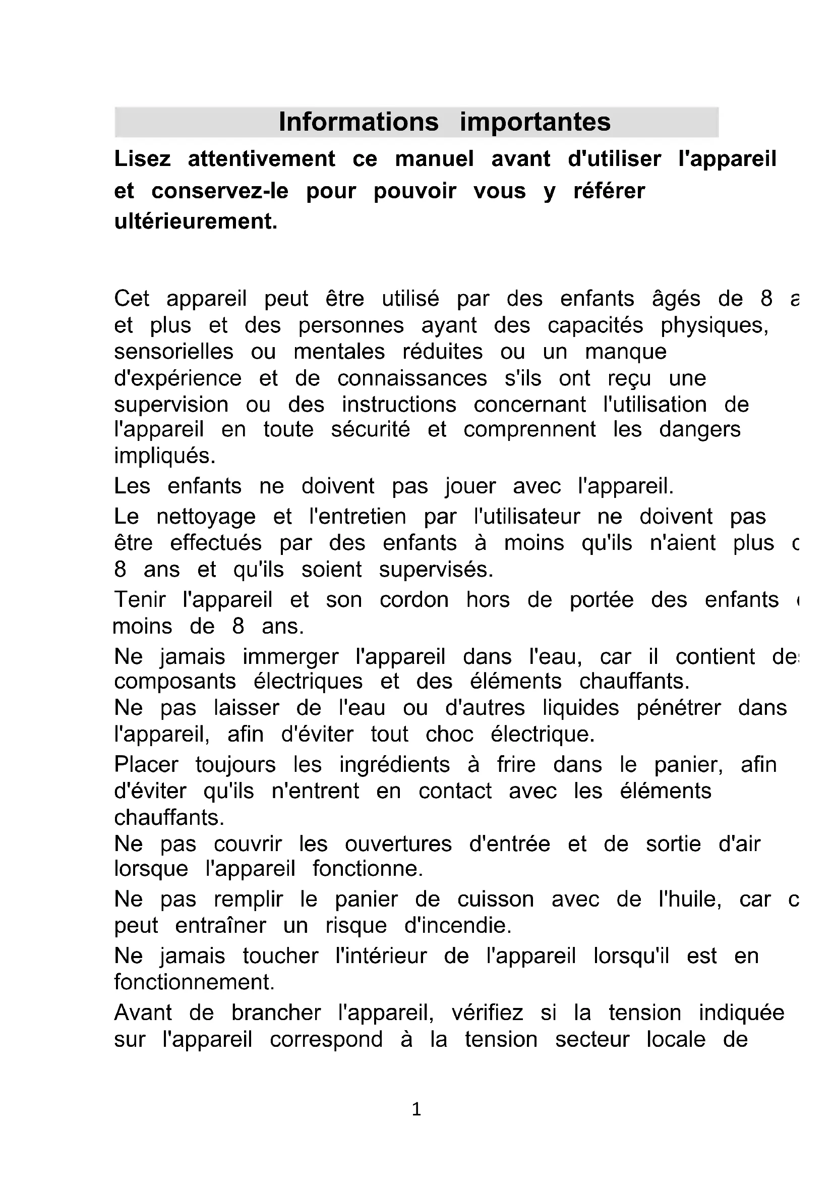 CEFRSH1400B Friteuse sans huile 4.5L1 Informations importantes Lisez attentivement ce manuel avant d'utiliser l'appareil et conservez-le pour pouvoir vous y référer ultérieurement. Cet appareil peut être utilisé par des enfants âgés de 8 ans et plus et des personnes ayant des capacités physiques, sensorielles ou mentales réduites ou un manque d'expérience et de connaissances s'ils ont reçu une supervision ou des instructions concernant l'utilisation de l'appareil en toute sécurité et comprennent les dangers impliqués. Les enfants ne doivent pas jouer avec l'appareil. Le nettoyage et l'entretien par l'utilisateur ne doivent pas être effectués par des enfants à moins qu'ils n'aient plus de 8 ans et qu'ils soient supervisés. Tenir l'appareil et son cordon hors de portée des enfants de moins de 8 ans. Ne jamais immerger l'appareil dans l'eau, car il contient des composants électriques et des éléments chauffants. Ne pas laisser de l'eau ou d'autres liquides pénétrer dans l'appareil, afin d'éviter tout choc électrique. Placer toujours les ingrédients à frire dans le panier, afin d'éviter qu'ils n'entrent en contact avec les éléments chauffants. Ne pas couvrir les ouvertures d'entrée et de sortie d'air lorsque l'appareil fonctionne. Ne pas remplir le panier de cuisson avec de l'huile, car cela peut entraîner un risque d'incendie. Ne jamais toucher l'intérieur de l'appareil lorsqu'il est en fonctionnement. Avant de brancher l'appareil, vérifiez si la tension indiquée sur l'appareil correspond à la tension secteur locale de2 votre pays. Ne pas utiliser l'appareil si la fiche, le cordon d'alimentation ou l'appareil lui-même est endommagé. Si le câble d'alimentation est endommagé, il doit être remplacé par le fabricant, son service après-vente ou des personnes de qualification similaire afin d'éviter un danger. Tenir l'appareil et son cordon d'alimentation hors de portée des enfants lorsque l'appareil est allumé ou en cours de refroidissement. Tenir le cordon principal à l'écart des surfaces chaudes. Ne pas brancher l'appareil ni utiliser le panneau de commande avec des mains mouillées. Ne brancher l'appareil que sur une prise murale reliée à la terre, et toujours s'assurer que la fiche est correctement insérée dans la prise murale. L'appareil n'est pas destiné à être utilisé au moyen d'une minuterie externe ou d'un système de télécommande séparé. Ne pas placer l'appareil sur ou à proximité de matériaux combustibles tels qu'une nappe ou des rideaux. Ne pas placer l'appareil contre un mur ou contre d'autres appareils. Laisser au moins 10 cm d'espace libre à l'arrière et sur les côtés et 10 cm d'espace libre au-dessus de l'appareil. Ne rien placer sur l'appareil. Ne pas utiliser l'appareil à d'autres fins que celles décrites dans ce manuel. Ne pas laisser l'appareil sans surveillance lorsqu'il fonctionne. Pendant la cuisson, de la vapeur chaude est libérée par les orifices d'évacuation d'air. Par conséquent, gardez vos mains et votre visage à une distance sûre de la vapeur et des orifices d'évacuation d'air. Faites attention à la vapeur et à l'air chauds lorsque vous retirez le panier de cuisson de l'appareil.3 La surface située sous l'appareil peut devenir chaude pendant l'utilisation. Débrancher immédiatement l'appareil si de la fumée noire s'échappe de l'appareil. Attendre que l'émission de fumée s'arrête avant de retirer le panier de cuisson de l'appareil. Cet appareil est conçu uniquement pour un usage domestique. Pour plus de détails sur le nettoyage des surfaces en contact avec les aliments, veuillez vous référer à la section « Nettoyage » de ce manuel. Attention - Placer l'appareil sur une surface horizontale et stable. - Toujours débrancher l'appareil après l'avoir utilisé. - Laisser refroidir l'appareil pendant environ 30 minutes avant de le manipuler ou de le nettoyer. - Retirer les restes d'aliments brûlés. - Si l'appareil n'est pas utilisé correctement ou s'il n'est pas utilisé conformément aux instructions du manuel d'utilisation, la garantie devient caduque et le vendeur n'est pas responsable des dommages qui pourraient être causés. Avant la première utilisation de votre friteuse sans huile