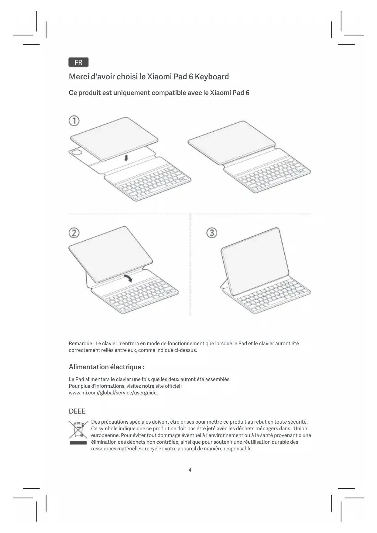 - N'utilisez pas votre appareil dans des endroits à forte humidité comme une salle de bain. afin d'éviter toute électrocution ou blessure ou tout incendie ou dégât sur le chargeur. Réglementations européennes Déclaration de conformité à la directive CEM Xiaomi Communications Co., Ltd. déclare par la présente que ce produit 23046KBD9S est conforme aux exigences fondamentales et aux autres dispositions relatives de la directive CEM 2014/30/UE. La déclaration de conformité applicable à l'UE est disponible en intégralité à l'adresse suivante : www.mi.com/en/certification Informations légales Cet appareil peut être utilisé dans tous les États membres de l'UE. Suivez les réglementations locales et nationales des régions dans lesquelles l'appareil est utilisé. 5Avis de non-responsabilité Ce guide de démarrage rapide est publié par Xiaomi ou sa filiale locale. Xiaomi se réserve le droit d'améliorer et de modifier à tout moment sans préavis ce manuel en cas d'erreurs typographiques, d'informations actuelles imprécises ou d'améliorations des programmes et/ou des équipements. Ces modifications seront toutefois intégrées dans les nouvelles éditions en ligne du guide de démarrage rapide (plus d'informations à l'adresse www.mi.com/global/service/userguide).Toutes les images sont utilisées à des fins d'illustration uniquement et peuvent ne pas représenter de manière précise l'appareil concerné. 6Vielen Dank, dass Sie sich für Xiaomi Pad 6 Keyboard entschieden haben Dieses Produkt ist nur mit dem Xiaomi Pad 6 kompatibel Hinweis: Die Tastatur wechselt erst dann in den Betriebsmodus, wenn das Pad und die Tastatur wie oben gezeigt korrekt miteinander verbunden wurden. Stromversorgung: Das Pad versorgt die Tastatur mit Strom, sobald beide miteinander verbunden wurden. Weitere Informationen finden Sie auf unserer offiziellen Website: www.mi.com/global/service/userguide WEEE-Richtlinie Zur sicheren Entsorgung dieses Produkts müssen besondere Vorsichtsmaßnahmen getroffen werden. Diese Kennzeichnung bedeutet, dass dieses Gerät in sämtlichen Mitgliedsstaaten der EU nicht mit dem normalen Hausmüll entsorgt werden darf. Um eine Verschmutzung der Umwelt und Gesundheitsrisiken für andere Personen durch unkontrollierte Müllentsorgung zu vermeiden und um eine nachhaltige Nutzung materieller Ressourcen zu ermöglichen, sollten Sie Ihre Abfälle verantwortungsbewusst wiederverwerten.