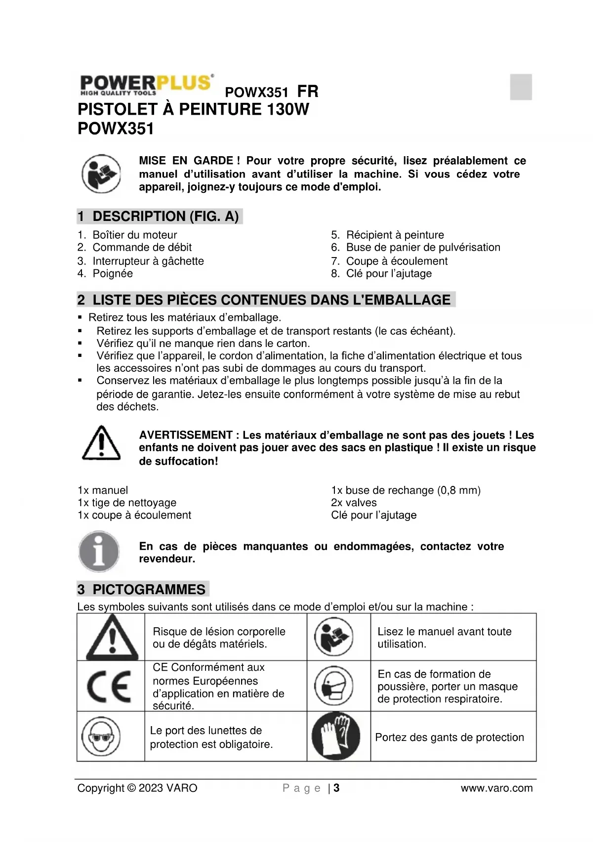 - Ne faites réparer votre outil électrique que par du personnel qualifié, au moyen de pièces de rechange d’origine uniquement, de manière à préserver la sécurité de l'appareil.POWX351 FR Copyright © 2023 VARO P a g e | 6 www.varo.com