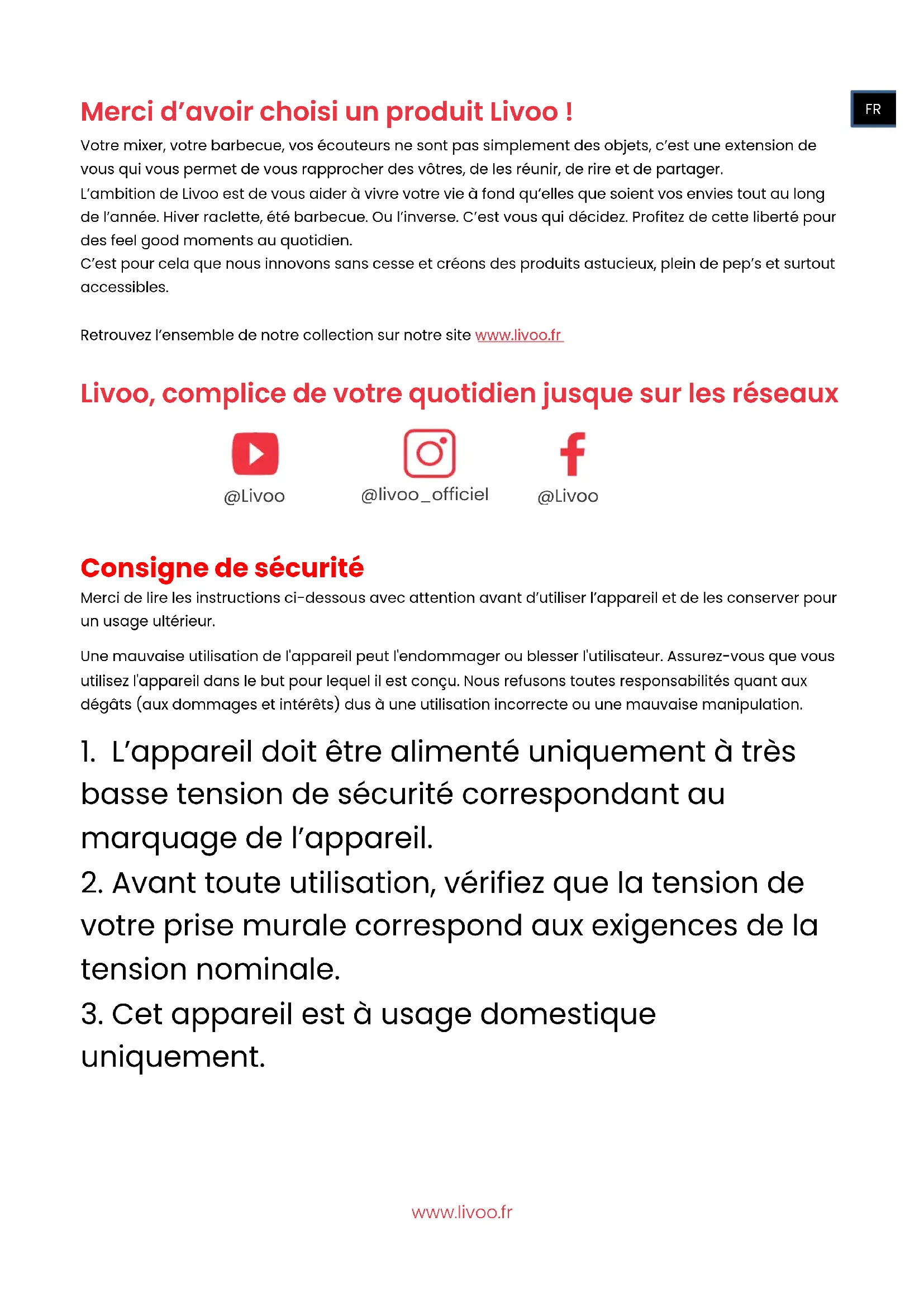 5www.livoo.fr Merci d’avoir choisi un produit Livoo ! Votre mixer, votre barbecue, vos écouteurs ne sont pas simplement des objets, c’est une extension de vous qui vous permet de vous rapprocher des vôtres, de les réunir, de rire et de partager. L’ambition de Livoo est de vous aider à vivre votre vie à fond qu’elles que soient vos envies tout au long de l’année. Hiver raclette, été barbecue. Ou l’inverse. C’est vous qui décidez. Profitez de cette liberté pour des feel good moments au quotidien. C’est pour cela que nous innovons sans cesse et créons des produits astucieux, plein de pep’s et surtout accessibles. Retrouvez l’ensemble de notre collection sur notre site www.livoo.fr Livoo, complice de votre quotidien jusque sur les réseaux