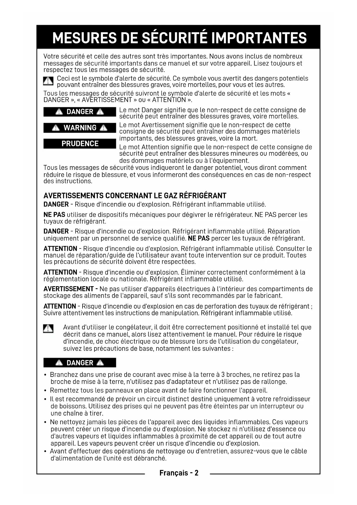 - Garantie -13 FrançaisMESURES DE SÉCURITÉ IMPORTANTES Votre sécurité et celle des autres sont très importantes. Nous avons inclus de nombreux messages de sécurité importants dans ce manuel et sur votre appareil. Lisez toujours et respectez tous les messages de sécurité. Ceci est le symbole d’alerte de sécurité. Ce symbole vous avertit des dangers potentiels pouvant entraîner des blessures graves, voire mortelles, pour vous et les autres. Tous les messages de sécurité suivront le symbole d’alerte de sécurité et les mots « DANGER », « AVERTISSEMENT » ou « ATTENTION ». DANGER DANGER WARNING PRUDENCE Tous les messages de sécurité vous indiqueront le danger potentiel, vous diront comment réduire le risque de blessure, et vous informeront des conséquences en cas de non-respect des instructions. Le mot Danger signifie que le non-respect de cette consigne de sécurité peut entraîner des blessures graves, voire mortelles. Le mot Avertissement signifie que le non-respect de cette consigne de sécurité peut entraîner des dommages matériels importants, des blessures graves, voire la mort. Le mot Attention signifie que le non-respect de cette consigne de sécurité peut entraîner des blessures mineures ou modérées, ou des dommages matériels ou à l’équipement. AVERTISSEMENTS CONCERNANT LE GAZ RÉFRIGÉRANT DANGER - Risque d’incendie ou d’explosion. Réfrigérant inflammable utilisé. NE PAS utiliser de dispositifs mécaniques pour dégivrer le réfrigérateur. NE PAS percer les tuyaux de réfrigérant. DANGER - Risque d’incendie ou d’explosion. Réfrigérant inflammable utilisé. Réparation uniquement par un personnel de service qualifié. NE PAS percer les tuyaux de réfrigérant. ATTENTION - Risque d’incendie ou d’explosion. Réfrigérant inflammable utilisé. Consulter le manuel de réparation/guide de l’utilisateur avant toute intervention sur ce produit. Toutes les précautions de sécurité doivent être respectées. ATTENTION - Risque d’incendie ou d’explosion. Éliminer correctement conformément à la réglementation locale ou nationale. Réfrigérant inflammable utilisé. AVERTISSEMENT - Ne pas utiliser d’appareils électriques à l’intérieur des compartiments de stockage des aliments de l’appareil, sauf s’ils sont recommandés par le fabricant. ATTENTION - Risque d’incendie ou d’explosion en cas de perforation des tuyaux de réfrigérant ; Suivre attentivement les instructions de manipulation. Réfrigérant inflammable utilisé. Avant d’utiliser le congélateur, il doit être correctement positionné et installé tel que décrit dans ce manuel, alors lisez attentivement le manuel. Pour réduire le risque d’incendie, de choc électrique ou de blessure lors de l’utilisation du congélateur, suivez les précautions de base, notamment les suivantes: p. 12