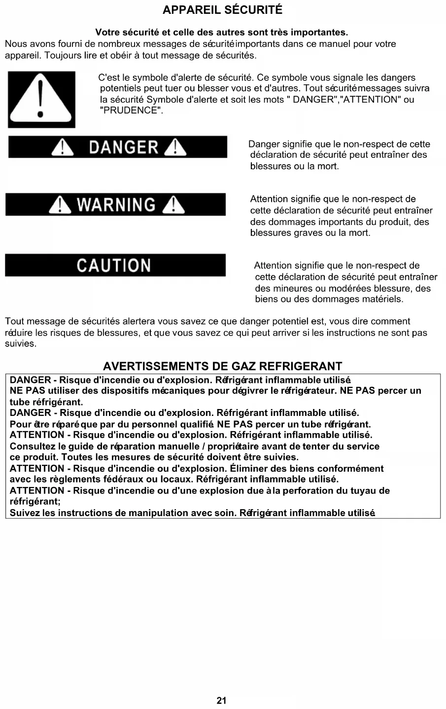 DANGER - Risque d'incendie ou d'explosion. Réfrigérant inflammable utilisé. NE PAS utiliser des dispositifs mécaniques pour dégivrer le réfrigérateur. NE PAS percer un tube réfrigérant. DANGER - Risque d'incendie ou d'explosion. Réfrigérant inflammable utilisé. Pour être réparé que par du personnel qualifié. NE PAS percer un tube réfrigérant. ATTENTION - Risque d'incendie ou d'explosion. Réfrigérant inflammable utilisé. Consultez le guide de réparation manuelle / propriétaire avant de tenter du service ce produit. Toutes les mesures de sécurité doivent être suivies. ATTENTION - Risque d'incendie ou d'explosion. Éliminer des biens conformément avec les règlements fédéraux ou locaux. Réfrigérant inflammable utilisé. ATTENTION - Risque d'incendie ou d'une explosion due à la perforation du tuyau de réfrigérant; Suivez les instructions de manipulation avec soin. Réfrigérant inflammable utilisé.22 Guides de sécurité importants Avant que le réfrigérateur soit utilisé, elle doit être correctement positionné et installé en tant que décrit dans ce manuel, afin de lire attentivement le manuel. Pour réduire le risque d'incendie, choc électrique ou de blessure lors de l'utilisation du réfrigérateur, suivez les précautions de base, comprenant les éléments suivants: