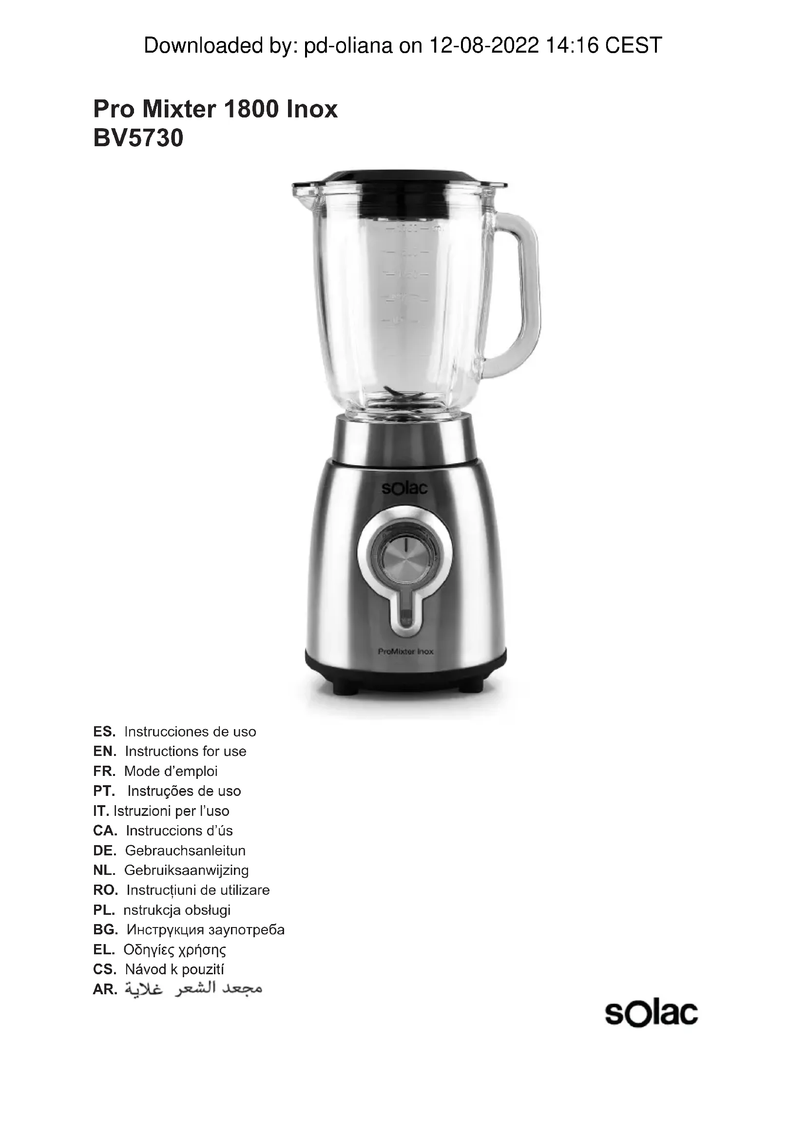 Téléchargez la notice de votre Blender au format PDF gratuitement ! Retrouvez votre notice Pro Mixter BV5730 - SOLAC et reprennez votre appareil électronique en main. Sur cette page sont publiés tous les documents nécessaires à l'utilisation de votre appareil Pro Mixter BV5730 de la marque SOLAC.