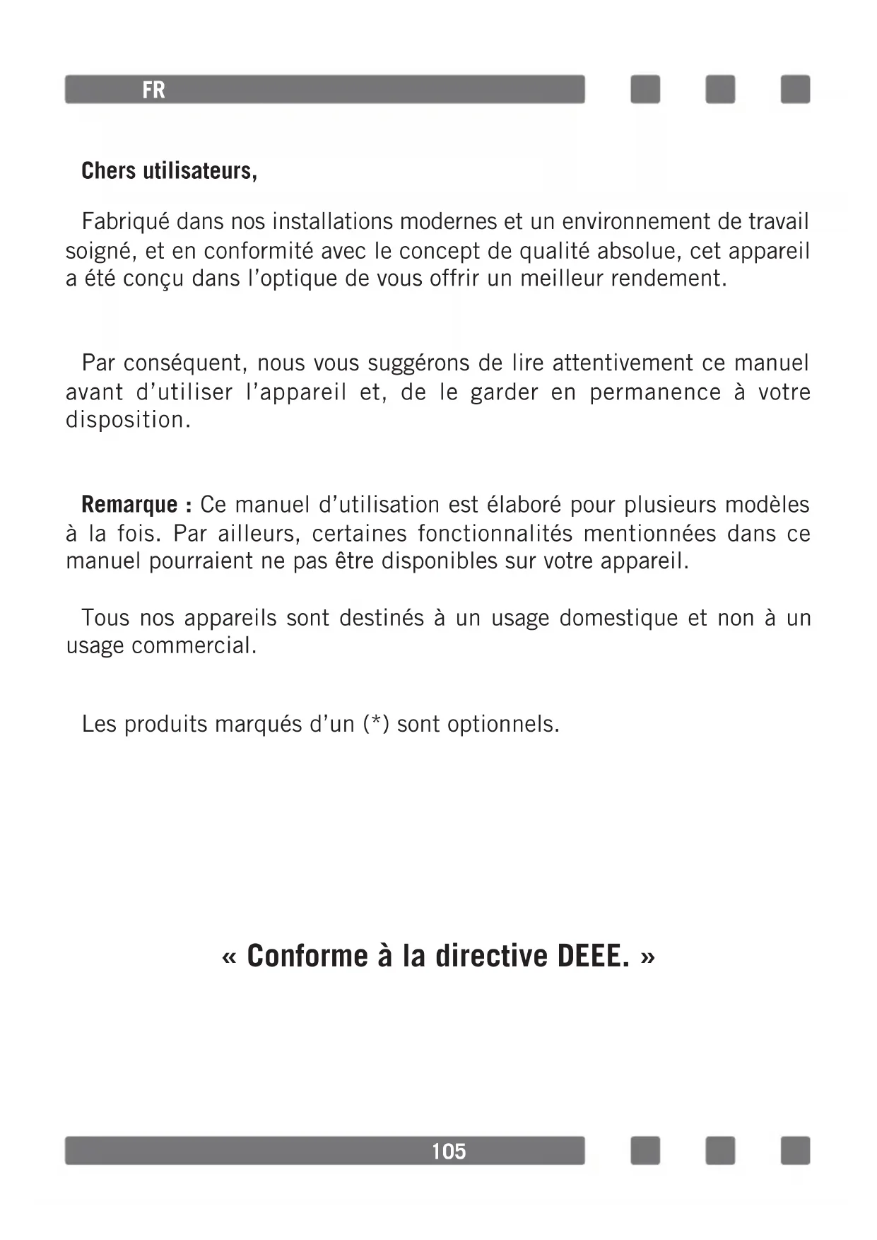 El embalaje del aparato se fabrica con materiales reciclables, de acuerdo con nuestro Reglamento Nacional sobre Medio Ambiente. No elimine los materiales de embalaje junto con los residuos domésticos o de otro tipo. Llévelos a uno de los puntos de reciclaje designado por las autoridades locales. ES105 Chers utilisateurs, Fabriqué dans nos installations modernes et un environnement de travail soigné, et en conformité avec le concept de qualité absolue, cet appareil a été conçu dans l’optique de vous offrir un meilleur rendement. Par conséquent, nous vous suggérons de lire attentivement ce manuel avant d’utiliser l’appareil et, de le garder en permanence à votre disposition. Remarque : Ce manuel d’utilisation est élaboré pour plusieurs modèles à la fois. Par ailleurs, certaines fonctionnalités mentionnées dans ce manuel pourraient ne pas être disponibles sur votre appareil. Tous nos appareils sont destinés à un usage domestique et non à un usage commercial. Les produits marqués d’un (*) sont optionnels. « Conforme à la directive DEEE. » FR106 Table des matieres Avertissements importants 107 Méthodes de protection de la surface de cuisson en vitrocéramique 117 Connexion electrique 118 Présentation de l'appareil 119 Accessoires 120 Caractéristiques techniques de votre four 121 Installation de votre four 122 Illustration d'arrimage de chaîne 124 Panneau de commande 124 Utilisation de la section de four 125 Utilisation du grill 126 Utilisation de la rôtissoire pour poulet 126 Utilisation de la table de cuisson 127 Types de programmes 129 Tableau de cuisson 130 Maintenance et nettoyage 131 Assemblage de la porte du four 132 Nettoyage et maintenance de la vitre avant du four 133 Parois catalytiques 133 Positions de la grille 134 Remplacement de l'ampoule du four 134 Utilisation de la feuille de déecteur de grill 135 Dépannage 136 Règles de manutention 138 Recommandations pour économiser l’énergie 138 Mise au rebut respectueuse de l'environnement 139 Informations relatives à l'emballage 139107 AVERTISSEMENTS IMPORTANTS
