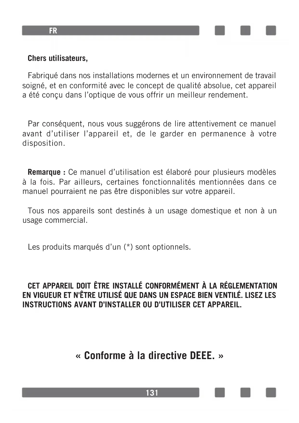 El embalaje del aparato se fabrica con materiales reciclables, de acuerdo con nuestro Reglamento Nacional sobre Medio Ambiente. No elimine los materiales de embalaje junto con los residuos domésticos o de otro tipo. Llévelos a uno de los puntos de reciclaje designado por las autoridades locales. ES131 Chers utilisateurs, Fabriqué dans nos installations modernes et un environnement de travail soigné, et en conformité avec le concept de qualité absolue, cet appareil a été conçu dans l’optique de vous offrir un meilleur rendement. Par conséquent, nous vous suggérons de lire attentivement ce manuel avant d’utiliser l’appareil et, de le garder en permanence à votre disposition. Remarque : Ce manuel d’utilisation est élaboré pour plusieurs modèles à la fois. Par ailleurs, certaines fonctionnalités mentionnées dans ce manuel pourraient ne pas être disponibles sur votre appareil. Tous nos appareils sont destinés à un usage domestique et non à un usage commercial. Les produits marqués d’un (*) sont optionnels. CET APPAREIL DOIT ÊTRE INSTALLÉ CONFORMÉMENT À LA RÉGLEMENTATION EN VIGUEUR ET N'ÊTRE UTILISÉ QUE DANS UN ESPACE BIEN VENTILÉ. LISEZ LES INSTRUCTIONS AVANT D’INSTALLER OU D’UTILISER CET APPAREIL. « Conforme à la directive DEEE. » FR132 Table des matieres Avertissements importants 133 Connexion electrique 146 Connexion de gaz 147 Présentation de l'appareil 152 Accessoires 153 Caractéristiques techniques de votre four 154 Installation de votre four 157 Illustration d'arrimage de chaîne 159 Panneau de commande 159 Utilisation de la section de four 160 Utilisation du grill 161 Utilisation de la rôtissoire pour poulet 161 Utilisation de la table de cuisson 162 Types de programmes 164 Tableau de cuisson 165 Maintenance et nettoyage 166 Assemblage de la porte du four 167 Nettoyage et maintenance de la vitre avant du four 168 Parois catalytiques 168 Positions de la grille 169 Remplacement de l'ampoule du four 169 Utilisation de la feuille de déecteur de grill 170 Dépannage 171 Règles de manutention 173 Recommandations pour économiser l’énergie 173 Mise au rebut respectueuse de l'environnement 174 Informations relatives à l'emballage 174 FR133 AVERTISSEMENTS IMPORTANTS