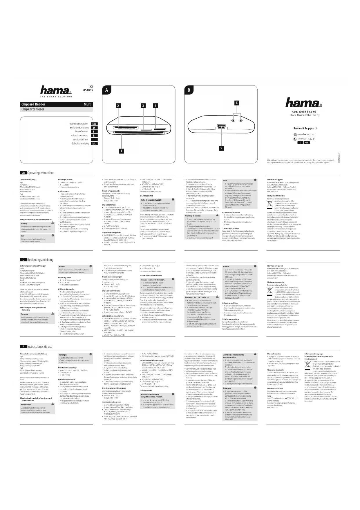 - Stecken Sie IhreSpeicher-oder Chipkarte in den entsprechenden Einschub des Multi-Kartenlesers(1, 2, 3, 4). Bei erfolgreicher Verbindung leuchtetdie linke LED-Kontrollleuchte blau und die rechtepink auf (6).•Während des Datentransfers blinkt die pinkeLED-Kontrollleuchte.•Esist nicht möglich, Daten zwischen zweigleichzeitig im Multi-Kartenleser verwendetenSpeicherkarten auszutauschen (Hot Swapping).•Zwischen einer Chipkarte und einer gleichzeitiggesteckten Speicherkarte ist in der Regel ebensokein Datenaustausch möglich.Warnung –Datenverlust•Bevor Sie eine Speicherkarte aus demKartenleser entnehmen, vergewissern Sie sich,dass der Datentransfer beendet ist.•Entfernen Sie den Wechseldatenträgerimmer über die AuswurffunktionIhres Betriebssystems, bevor Sie dasSpeichermedium aus dem Kartenleserentnehmen oder den Kartenleser (miteingestecktem Speichermedium) von IhremEndgerät trennen.•Bei Nichtbeachtung kann Datenverlust nichtausgeschlossen werden!Hinweis•Umdie maximale Datenübertragung beiSD-Karten und microSD-Karten zu erhalten,muss das eingesetzte Speichermedium UHS-I-fähig sein.•Der größte Teil der Karten im SDXC Formatsind mit dem Dateisystem exFAT formatiert.Dieses wirdnur von den BetriebssystemenWindows Vista (ab SP1)/7/8 und Mac OS10.6.5 (oder neuer) unterstützt.•UmSDXC Karten mit exFAT Formatierungauch unter Windows XP nutzen zu können,benötigen Sie mind. XP SP2 und das exFATUpdate von Microsoft.6. Wartung und Pflege•Reinigen Sie dieses Produkt nur mit einemfusselfreien, leicht feuchten Tuch und verwendenSie keine aggressiven Reiniger.•Achten sie darauf,dass kein Wasser in dasProdukt eindringt.7. HaftungsausschlussReinigen Sie dieses Produkt nur mit einemfusselfreien, leicht feuchten Tuch und verwenden Sie keine aggressiven Reiniger.Achten sie darauf,dass kein Wasser in das Produkt eindringt.8. Service und SupportBitte wenden Sie sich bei Fragen zum Produkt gernean die Hama-Produktberatung.Hotline: +49 9091 502-115 (Deu/Eng) WeitereSupportinformationen nden sie hier: www.hama.com9. EntsorgungshinweiseHinweis zum Umweltschutz:Ab dem Zeitpunkt der Umsetzung dereuropäischen Richtlinien 2012/19/EUund 2006/66/EG in nationales Recht giltfolgendes: Elektrische und elektronischeGeräte sowie Batterien dürfen nicht mitdem Hausmüll entsorgt werden. Der Verbraucher istgesetzlich verpichtet, elektrische und elektronischeGeräte sowie Batterien am Ende ihrer Lebensdaueran den dafür eingerichteten, öffentlichenSammelstellen oder an die Verkaufsstellezurückzugeben. Einzelheiten dazu regelt dasjeweilige Landesrecht. Das Symbol auf dem Produkt,der Gebrauchsanleitung oder der Verpackung weistauf diese Bestimmungen hin. Mit derWiederverwertung, der stoichen Verwertung oderanderen Formen der Verwertung von Altgeräten/Batterien leisten Sie einen wichtigen Beitrag zumSchutz unserer Umwelt.Éléments de commande et d'affichageFig. A1. Emplacement pour cartes àpuce2. Emplacement pour cartes SD/MMC/MS/XD3. Emplacement pour cartes microSD4. Emplacement pour cartes M2Fig. B5. Port USB pour câble de connexion6. LED d’état pour l’accès àlacarteNous vous remercions d’avoir choisi un produitHama. Veuillez prendreletemps de lirel‘ensemble des remarques et consignes suivantes. Veuillezconserver ce mode d‘emploi àportée de mainandepouvoir le consulter en cas de besoin.Transmettez-le au nouveau propriétaireavecl’appareil le cas échéant.1. Explication des symboles d‘avertissementet des remarquesAvertissementCe symbole est utilisé pour indiquer desconsignes de sécurité ou pour attirer votreattention sur des dangers et risques particuliers.RemarqueCe symbole est utilisé pour indiquer desinformations supplémentaires ou des remarquesimportantes.2. Contenu de l'emballage