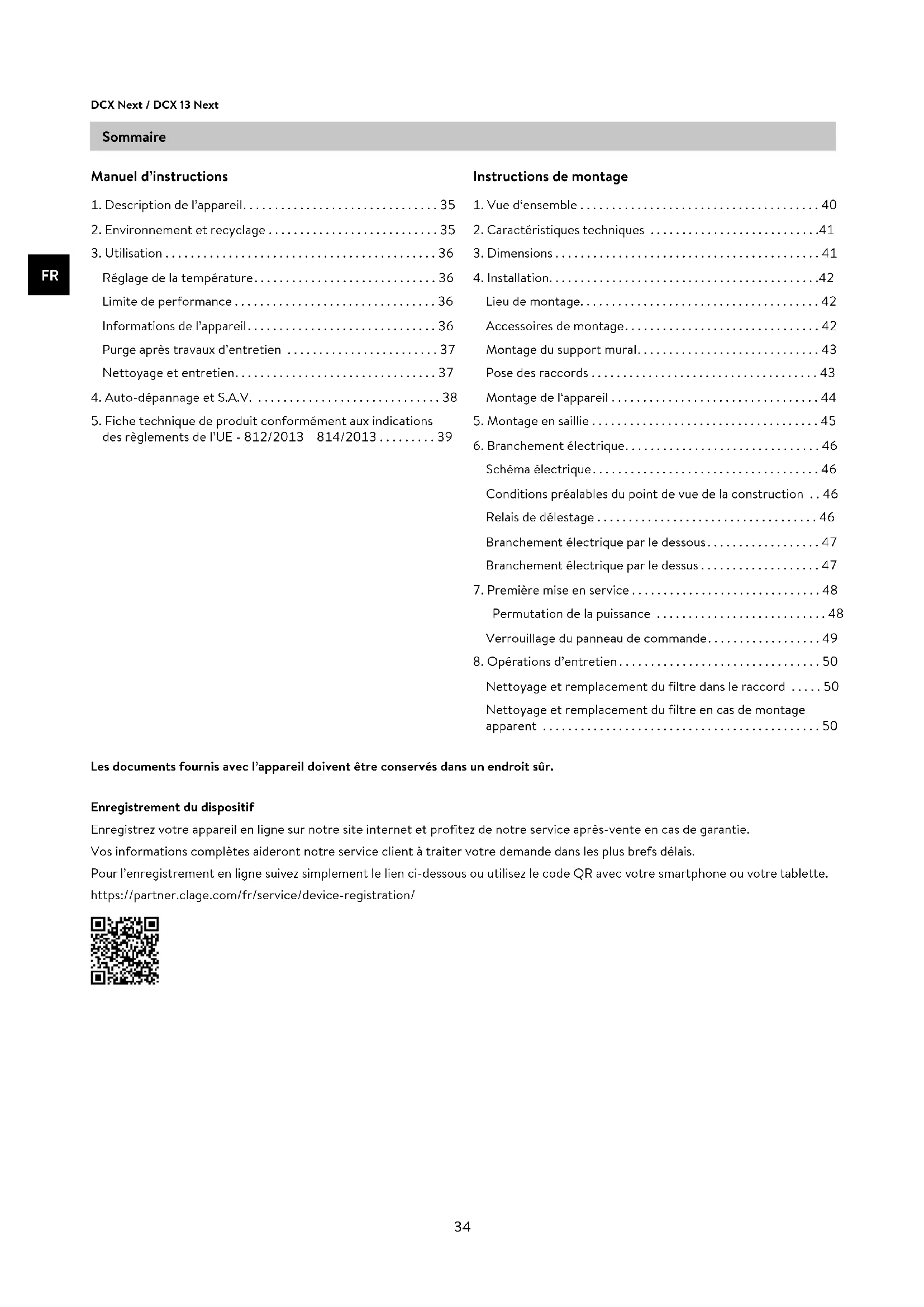 Sommaire Enregistrement du dispositif Enregistrez votre appareil en ligne sur notre site internet et profitez de notre service après-vente en cas de garantie. Vos informations complètes aideront notre service client à traiter votre demande dans les plus brefs délais. Pour l’enregistrement en ligne suivez simplement le lien ci-dessous ou utilisez le code QR avec votre smartphone ou votre tablette. https://partner.clage.com/fr/service/device-registration/ Manuel d’instructions . Description de l’appareil ................................. Environnement et recyclage ............................. Utilisation ........................................... Réglage de la température ............................. Limite de performance ................................ Informations de l’appareil .............................. Purge après travaux d’entretien ........................ Nettoyage et entretien .................................. Auto-dépannage et S.A.V................................. Fiche technique de produit conformément aux indications des règlements de l’UE - / / ......... Instructions de montage . Vue d‘ensemble ........................................ Caractéristiques techniques ............................. Dimensions ............................................ Installation... Lieu de montage ...................................... Accessoires de montage ............................... Montage du support mural ............................. Pose des raccords .................................... Montage de l‘appareil ................................... Montage en saillie ...................................... Branchement électrique ............................... Schéma électrique .................................... Conditions préalables du point de vue de la construction .. Relais de délestage ................................... Branchement électrique par le dessous .................. Branchement électrique par le dessus ..................... Première mise en service .............................. Permutation de la puissance ........................... Verrouillage du panneau de commande .................... Opérations d’entretien ................................ Nettoyage et remplacement du filtre dans le raccord ..... Nettoyage et remplacement du filtre en cas de montage apparent ............................................ Les documents fournis avec l’appareil doivent être conservés dans un endroit sûr.CLAGE