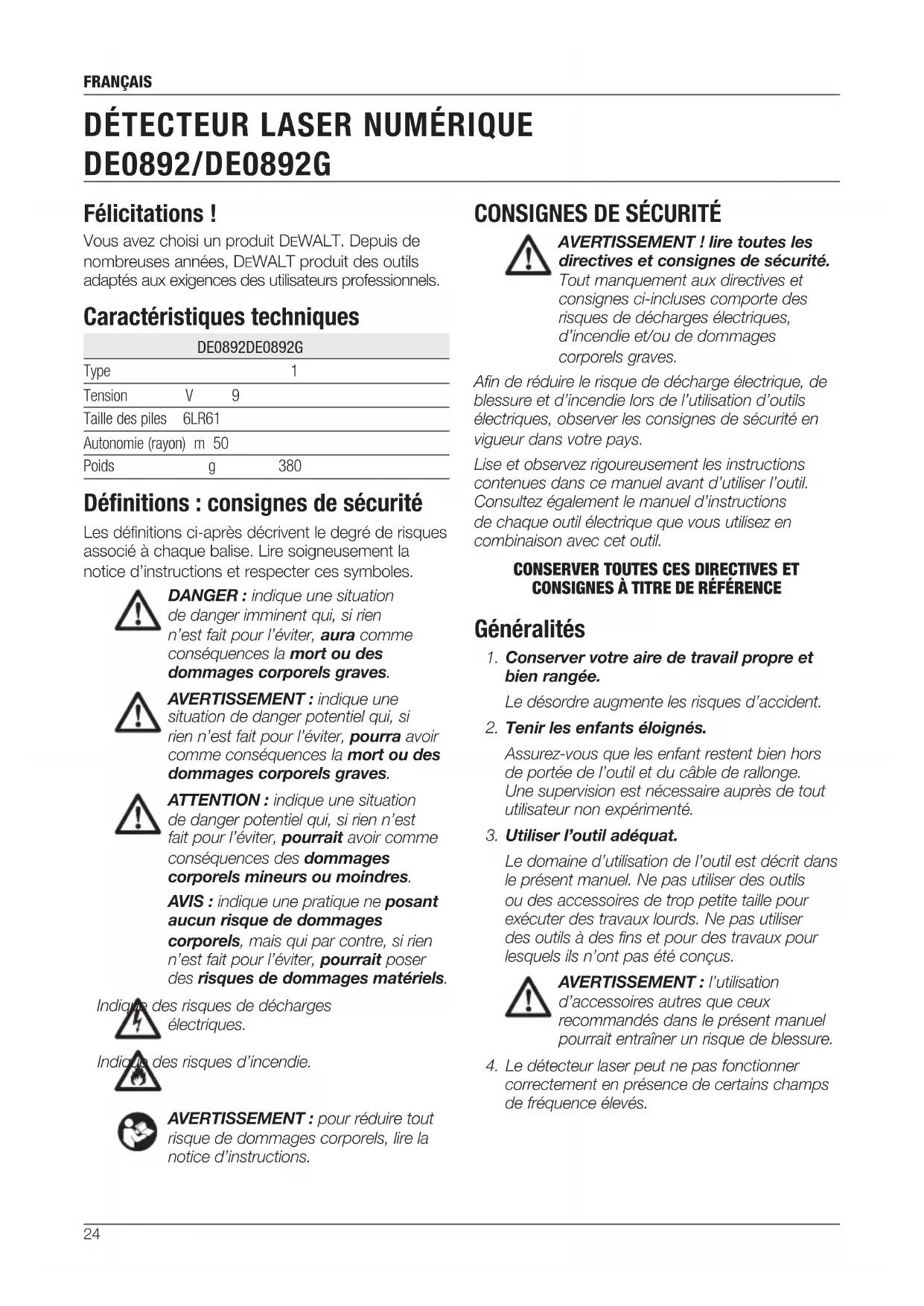 DE0892/DE0892G Félicitations! Vous avez choisi un produit DeWALT. Depuis de nombreuses années, DeWALT produit des outils adaptés aux exigences des utilisateurs professionnels. Caractéristiques techniques DE0892DE0892G Type 1 Tension V 9 Taille des piles 6LR61 Autonomie (rayon) m 50 Poids g 380 Définitions: consignes de sécurité Les définitions ci-après décrivent le degré de risques associé à chaque balise. Lire soigneusement la notice d’instructions et respecter ces symboles.