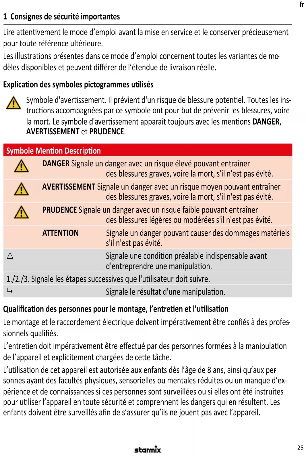 Signale le résultat d'une manipulaon. Qualicaon des personnes pour le montage, l’entreen et l’ulisaon Le montage et le raccordement électrique doivent impéravement être conés à des profes