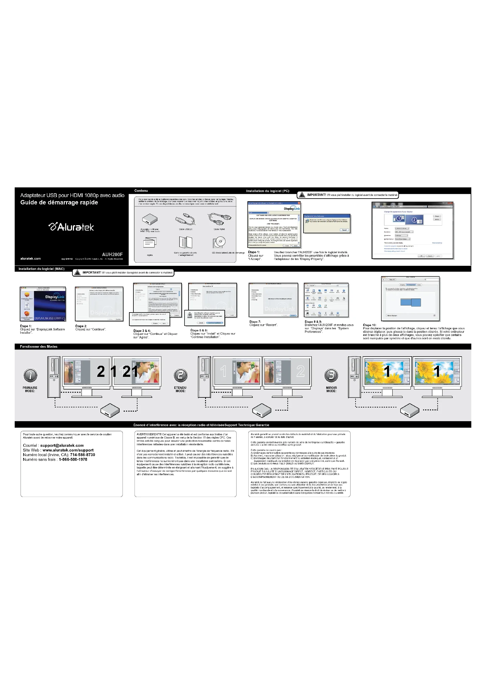 Fonctionner des Modes Adaptateur USB pour HDMI 1080p avec audio qsg Q10192 Copyright © 2010 Aluratek, Inc. All Rights Reserved.aluratek.com Guide de démarrage rapide AUH200F PRIMAIRE MODE: ÉTENDU MODE: MIROIR MODE: