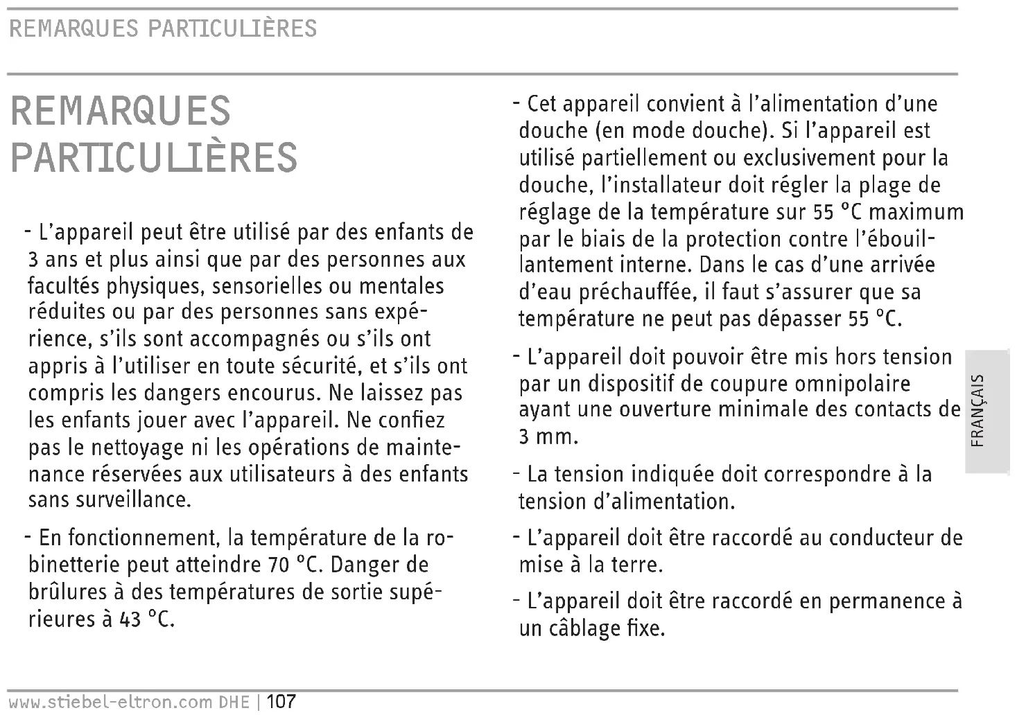 GARANTIE PROTECTION DE L’ENVIRONNEMENT ET RECYCLAGEwww.stiebel-eltron.com DHE | 107 REMARquES PARTICuLIÈRES FRANÇAIS REMARquES PARTICuLIÈRES - L’appareil peut être utilisé par des enfants de 3ans et plus ainsi que par des personnes aux facultés physiques, sensorielles ou mentales réduites ou par des personnes sans expé- rience, s’ils sont accompagnés ou s’ils ont appris à l’utiliser en toute sécurité, et s’ils ont compris les dangers encourus. Ne laissez pas les enfants jouer avec l’appareil. Ne confiez pas le nettoyage ni les opérations de mainte- nance réservées aux utilisateurs à des enfants sans surveillance. - En fonctionnement, la température de la ro- binetterie peut atteindre 70°C. Danger de brûlures à des températures de sortie supé- rieures à 43°C. - Cet appareil convient à l’alimentation d’une douche (en mode douche). Si l’appareil est utilisé partiellement ou exclusivement pour la douche, l’installateur doit régler la plage de réglage de la température sur 55°C maximum par le biais de la protection contre l’ébouil- lantement interne. Dans le cas d’une arrivée d’eau préchauffée, il faut s’assurer que sa température ne peut pas dépasser 55°C. - L’appareil doit pouvoir être mis hors tension par un dispositif de coupure omnipolaire ayant une ouverture minimale des contacts de 3mm. - La tension indiquée doit correspondre à la tension d’alimentation. - L’appareil doit être raccordé au conducteur de mise à la terre. - L’appareil doit être raccordé en permanence à un câblage fixe.UTILISATION Remarques générales 108 | DHE www.stiebel-eltron.com - Fixez l’appareil comme indiqué dans le cha- pitre «Installation/ Montage». - Tenez compte de la pression maximale admis- sible (voir le chapitre «Installation/ Données techniques/ Tableau de données»). - La résistance hydraulique spécifique du ré- seau de distribution d’eau ne doit pas être dépassée (voir le chapitre «Installation/ Don- nées techniques/ Tableau de données»). - Vidangez l’appareil comme indiqué au cha- pitre «Installation/ Maintenance / Vidange de l’appareil». UTILISATION