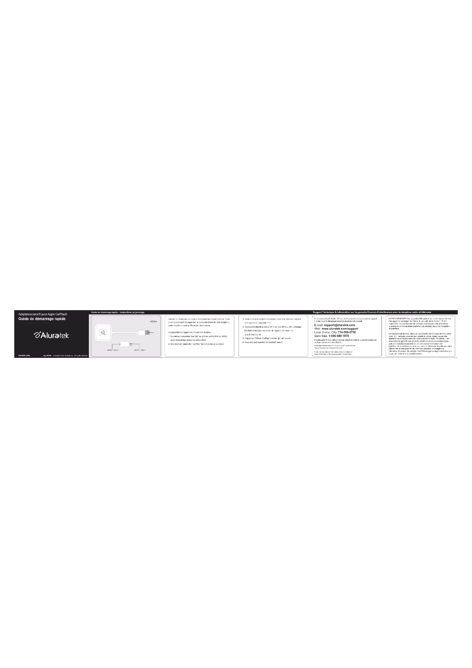 Pour plus d'informations, s'il vous plaît visitez le site:https://aluratek.com/pages/warrantyVous pouvez enregistrer votre produit en ligne à:https://aluratek.com/pages/product-registration E-mail: support@aluratek.com Web: www.aluratek.com/support Local (Irvine, CA): 714-586-8730 Sans frais: 1-866-580-1978 Aluratek garantit ce produit contre tout défaut de matériel ou de fabrication pour les 1 an à partir de la date d'achat.Si vous avez besoin d'aide, s'il vous plaît contacter le département de support Aluratek pour le dépannage avant de retourner cet appareil. Adaptateur sans fil pour Apple CarPlay® Guide de démarrage rapide qsg Q10644 Copyright © 2023 Aluratek, Inc. All Rights Reserved.aluratek.com Guide de démarrage rapide Instructions de jumelage Veuillez vous assurer que votre voiture prend en charge CarPlay filaire. Il est recommandé de supprimer la connexion Bluetooth si le téléphonea été couplé/connecté au Bluetooth de la voiture.Les procédures d'appariement sont les suivantes.1. Connectez l'adaptateur CarPlay sans fil au port USB-A ou USB-C (avec l'adaptateur inclus) de votre voiture2. Sélectionnez l'application CarPlay dans le menu de la voiture3. Votre voiture reconnaîtra l'adaptateur sans fil et affichera l'appareil nom sur l'écran (Aluratek-****)4. Activez la fonction Bluetooth et Wi-Fi de votre iPhone. Aller à Réglage Bluetooth et sélectionnez le nom de l'appareil (Aluratek-****) quand il est trouvé5. Cliquez sur "Utiliser CarPlay" une fois qu'il est couplé6. Vous êtes prêt à profiter de CarPlay sans fil Support Technique & Information sur la garantie Énoncé d’interférence avec la réception radio et télévisée AVERTISSEMENT!!! Cet appareil a été testé et est conforme aux limites d’un appareil numérique de Classe B, en vertu de la Section 15 des règles CFC. Ces limites ont été conçues pour assurer une protection raisonnable contre de telles interférences néfastes dans une installation résidentielle. Cet équipement génère, utilise et peut émettre de l’énergie de fréquence radio. S’il n’est pas correctement installé et utilisé, il peut causer des interférences nuisibles dans les communications radio. Toutefois, il est impossible de garantir que de telles interférences ne surviendront pas dans une installation particulière. Si cet équipement cause des interférences nuisibles à la réception radio ou télévisée, laquelle peut être déterminée en éteignant et allumant l’équipement, on suggère à l’utilisateur d’essayer de corriger l’interférence par quelques mesures que ce soit afin d’éliminer les interférences.