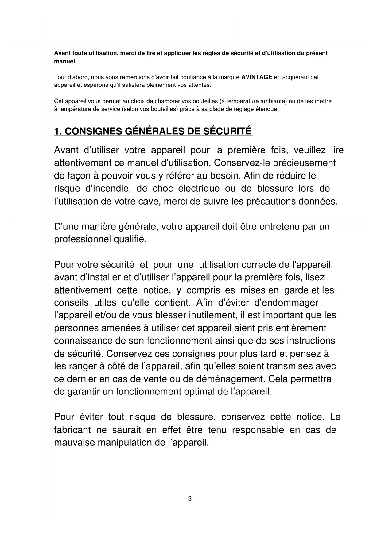 Avant toute utilisation, merci de lire et appliquer les règles de sécurité et d'utilisation du présent manuel. Tout d’abord, nous vous remercions d’avoir fait confiance à la marque AVINTAGE en acquérant cet appareil et espérons qu’il satisfera pleinement vos attentes. Cet appareil vous permet au choix de chambrer vos bouteilles (à température ambiante) ou de les mettre à température de service (selon vos bouteilles) grâce à sa plage de réglage étendue.