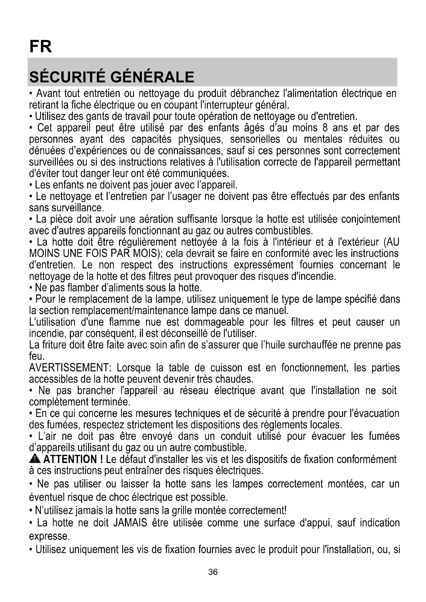 - La hotte ne doit JAMAIS être utilisée comme une surface d'appui, sauf indication expresse.