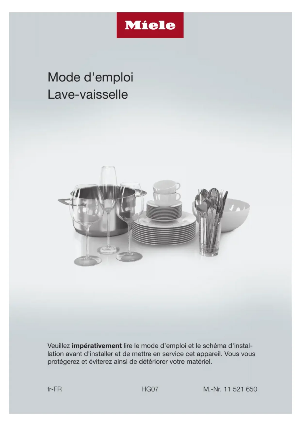 Nous vous conseillons de remplacer les composants défectueux par des pièces détachées d'origine. Si les pièces de rechange d'ori- gine sont correctement installées, Miele garantit le respect total des exigences de sécurité et les demandes de garantie restent valables. Il faut débrancher l'appareil du réseau électrique en cas de tra- vaux d'installation, d'entretien et de réparation (arrêter le lave-vais- selle puis débrancher sa prise). Un câble d'alimentation abîmé ne doit être remplacé que par un câble spécial du même type (disponible auprès du SAV Miele). Pour des raisons de sécurité, seul un professionnel agréé par Miele ou le service après-vente Miele doit se charger de l'échange. Installation conforme Effectuez l'installation et le raccordement de votre lave-vaisselle conformément à la notice de montage. Soyez prudents avant et pendant le montage du lave- vaisselle. Certains éléments métalliques peuvent être cou- pants et causer des blessures. Portez des gants de protec- tion. Le lave-vaisselle doit être installé d'aplomb afin de garantir un fonctionnement optimal. Afin de garantir leur stabilité, les lave-vaisselle intégrables et en- castrables doivent uniquement être installés sous un plan de travail continu, vissé aux meubles voisins. L'installation du lave-vaisselle dans un meuble haut n'est autori- sée qu'avec des mesures de sécurité supplémentaires. Pour une ins- tallation sûre du meuble haut, utilisez un «kit d'installation du meuble haut» et respectez le schéma d'installation joint. Le meuble risque sinon de basculer.Consignes de sécurité et mises en garde