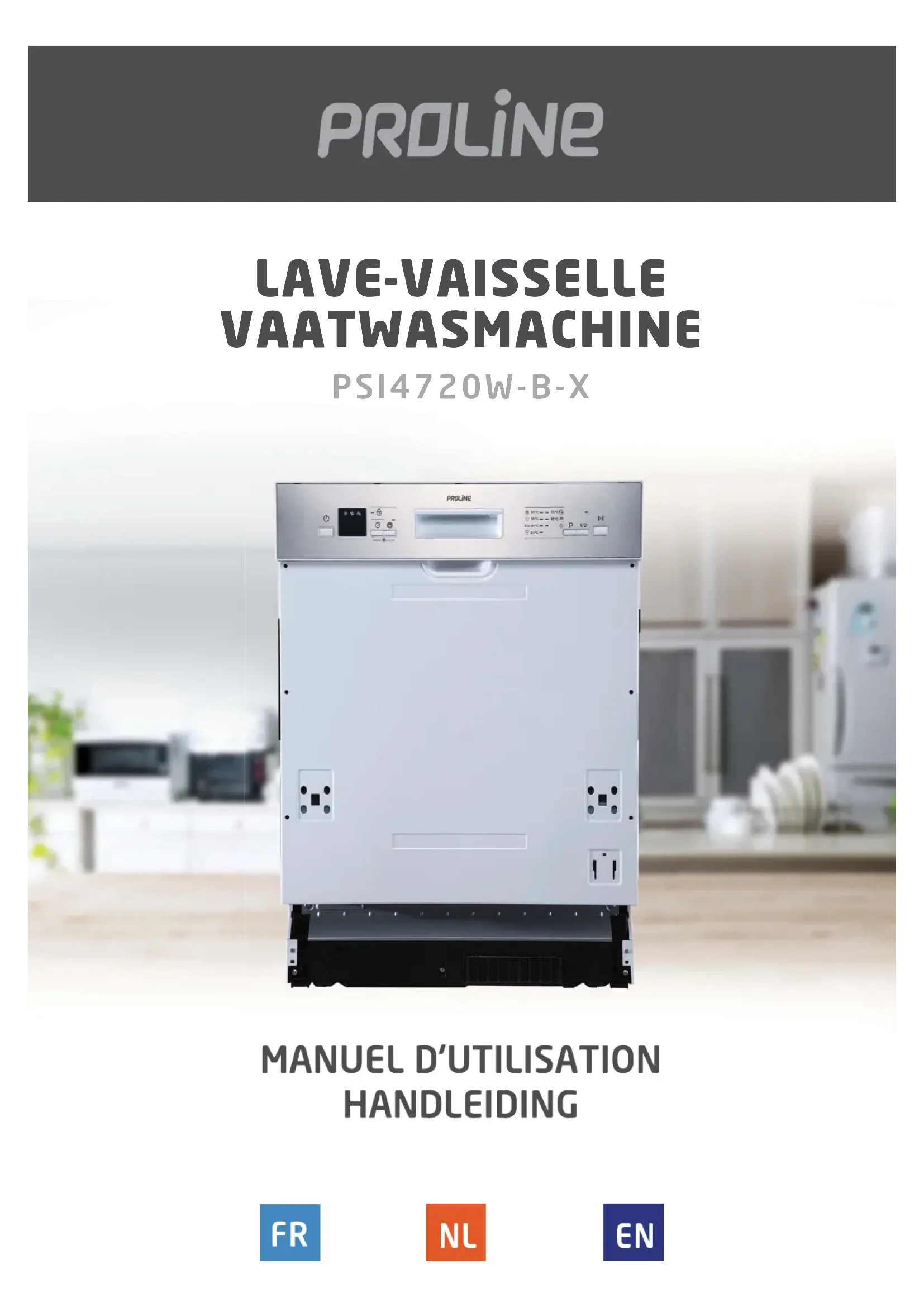 Débordement. Certaines pièces du lave-vaisselle fuient. AVERTISSEMENTS ! Au cas où l’eau déborderait, coupez l’arrivée d’eau avant d’appeler le réparateur.37 FICHE PRODUIT La fiche produit de ce lave-vaisselle a été configurée conformément au règlement UE n° 1059/2010. Marque PROLINE Modèle PSI4720W-B-X Nombre de couverts (capacité)