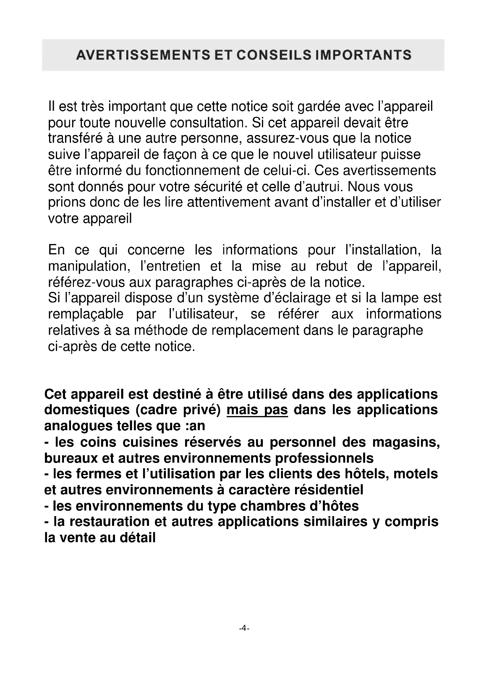 Il est très important que cette notice soit gardée avec l’appareil pour toute nouvelle consultation. Si cet appareil devait être transféré à une autre personne, assurez-vous que la notice suive l’appareil de façon à ce que le nouvel utilisateur puisse être informé du fonctionnement de celui-ci. Ces avertissements sont donnés pour votre sécurité et celle d’autrui. Nous vous prions donc de les lire attentivement avant d’installer et d’utiliser votre appareil En ce qui concerne les informations pour l’installation, la manipulation, l’entretien et la mise au rebut de l’appareil, référez-vous aux paragraphes ci- après de la notice. Si l’appareil dispose d’un système d’éclairage et si la lampe est remplaçable par l’utilisateur, se référer aux informations relatives à sa méthode de remplacement dans le paragraphe ci-après de cette notice. Cet appareil est destiné à être utilisé dans des applications domestiques (cadre privé) mais pas dans les applications analogues telles que :an - les coins cuisines réservés au personnel des magasins, bureaux et autres environnements professionnels - les fermes et l’utilisation par les clients des hôtels, motels et autres environnements à caractère résidentiel - les environnements du type chambres d’hôtes - la restauration et autres applications similaires y compris la vente au détail 4Cet appareil est destiné au stockage de denrées alimentaires ou boissons particulières à une température de stockage supérieure à celle d’un compartiment de stockage de denrées alimentaires fraîches. En aucun cas, il n’est destiné à conserver des denrées alimentaires fraîches. Ne l’utilisez pas à des fins commerciales ou industrielles ou pour d’autre but que celui pour lequel il a été conçu. Sécurité Cet appareil peut être utilisé par des enfants âgés d'au moins 8 ans et par des personnes ayant des capacités physiques, sensorielles ou mentales réduites ou dénuées d’expérience ou de connaissance, s'ils (si elles) sont correctement surveillé(e)s ou si des instructions relatives à l'utilisation de l'appareil en toute sécurité leur ont été données et si les risques encourus ont été appréhendés. Les enfants ne doivent pas jouer avec l’appareil. Il convient de maintenir à distance les enfants de moins de 3 ans, à moins qu'ils ne soient sous une surveillance continue. Le nettoyage et l'entretien par l'usager ne doivent pas être effectués par des enfants sans surveillance.