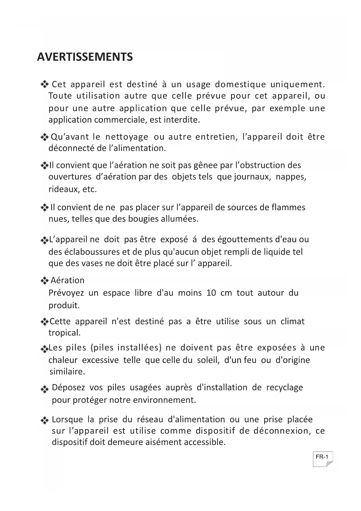 La plaque signalétique se trouve sous l’appareil. Symbole Ce marquage indique que l’équipement est conforme à la directive sur les équipements radioélectriques européens.Les lettres « CE » signifient que les produits vendus dans l'EEE ont été évalués pour répondre à des exigences élevées en matière de sécurité, de santé et de protection de l'environnement. Manipulation et utilisation des piles Les piles (non fournies) ne doivent être manipulées que par les adultes. Ne laissez jamais un enfant utiliser cet appareil sauf si le couvercle du compartiment des piles est solidement attaché à l'appareil. Cet appareil fonctionne avec deux piles AAA qui sont accessibles et peuvent être changées. Retirez le couvercle du compartiment des piles de l’appareil et retirez les piles. FR-2 Dans un environnement où il existe un champ d'immunité aux transitoires électriques rapides / en rafale, le produit peut présenter des dysfonctionnements qui nécessitent parfois une réinitialisation par l'utilisateur. Évitez de soumettre la batterie à une pression d'air extrêmement faible.