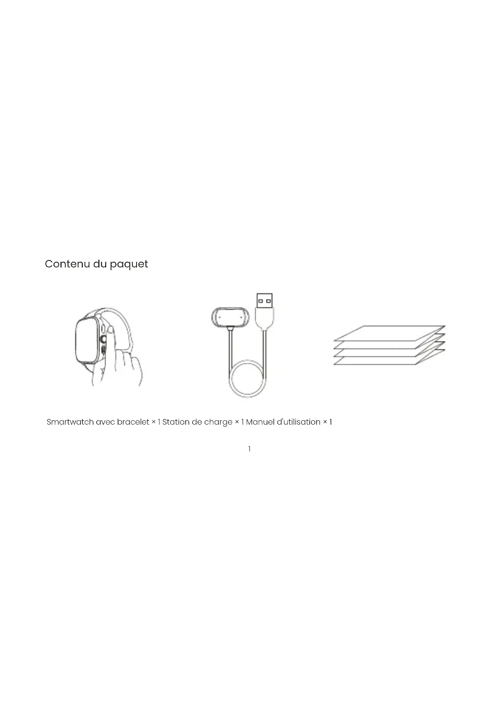 Manuel du produit1 Contenu du paquet Smartwatch avec bracelet × 1 Station de charge × 1 Manuel d'utilisation × 1À propos de la montre Remarque : Appuyez longuement sur le bouton d'alimentation pour mettre la montre en marche. Si la montre ne s'allume pas, veuillez la recharger et réessayer.