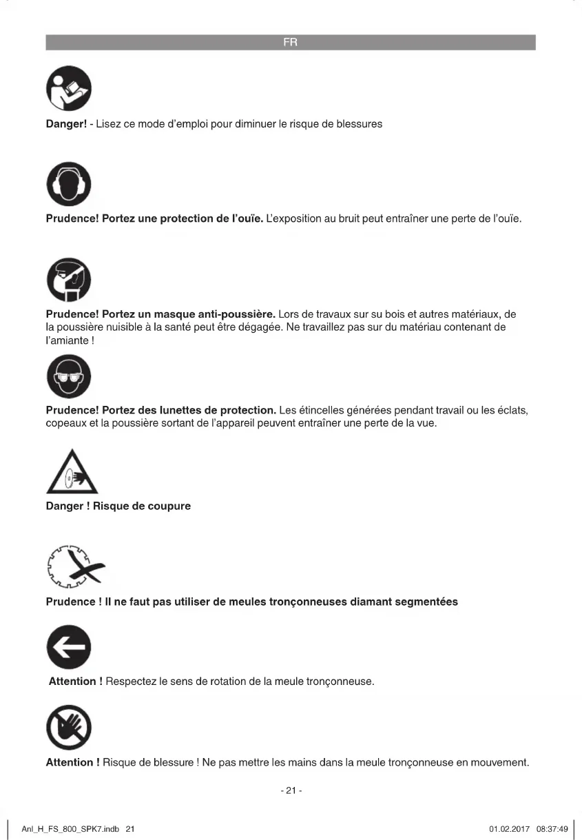Danger ! Risque de coupure Prudence ! Il ne faut pas utiliser de meules tronçonneuses diamant segmentées Danger! - Lisez ce mode d’emploi pour diminuer le risque de blessures Prudence! Portez une protection de l’ouïe. L’exposition au bruit peut entraîner une perte de l’ouïe. Prudence! Portez des lunettes de protection. Les étincelles générées pendant travail ou les éclats, copeaux et la poussière sortant de l’appareil peuvent entraîner une perte de la vue. Prudence! Portez un masque anti-poussière. Lors de travaux sur su bois et autres matériaux, de la poussière nuisible à la santé peut être dégagée. Ne travaillez pas sur du matériau contenant de l’amiante ! Attention ! Risque de blessure ! Ne pas mettre les mains dans la meule tronçonneuse en mouvement. Attention ! Respectez le sens de rotation de la meule tronçonneuse. Anl_H_FS_800_SPK7.indb 21Anl_H_FS_800_SPK7.indb 21 01.02.2017 08:37:4901.02.2017 08:37:49FR