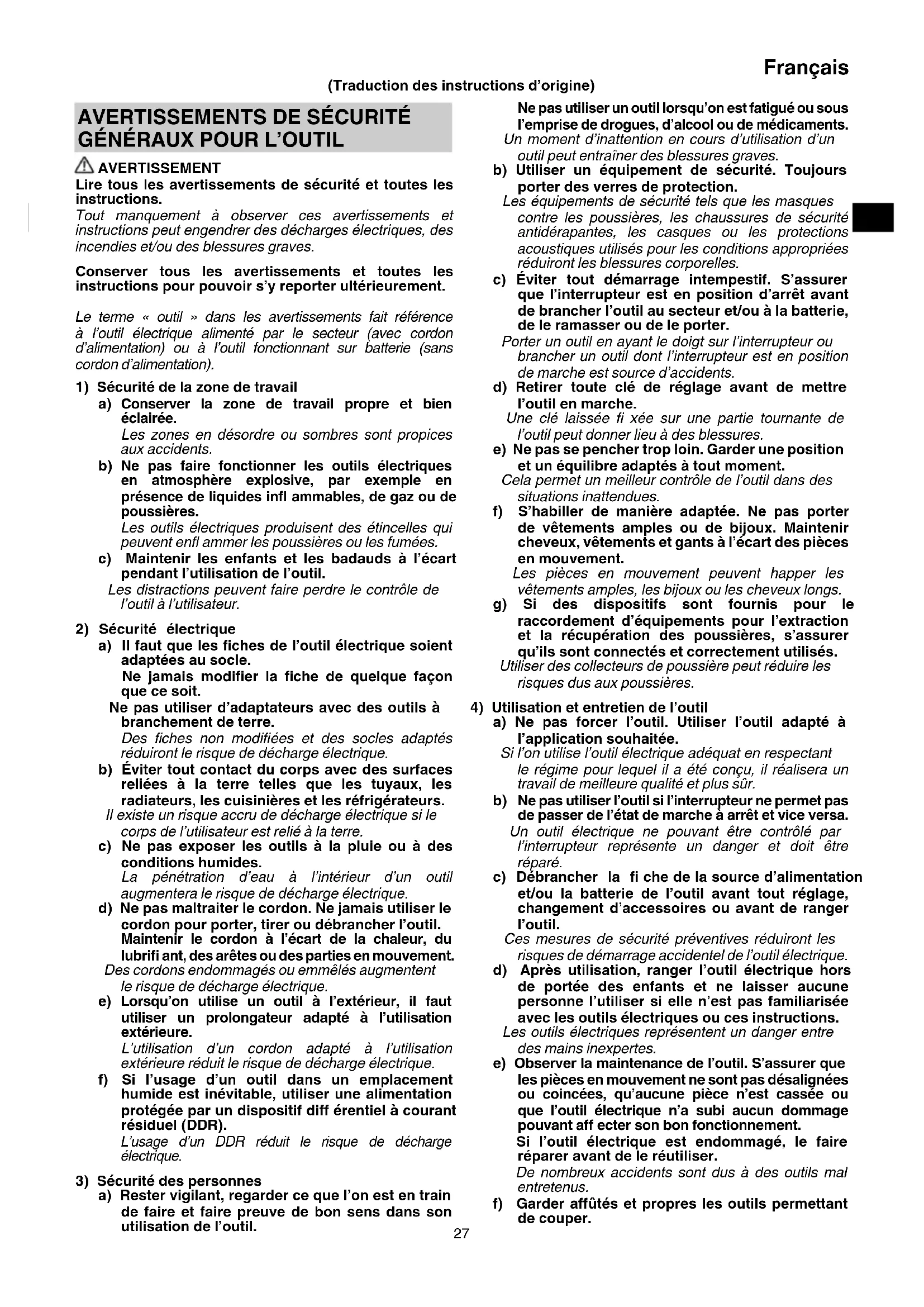 AVERTISSEMENT Lire tous les avertissements de sécurité et toutes les instructions. Tout manquement à observer ces avertissements et instructions peut engendrer des décharges électriques, des incendies et/ou des blessures graves. Conserver tous les avertissements et toutes les instructions pour pouvoir s’y reporter ultérieurement. Le terme « outil » dans les avertissements fait référence à l’outil électrique alimenté par le secteur (avec cordon d’alimentation) ou à l’outil fonctionnant sur batterie (sans cordon d’alimentation).