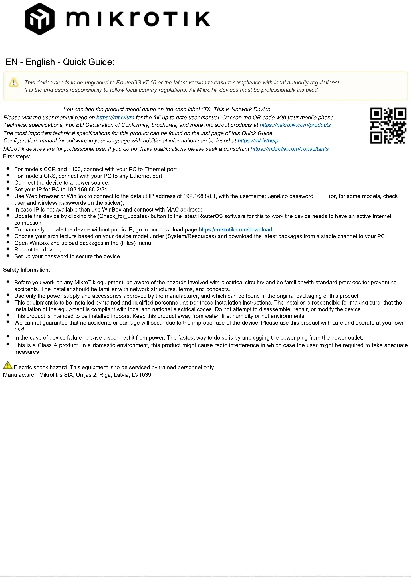 Vous pouvez trouver le nom du modèle du produit sur l'étiquette du boîtier (ID). Veuillez visiter la page du manuel d'utilisation sur pour le manuel d'utilisation complet et à jour.https://mt.lv/um-fr Ou scannez le code QR avec votre téléphone portable. Spécifications techniques, déclaration de conformité UE complète, brochures et plus d'informations sur les produits sur https://mikrotik.com /products Les spécifications techniques les plus importantes de ce produit se trouvent sur la dernière page de ce guide rapide. Vous trouverez le manuel de configuration du logiciel dans votre langue avec des informations supplémentaires sur https://mt.lv/help-fr Les appareils MikroTik sont destinés à un usage professionnel. Si vous n'avez pas de qualifications, veuillez consulter un consultant https://mikrotik.com /consultants Premiers pas: Pour les modèles CCR et 1100, connectez votre PC au port Ethernet 1; Pour les modèles CRS, connectez-vous avec votre PC à n'importe quel port Ethernet; Connectez l'appareil à une source d'alimentation; Réglez votre IP pour PC sur 192.168.88.2/24; Utilisez un navigateur Web ou WinBox pour vous connecter à l'adresse IP par défaut 192.168.88.1, avec le nom d'utilisateur: admin et pas de mot de passe (o u, pour certains modèles, vérifiez les mots de passe utilisateur et sans fil sur l'autocollant); Dans le cas où l'IP n'est pas disponible, utilisez WinBox et connectez-vous avec l'adresse MAC; Mettez à jour l'appareil en cliquant sur le bouton (Check_for_updates) du dernier logiciel RouterOS pour que cela fonctionne, l'appareil doit avoir une connexion Internet active; Pour mettre à jour manuellement l'appareil sans IP publique, accédez à notre page de téléchargement ;https://mikrotik.com/download Choisissez votre architecture en fonction de votre modèle d'appareil sous (System/Resources) et téléchargez les derniers packages à partir d'un canal stable sur votre PC; Ouvrez WinBox et téléchargez les packages dans le menu (Files); Redémarrez l'appareil; Configurez votre mot de passe pour sécuriser l'appareil. Information sur la sécurité: Tämä laite on päivitettävä RouterOS v7.10 -versioon tai uusimpaan versioon, jotta varmistetaan paikallisviranomaisten määräysten noudattaminen. Loppukäyttäjien vastuulla on noudattaa paikallisia maakohtaisia määräyksiä. Kaikki MikroTik-laitteet on asennettava ammattimaisesti. Cet appareil doit être mis à niveau vers RouterOS v7.10 ou la dernière version pour garantir la conformité aux réglementations des autorités locales. Il est de la responsabilité des utilisateurs finaux de suivre les réglementations locales du pays. Tous les appareils MikroTik doivent être installés par un professionnel.Avant de travailler sur un équipement MikroTik, soyez conscient des dangers liés aux circuits électriques et familiarisez-vous avec les pratiques standard de prévention des accidents.Le programme d'installation doit être familiarisé avec les structures, les termes et les concepts du réseau. Utilisez uniquement l'alimentation et les accessoires approuvés par le fabricant et qui se trouvent dans l'emballage d'origine de ce produit. Cet équipement doit être installé par du personnel formé et qualifié, conformément à ces instructions d'installation.L'installateur est responsable de s'assurer que l'installation de l'équipement est conforme aux codes électriques locaux et nationaux. N'essayez pas de démonter, réparer ou modifier l'appareil. Ce produit est destiné à être installé à l'intérieur.Gardez ce produit loin de l'eau, du feu, de l'humidité ou des environnements chauds. Nous ne pouvons garantir qu'aucun accident ou dommage ne se produira en raison d'une mauvaise utilisation de l'appareil.Veuillez utiliser ce produit avec soin et l'utiliser à vos propres risques! En cas de panne de l'appareil, veuillez le déconnecter de l'alimentation.La façon la plus rapide de le faire est de débrancher la fiche d'alimentation de la prise de courant. Ceci est un produit de classe A.Dans un environnement domestique, ce produit peut provoquer des interférences radio, auquel cas l'utilisateur peut être amené à prendre des mesures adéquates Risque de choc électrique. Cet équipement doit être entretenu uniquement par du personnel qualifié Fabricant: Mikrotikls SIA, Unijas 2, Riga, Lettonie, LV1039. HR - Hrvatski. Brzi vodič: .Ovo je mrežni uređaj