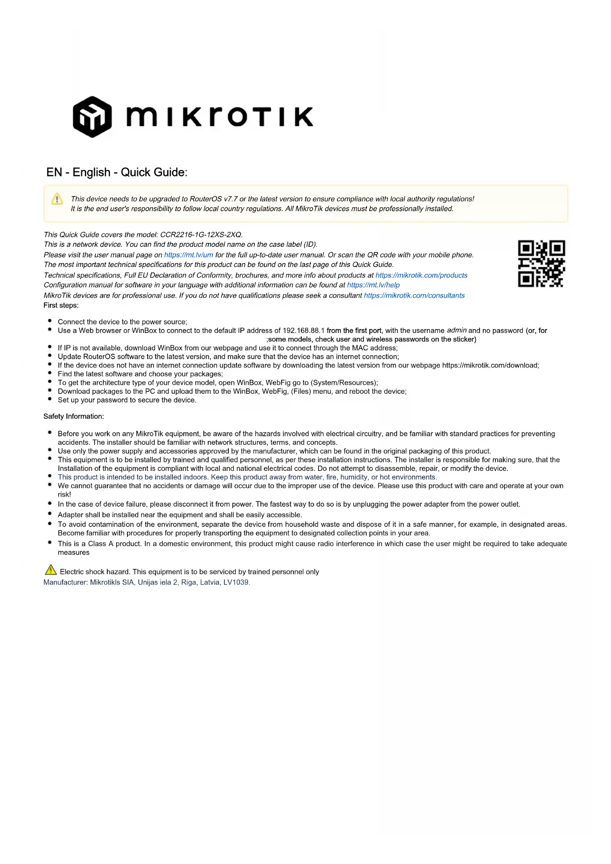 Ceci est un périphérique réseau. Vous pouvez trouver le nom du modèle du produit sur l'étiquette du boîtier (ID). Veuillez visiter la page du manuel d'utilisation sur pour le manuel d'utilisation complet et à jour.https://mt.lv/um-fr Ou scannez le code QR avec votre téléphone portable. Les spécifications techniques les plus importantes de ce produit se trouvent sur la dernière page de ce guide rapide. Spécifications techniques, déclaration de conformité UE complète, brochures et plus d'informations sur les produits sur https://mikrotik.com /products Vous trouverez le manuel de configuration du logiciel dans votre langue avec des informations supplémentaires sur https://mt.lv/help-fr Les appareils MikroTik sont destinés à un usage professionnel. Si vous n'avez pas de qualifications, veuillez consulter un consultant https://mikrotik.com /consultants Premiers pas: Connectez l'appareil à la source d'alimentation; Utilisez un navigateur Web ou WinBox pour vous connecter à l'adresse IP par défaut 192.168.88.1 à partir de quel port-1, avec le nom d'utilisateur et admin