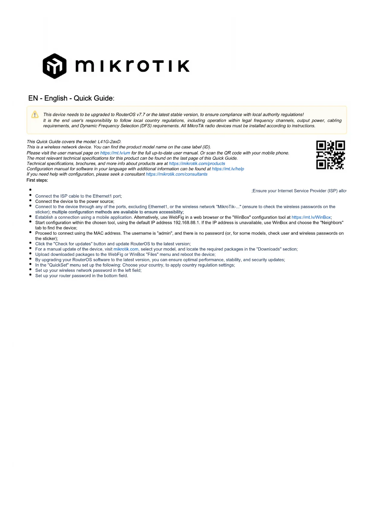 Il s'agit d'un périphérique réseau sans fil. Vous pouvez trouver le nom du modèle du produit sur l'étiquette du boîtier (ID). Veuillez visiter la page du manuel d'utilisation sur pour le manuel d'utilisation complet et à jour.https://mt.lv/um-fr Ou scannez le code QR avec votre téléphone portable. Les spécifications techniques les plus importantes de ce produit se trouvent sur la dernière page de ce guide rapide. Spécifications techniques, brochures et plus d'informations sur les produits surhttps://mikrotik.com/products Vous trouverez le manuel de configuration du logiciel dans votre langue avec des informations supplémentaires sur https://mt.lv/help-fr Si vous avez besoin d'aide pour la configuration, veuillez consulter un consultant https://mikrotik.com/consultants Premiers pas: Assurez-vous que votre fournisseur de services Internet autorise les modifications matérielles et attribue automatiquement une adresse IP; Connectez le câble de votre fournisseur de services Internet au port Ethernet1; Connectez l'appareil à la source d'alimentation; Connectez-vous à l'appareil via l'un des ports, à l'exclusion d'Ethernet1, ou du réseau sans fil "MikroTik-..." (assurez-vous de vérifier les mots de passe sans fil sur l'autocollant); Établir une connexion à l'aide d'une application mobile. Vous pouvez également utiliser WebFig dans un navigateur Web ou l'outil de configuration "WinBox" à l'adresse ;https://mt.lv/WinBox plusieurs méthodes de configuration sont disponibles pour garantir l’accessibilité; Démarrez la configuration dans l'outil choisi en utilisant l'adresse IP par défaut 192.168.88.1. Si l'adresse IP n'est pas disponible, utilisez WinBox et choisissez l'onglet "Neighbors" pour trouver le périphérique; Procédez à la connexion en utilisant l'adresse MAC. Le nom d'utilisateur est "admin", et il n'y a pas de mot de passe (ou, pour certains modèles, vérifiez les mots de passe utilisateur et sans fil sur l'autocollant); Cliquez sur le bouton "Check for updates" et mettez à jour RouterOS vers la dernière version; Pour une mise à jour manuelle de l'appareil, rendez-vous sur , sélectionnez votre modèle et localisez les paquets requis dans la section mikrotik.com "Downloads"; Téléchargez les paquets téléchargés dans le menu "Files" de WebFig ou WinBox et redémarrez l'appareil; En mettant à jour votre logiciel RouterOS vers la dernière version, vous pouvez garantir des performances optimales, une stabilité et des mises à jour de sécurité; Dans le menu "QuickSet", configurez ce qui suit : Choisissez votre pays pour appliquer les paramètres de régulation du pays; Configurez le mot de passe de votre réseau sans fil dans le champ de gauche; Configurez le mot de passe de votre routeur dans le champ inférieur. Information sur la sécurité: Avant de travailler sur un équipement MikroTik, soyez conscient des dangers liés aux circuits électriques et familiarisez-vous avec les pratiques standard de prévention des accidents. L'installateur doit être familier avec les structures, les termes et les concepts du réseau. Utilisez uniquement le bloc d'alimentation et les accessoires approuvés par le fabricant, qui se trouvent dans l'emballage d'origine de ce produit. Cet équipement doit être installé par du personnel formé et qualifié, conformément à ces instructions d'installation. L'installateur est responsable de s'assurer que l'installation de l'équipement est conforme aux codes électriques locaux et nationaux. N'essayez pas de démonter, réparer ou modifier l'appareil. Ce produit est destiné à être installé à l'intérieur. Gardez ce produit à l'écart de l'eau, du feu, de l'humidité ou des environnements chauds. Nous ne pouvons garantir qu'aucun accident ou dommage ne surviendra en raison d'une mauvaise utilisation de l'appareil. Veuillez utiliser ce produit avec précaution et le faire fonctionner à vos propres risques ! En cas de panne de l'appareil, veuillez le débrancher de l'alimentation. Le moyen le plus rapide de le faire est de débrancher l’adaptateur secteur de la prise de courant. L'adaptateur doit être installé à proximité de l'équipement et doit être facilement accessible. cet équipement MikroTik est conforme aux limites d'exposition aux rayonnements Union européenne établies pourExposition aux rayonnements radiofréquences: un environnement non contrôlé. Cet appareil MikroTik doit être installé et utilisé à au moins20 centimètres de votre corps, de l'utilisateur professionnel ou du grand public. Fabricant: Mikrotikls SIA, Unijas 2, Riga, Lettonie, LV1039. HR - Hrvatski. Brzi vodič: Cet appareil doit être mis à niveau vers RouterOS v7.7 ou la dernière version stable, pour garantir la conformité aux réglementations des autorités locales! Il est de la responsabilité des utilisateurs finaux de suivre les réglementations locales du pays, y compris le fonctionnement dans les canaux de fréquence légaux, la puissance de sortie, les exigences de câblage et les exigences de sélection dynamique de fréquence (DFS). Tous les appareils radio MikroTik doivent être installés conformément aux instructions. Ovaj uređaj treba nadograditi na RouterOS v7.7 ili najnoviju stabilnu verziju, kako bi se osigurala sukladnost s lokalnim propisima! Krajnji su korisnici dužni slijediti lokalne propise, uključujući rad unutar legalnih frekvencijskih kanala, izlaznu snagu, zahtjeve za kabliranje i zahtjeve za dinamičkim odabirom frekvencije (DFS). Svi MikroTik radio uređaji moraju biti instalirani prema uputama.Ovaj kratki vodič pokriva model: L41G-2axD.