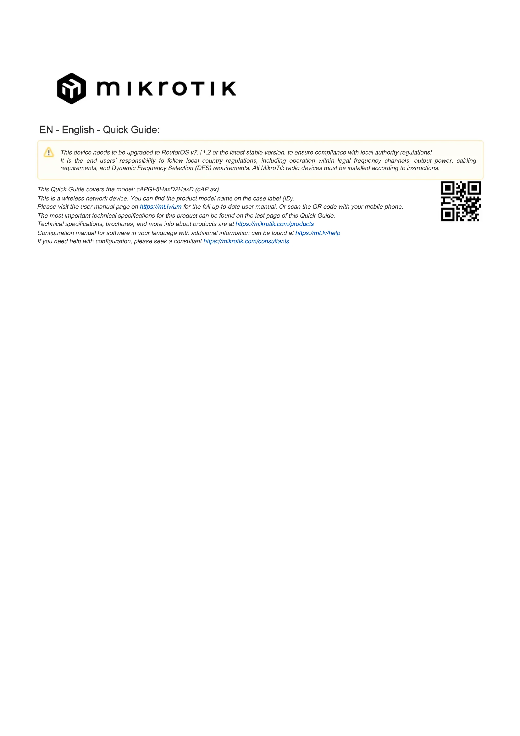 Il s'agit d'un périphérique réseau sans fil. Vous pouvez trouver le nom du modèle du produit sur l'étiquette du boîtier (ID). Veuillez visiter la page du manuel d'utilisation sur pour le manuel d'utilisation complet et à jour.https://mt.lv/um-fr Ou scannez le code QR avec votre téléphone portable. Les spécifications techniques les plus importantes de ce produit se trouvent sur la dernière page de ce guide rapide. Spécifications techniques, brochures et plus d'informations sur les produits surhttps://mikrotik.com/products Vous trouverez le manuel de configuration du logiciel dans votre langue avec des informations supplémentaires sur https://mt.lv/help-fr Si vous avez besoin d'aide pour la configuration, veuillez consulter un consultanthttps://mikrotik.com/consultants Premiers pas: Assurez-vous que votre fournisseur de services Internet autorise le changement de matériel et émettra une adresse IP automatique; Connectez l'appareil à l'injecteur PoE inclus avec un câble Ethernet à l' extrémité ; "data+power" Connectez l'extrémité de données de l'injecteur PoE à l'ordinateur; Connectez l'adaptateur secteur à l'injecteur PoE; Ouvrez les connexions réseau sur votre PC et recherchez le réseau sans fil - connectez-vous à celui-ci;"MikroTik-..." La configuration doit être effectuée via le réseau sans fil à l'aide d'un navigateur Web ou d'une application mobile. Alternativement, vous pouvez utiliser un outil de configuration WinBox ; https://mt.lv/WinBox plusieurs méthodes de configuration sont disponibles pour garantir l’accessibilité; Démarrez la configuration dans l'outil choisi en utilisant l'adresse IP par défaut 192.168.88.1. Si l'adresse IP n'est pas disponible, utilisez WinBox et choisissez l'onglet "Neighbors" pour trouver le périphérique; Procédez à la connexion en utilisant l'adresse MAC. Le nom d'utilisateur est "admin", et il n'y a pas de mot de passe (ou, pour certains modèles, vérifiez les mots de passe utilisateur et sans fil sur l'autocollant); Cliquez sur le bouton "Check for updates" et mettez à jour RouterOS vers la dernière version; Pour une mise à jour manuelle de l'appareil, visitez la page des produits sur pour trouver votre produit. Les paquets nécessaires https://mikrotik.com/products sont accessibles dans le menu "Support&Downloads"; Téléchargez les paquets téléchargés dans le menu "Files" de WebFig ou WinBox et redémarrez l'appareil; En mettant à jour votre logiciel RouterOS vers la dernière version, vous pouvez garantir des performances optimales, une stabilité et des mises à jour de sécurité; Dans le menu "QuickSet", configurez ce qui suit : Choisissez votre pays pour appliquer les paramètres de régulation du pays; Configurez le mot de passe de votre réseau sans fil dans le champ de gauche; Configurez le mot de passe de votre routeur dans le champ inférieur. Information sur la sécurité: Avant de travailler sur un équipement MikroTik, soyez conscient des dangers liés aux circuits électriques et familiarisez-vous avec les pratiques standard de prévention des accidents. Le programme d'installation doit être familiarisé avec les structures, les termes et les concepts du réseau. Utilisez uniquement l'alimentation et les accessoires approuvés par le fabricant et qui se trouvent dans l'emballage d'origine de ce produit. Cet équipement doit être installé par du personnel formé et qualifié, conformément à ces instructions d'installation. L'installateur est responsable de s'assurer que l'installation de l'équipement est conforme aux codes électriques locaux et nationaux. N'essayez pas de démonter, réparer ou modifier l'appareil. Ce produit est destiné à être installé à l'intérieur. Gardez ce produit loin de l'eau, du feu, de l'humidité ou des environnements chauds. Nous ne pouvons garantir qu'aucun accident ou dommage ne se produira en raison d'une mauvaise utilisation de l'appareil. Veuillez utiliser ce produit avec soin et l'utiliser à vos propres risques! La prise de courant doit être installée à proximité de l'équipement et doit être facilement accessible. En cas de panne de l'appareil, veuillez le déconnecter de l'alimentation. La façon la plus rapide de le faire est de débrancher l'adaptateur secteur de la prise de courant. Pour éviter la contamination de l'environnement, séparez l'appareil des déchets ménagers et éliminez-le de manière sûre, par exemple dans des zones désignées. Familiarisez-vous avec les procédures pour transporter correctement l'équipement vers les points de collecte désignés dans votre région. cet équipement MikroTik est conforme aux limites d'exposition aux rayonnements Union européenne établies pourExposition aux rayonnements radiofréquences: un environnement non contrôlé. Cet appareil MikroTik doit être installé et utilisé à au moins 30 centimètres de votre corps, de l'utilisateur professionnel ou du grand public. Fabricant: Mikrotikls SIA, Unijas 2, Riga, Lettonie, LV1039. HR - Hrvatski. Brzi vodič: Cet appareil doit être mis à niveau vers RouterOS v7.11.2 ou la dernière version stable, pour garantir la conformité aux réglementations des autorités locales! Il est de la responsabilité des utilisateurs finaux de suivre les réglementations locales du pays, y compris le fonctionnement dans les canaux de fréquence légaux, la puissance de sortie, les exigences de câblage et les exigences de sélection dynamique de fréquence (DFS). Tous les appareils radio MikroTik doivent être installés conformément aux instructions.Ovaj kratki vodič pokriva model: cAPGi-5HaxD2HaxD (cAP ax).