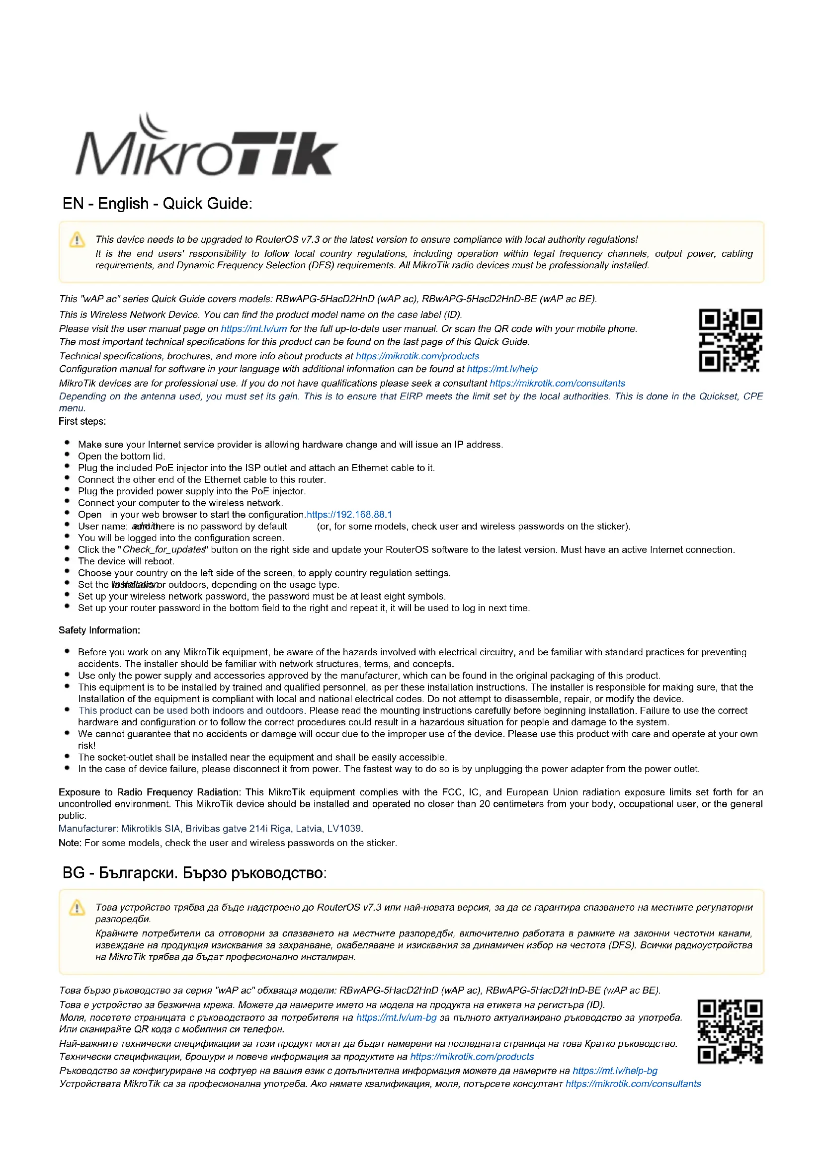 les exigences d'alimentation, de câblage et de sélection dynamique de fréquence (DFS). Tous les appareils radio MikroTik doivent êtreinstallé professionnellement.Veuillez visiter la page du manuel d'utilisation sur pour le manuel d'utilisation complet et à jour.https://mt.lv/um-fr Ou scannez le code QR avec votre téléphone portable. Les spécifications techniques les plus importantes de ce produit se trouvent sur la dernière page de ce guide rapide. Spécifications techniques, brochures et plus d'informations sur les produits surhttps://mikrotik.com/products Vous trouverez le manuel de configuration du logiciel dans votre langue avec des informations supplémentaires sur https://mt.lv/help-fr Les appareils MikroTik sont destinés à un usage professionnel. Si vous n'avez pas de qualifications, veuillez consulter un consultant https://mikrotik.com/consultants Selon l'antenne utilisée, vous devez régler son gain. Il s'agit de s'assurer que l'EIRP respecte la limite fixée par les autorités locales. Cela se fait dans le menu Quickset, CPE. Premiers pas: Assurez-vous que votre fournisseur de services Internet autorise le changement de matériel et émettra une adresse IP. Ouvrez le couvercle inférieur. Branchez l'injecteur PoE inclus dans la prise ISP et branchez-y un câble Ethernet. Connectez l'autre extrémité du câble Ethernet à ce routeur. Branchez l'alimentation fournie dans l'injecteur PoE. Connectez votre ordinateur au réseau sans fil. Ouvrez dans votre navigateur Web pour démarrer la configuration.https://192.168.88.1 Nom d'utilisateur: et il n'y a pas de mot de passe par défaut. admin Vous serez connecté à l'écran de configuration. Cliquez sur le bouton " " sur le côté droit et mettez à jour votre logiciel RouterOS vers la dernière version. Check_for_updates Doit avoir une connexion Internet active. L'appareil va redémarrer. Choisissez votre pays sur le côté gauche de l'écran pour appliquer les paramètres de réglementation du pays. Réglez l'installation sur intérieur ou extérieur, selon le type d'utilisation; Configurez votre mot de passe de réseau sans fil, le mot de passe doit être composé d'au moins huit symboles. Configurez le mot de passe de votre routeur dans le champ en bas à droite et répétez-le, il sera utilisé pour vous connecter la prochaine fois. Information sur la sécurité: Avant de travailler sur un équipement MikroTik, soyez conscient des dangers liés aux circuits électriques et familiarisez-vous avec les pratiques standard de prévention des accidents.Le programme d'installation doit être familiarisé avec les structures, les termes et les concepts du réseau. Utilisez uniquement l'alimentation et les accessoires approuvés par le fabricant et qui se trouvent dans l'emballage d'origine de ce produit. Cet équipement doit être installé par du personnel formé et qualifié, conformément à ces instructions d'installation.L'installateur est responsable de s'assurer que l'installation de l'équipement est conforme aux codes électriques locaux et nationaux.N'essayez pas de démonter, réparer ou modifier l'appareil. Ce produit peut être installé à l'extérieur.Veuillez lire attentivement les instructions de montage avant de commencer l'installation.Le fait de ne pas utiliser lem atériel et la configuration corrects ou de ne pas suivre les procédures correctes peut entraîner une situation dangereuse pour les personnes et endommager le .système Nous ne pouvons garantir qu'aucun accident ou dommage ne se produira en raison d'une mauvaise utilisation de l'appareil.Veuillez utiliser ce produit avec soin et l'utiliser à vos propres risques! La prise de courant doit être installée à proximité de l'équipement et doit être facilement accessible. En cas de panne de l'appareil, veuillez le déconnecter de l'alimentation.La façon la plus rapide de le faire est de débrancher l'adaptateur secteur de la prise de courant. cet équipement MikroTik est conforme aux limites d'exposition aux rayonnements FCC, IC et Union européenneExposition aux rayonnements radiofréquences: établies pour un environnement non contrôlé. Cet appareil MikroTik doit être installé et utilisé à au moins 20 centimètres de votre corps, de l'utilisateur professionnel ou du grand public. Fabricant: Mikrotikls SIA, Brivibas gatve 214i Riga, Lettonie, LV1039. Pour certains modèles, vérifiez les mots de passe utilisateur et sans fil sur l'autocollant.Noter: HR - Hrvatski. Brzi vodič: Ovaj "wAP ac" serija Brzi vodič obuhvaća modele: RBwAPG-5HacD2HnD (wAP ac), RBwAPG-5HacD2HnD-BE (wAP ac BE).