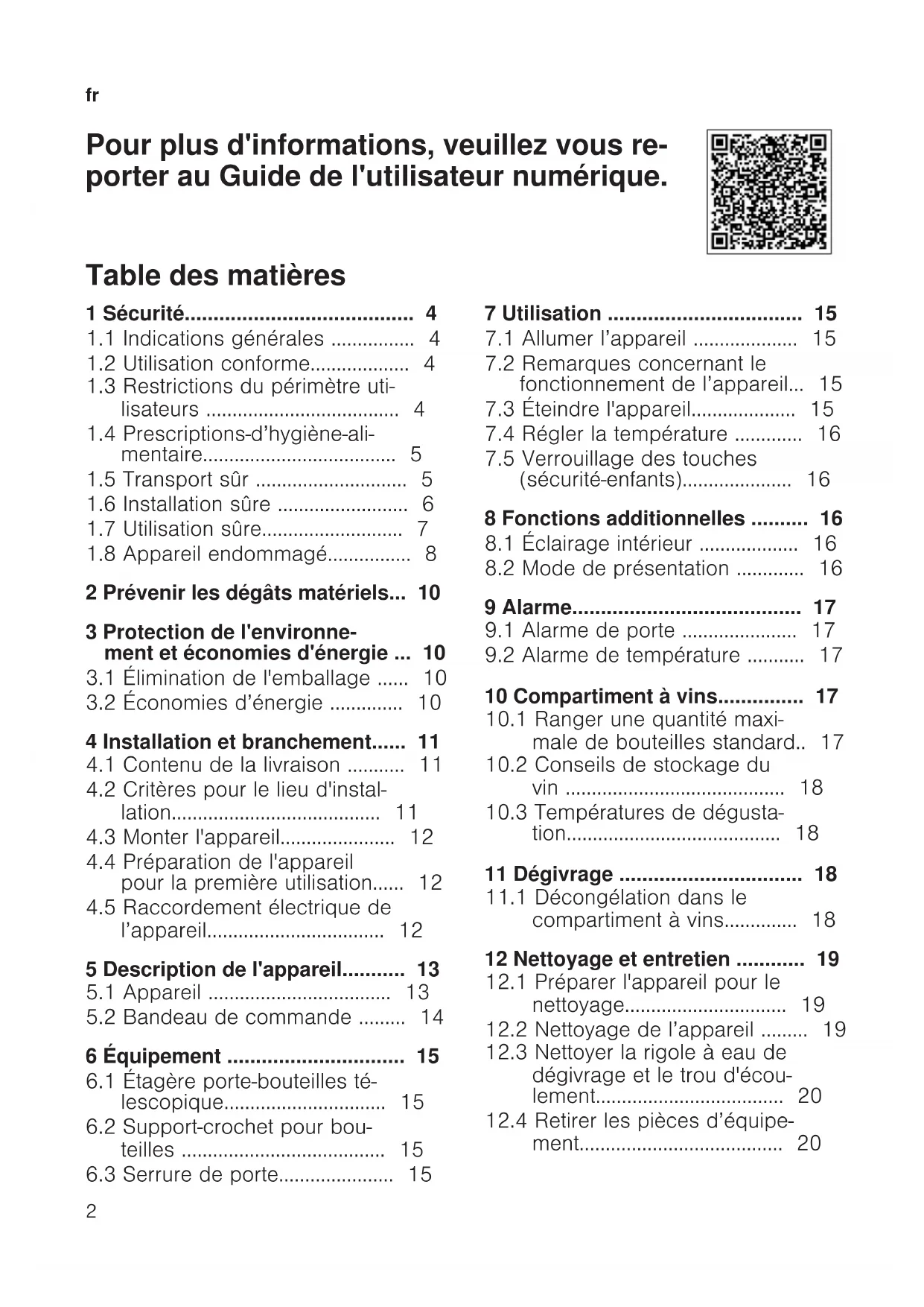 1 Sécurité Respectez les consignes de sécurité suivantes. 1.1 Indications générales ¡ Lisez attentivement cette notice. ¡ Conservez la notice ainsi que les informations produit en vue d’une réutilisation ultérieure ou pour un futur nouveau proprié- taire. ¡ Ne branchez pas l’appareil si ce dernier a été endommagé du- rant le transport. 1.2 Utilisation conforme Utilisez l‘appareil uniquement: ¡ pour stocker du vin. ¡ pour un usage privé et dans les pièces fermées d’un domicile. ¡ jusqu'à une altitude maximale de 1200m au-dessus du niveau de la mer. 1.3 Restrictions du périmètre utilisateurs Les enfants de 8 ans et plus, les personnes souffrant d’un handi- cap physique, sensoriel ou mental ou ne détenant pas l’expé- rience et/ou les connaissances nécessaires pourront utiliser cet appareil à condition de le faire sous surveillance, ou que son utili- sation sûre leur ait été enseignée et qu’ils aient compris les dan- gers qui en émanent. Les enfants ne sont pas autorisés à jouer avec l'appareil. Le nettoyage de l’appareil, et l’entretien par l’utilisateur, sont des activités que les enfants ne peuvent pas effectuer sans sur- veillance. Les enfants à partir de 3 ans et ceux âgés de moins de 8 ans peuvent charger et décharger l'appareil de réfrigération/congéla- tion.Sécurité fr
