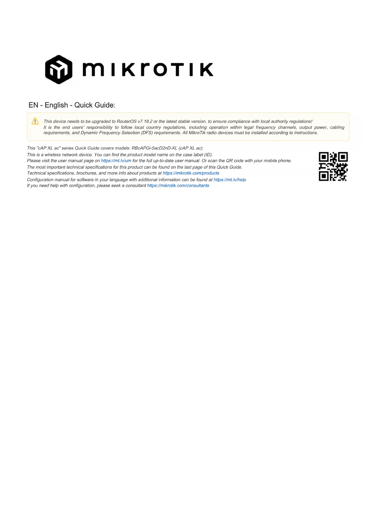 Il s'agit d'un périphérique réseau sans fil. Vous pouvez trouver le nom du modèle du produit sur l'étiquette du boîtier (ID). Veuillez visiter la page du manuel d'utilisation sur pour le manuel d'utilisation complet et à jour.https://mt.lv/um-fr Ou scannez le code QR avec votre téléphone portable. Les spécifications techniques les plus importantes de ce produit se trouvent sur la dernière page de ce guide rapide. Spécifications techniques, brochures et plus d'informations sur les produits surhttps://mikrotik.com/products Vous trouverez le manuel de configuration du logiciel dans votre langue avec des informations supplémentaires sur https://mt.lv/help-fr Si vous avez besoin d'aide pour la configuration, veuillez consulter un consultanthttps://mikrotik.com/consultants Premiers pas: Cet appareil doit être mis à niveau vers RouterOS v7.18.2 ou la dernière version stable, pour garantir la conformité aux réglementations des autorités locales! Il est de la responsabilité des utilisateurs finaux de suivre les réglementations locales du pays, y compris le fonctionnement dans les canaux de fréquence légaux, la puissance de sortie, les exigences de câblage et les exigences de sélection dynamique de fréquence (DFS). Tous les appareils radio MikroTik doivent être installés conformément aux instructions.Assurez-vous que votre fournisseur de services Internet autorise le changement de matériel et émettra une adresse IP automatique; Connectez l'appareil à la source d'alimentation; Ouvrez les connexions réseau sur votre PC et recherchez le réseau sans fil - connectez-vous à celui-ci;"MikroTik-..." La configuration doit être effectuée via le réseau sans fil à l'aide d'un navigateur Web ou d'une application mobile. Alternativement, vous pouvez utiliser un outil de configuration WinBox ;https://mt.lv/winbox Démarrez la configuration dans l'outil choisi en utilisant l'adresse IP par défaut 192.168.88.1. Si l'adresse IP n'est pas disponible, utilisez Winbox et choisissez l'onglet "Neighbors" pour trouver le périphérique; Procédez à la connexion en utilisant l'adresse MAC. Le nom d'utilisateur est "admin", et il n'y a pas de mot de passe (ou, pour certains modèles, vérifiez les mots de passe utilisateur et sans fil sur l'autocollant); Cliquez sur le bouton "Check for updates" et mettez à jour RouterOS vers la dernière version; Pour une mise à jour manuelle de l'appareil, visitez la page des produits sur pour trouver votre produit. Les paquets nécessaires https://mikrotik.com/products sont accessibles dans le menu "Support&Downloads"; Téléchargez les paquets téléchargés dans le menu "Files" de WebFig ou Winbox et redémarrez l'appareil; En mettant à jour votre logiciel RouterOS vers la dernière version, vous pouvez garantir des performances optimales, une stabilité et des mises à jour de sécurité; Dans le menu "QuickSet", configurez ce qui suit : Choisissez votre pays pour appliquer les paramètres de régulation du pays; Configurez le mot de passe de votre réseau sans fil dans le champ de gauche; Configurez le mot de passe de votre routeur dans le champ inférieur. Information sur la sécurité: Avant de travailler sur un équipement MikroTik, soyez conscient des dangers liés aux circuits électriques et familiarisez-vous avec les pratiques standard de prévention des accidents. Le programme d'installation doit être familiarisé avec les structures, les termes et les concepts du réseau. Utilisez uniquement l'alimentation et les accessoires approuvés par le fabricant et qui se trouvent dans l'emballage d'origine de ce produit. Cet équipement doit être installé par du personnel formé et qualifié, conformément à ces instructions d'installation. L'installateur est responsable de s'assurer que l'installation de l'équipement est conforme aux codes électriques locaux et nationaux. N'essayez pas de démonter, réparer ou modifier l'appareil. Ce produit est destiné à être installé à l'intérieur. Gardez ce produit loin de l'eau, du feu, de l'humidité ou des environnements chauds. Nous ne pouvons garantir qu'aucun accident ou dommage ne se produira en raison d'une mauvaise utilisation de l'appareil. Veuillez utiliser ce produit avec soin et l'utiliser à vos propres risques! La prise de courant doit être installée à proximité de l'équipement et doit être facilement accessible. En cas de panne de l'appareil, veuillez le déconnecter de l'alimentation. La façon la plus rapide de le faire est de débrancher l'adaptateur secteur de la prise de courant. Pour éviter la contamination de l'environnement, séparez l'appareil des déchets ménagers et éliminez-le de manière sûre, par exemple dans des zones désignées. Familiarisez-vous avec les procédures pour transporter correctement l'équipement vers les points de collecte désignés dans votre région. cet équipement MikroTik est conforme aux limites d'exposition aux rayonnements FCC, IC et Union européenneExposition aux rayonnements radiofréquences: établies pour un environnement non contrôlé. Cet appareil MikroTik doit être installé et utilisé à au moins 20 centimètres de votre corps, de l'utilisateur professionnel ou du grand public. Fabricant: Mikrotikls SIA, Unijas iela 2, Riga, Lettonie, LV1039. Pour certains modèles, vérifiez les mots de passe utilisateur et sans fil sur l'autocollant.Noter: HR - Hrvatski. Brzi vodič: Ovaj kratki vodič serije "cAP XL ac" obuhvaća modele:RBcAPGi-5acD2nD-XL (cAP XL ac).